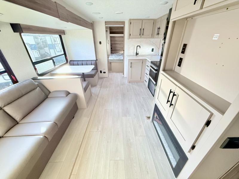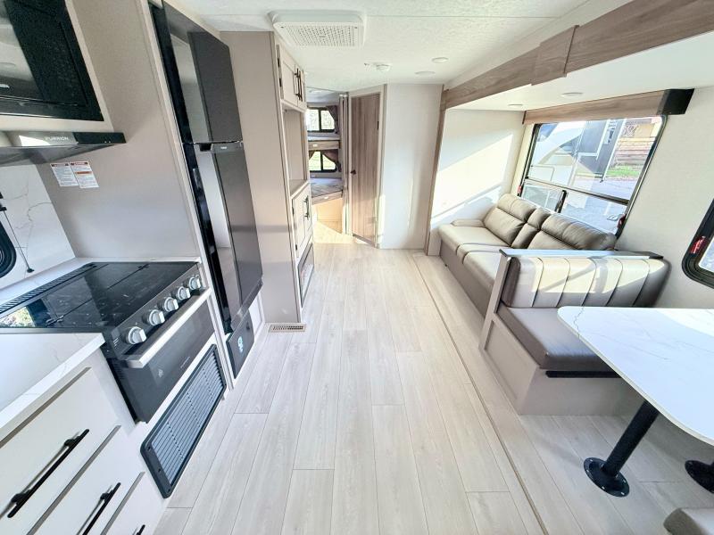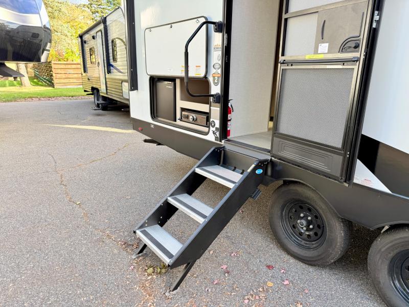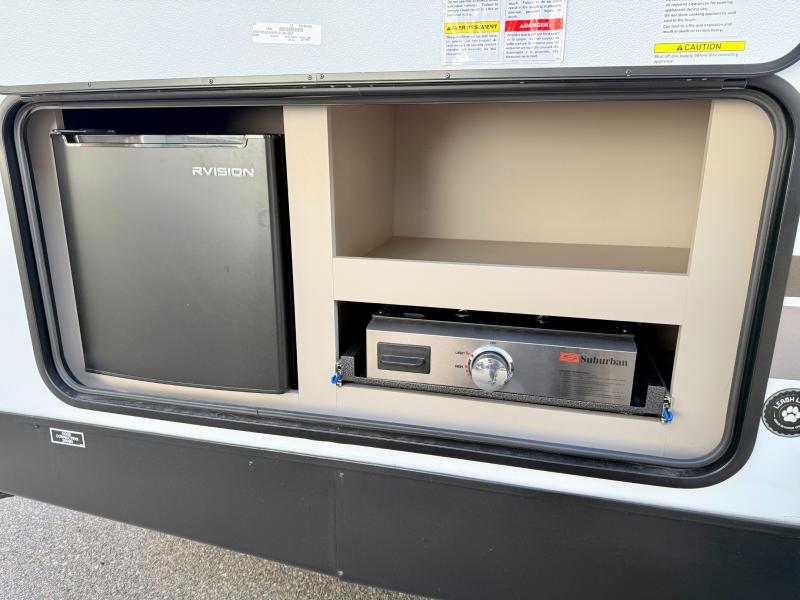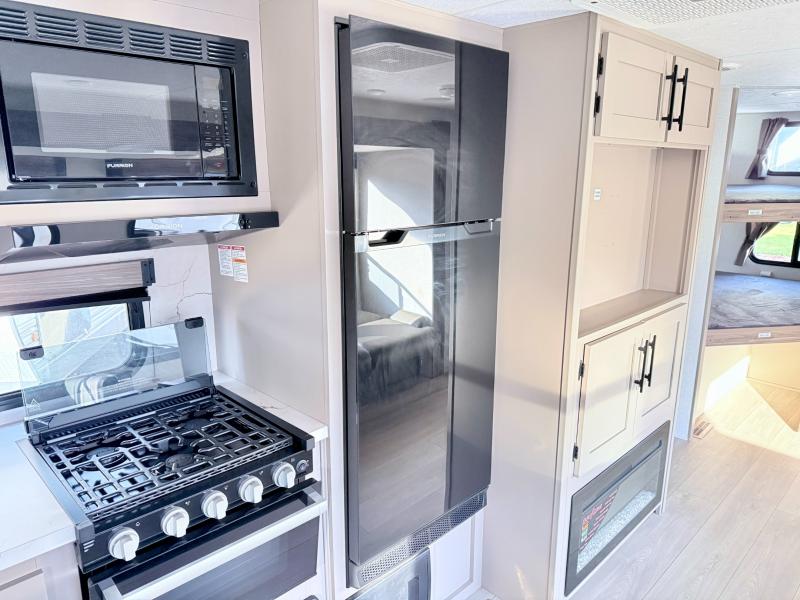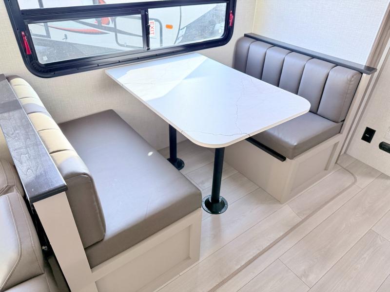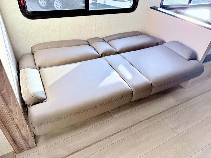 Headed to the RV park with your family and friends? Want enough space to allow overnight guests to stay the night on occasion? This trailer gives you double-size bunks, a 70" sofa and a booth dinette that offer extra sleeping space while you enjoy your own walk-around queen bed in the front private bedroom. You will also have dual wardrobes, and a TV mount to add your own TV. Everyone will stay refreshed and cleaned using the rear corner full bathroom, and fed by the cook that has an inside kitchen with full amenities including an L-shaped counter and a large sink. There is also a walk-in pantry with coat hooks next to the entry to utilize as a multi-purpose closet. And there is an outside kitchen with a griddle and a refrigerator, a 20' power awning with an LED light strip, and a pass-through storage for the larger camping items.