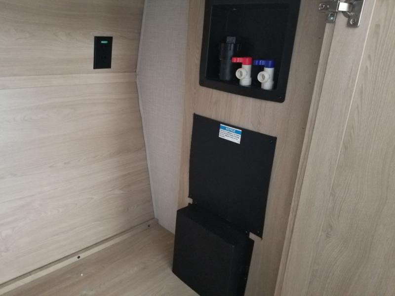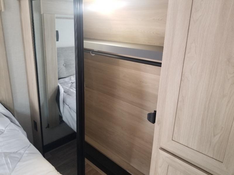When you want to get away from it all, hitch up this spacious fifth wheel and head out! Once you arrive at the campground, you can make lunch in the rear kitchen that includes ample counter space, a 21" oven and 30" microwave, plus a pantry and French door refrigerator for food storage. Your crew can relax at the L-dinette with an EZ adjust table or on the theater seating across from the fireplace and Smart LED TV. And if you're needing additional sleeping space, just choose the optional hide-a-bed sofa in place of the theater seating! The dual entry bath features a spacious 42" x 30" residential shower, convenient towel hooks and a large slide out that is shared with the front master bedroom. You'll sleep soundly on the king bed here, and you can keep your things organized in the dresser and front closet. There is also washer and dryer prep if you want to add those appliances!