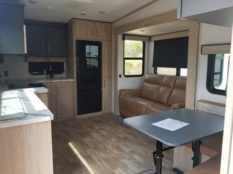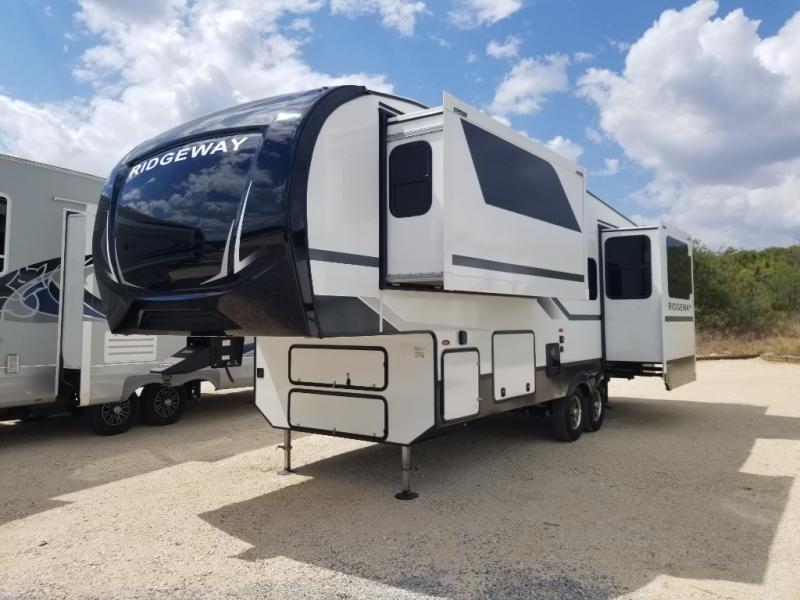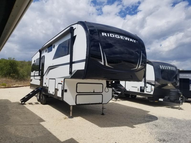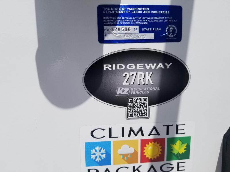 When you choose a Ridgeway fifth wheel by KZ you are choosing a modern design, convenient features, and comfort at every turn! These units have been constructed with some of the most durable materials in the industry, including Azdel composite panels and Tufflex roofing material. The exterior includes a full painted front cap, a fully-finished, heated and sealed basement storage compartment, and a deluxe heated water convenience center to easily monitor your units water levels. There is also 4-point auto electric leveling, Keyed-Alike for baggage and entry doors, a 2" towing receiver hitch, and many more stand-out exterior features. Once inside, you'll enjoy the ceiling crown molding, 5" gold cabinet hardware, deluxe residential-style furniture, and all-wood lumber core screwed cabinets with hardwood doors. The comforts continue on in the bathroom and bedroom with a shower skylight and built-in seat, large linen closets, a luxurious bedspread, and XL under-bed storage for luggage, extra blankets and more!