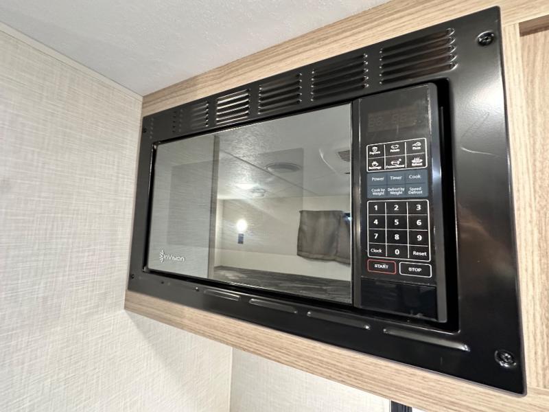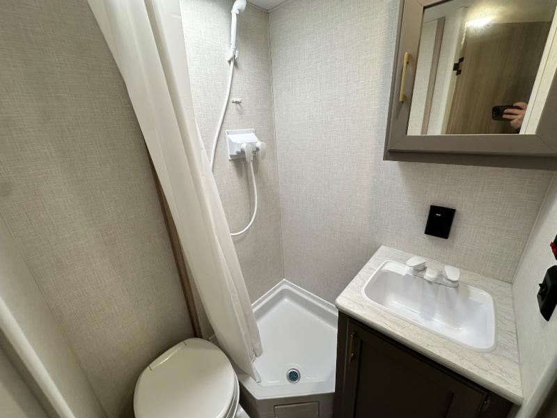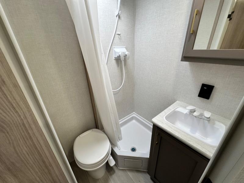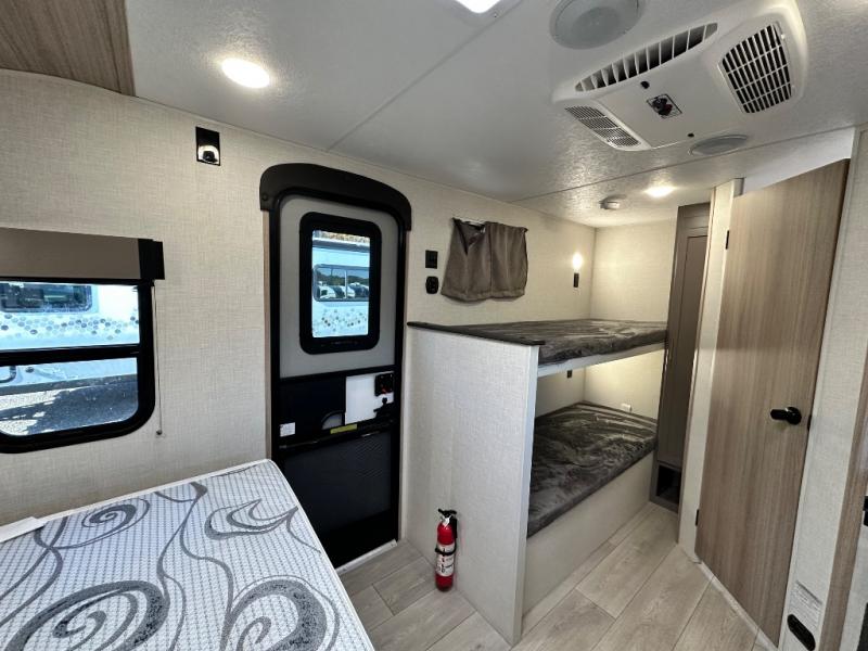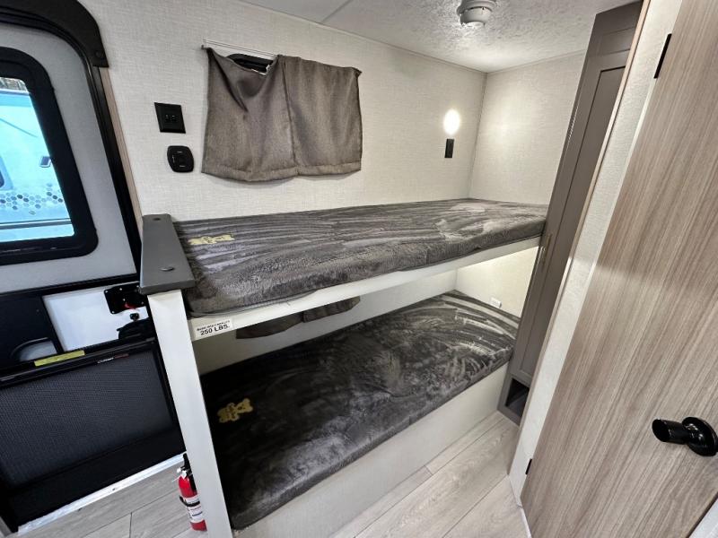 This cozy travel trailer with bunk beds will let you camp with ease! While your guests or the kids take the bunks, you can enjoy the front 54" x 80" bed all to yourselves. There is a private bath with a shower and toilet so won't have to use the camp's facilities. A two burner cooktop and microwave oven will let you make meals each day, and there is a refrigerator to keep perishables fresh. When you're ready for some fresh air, grab your hiking gear from the exterior trunk door and head for the trails!