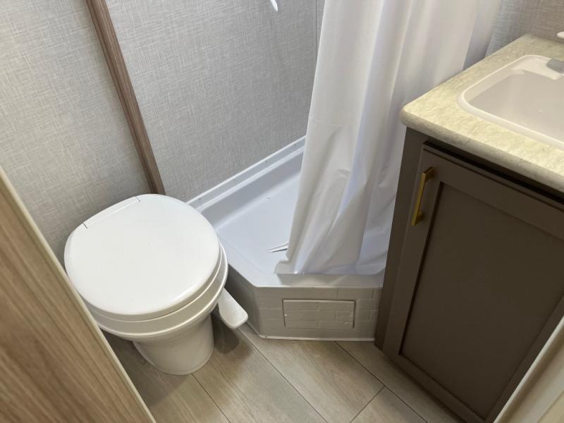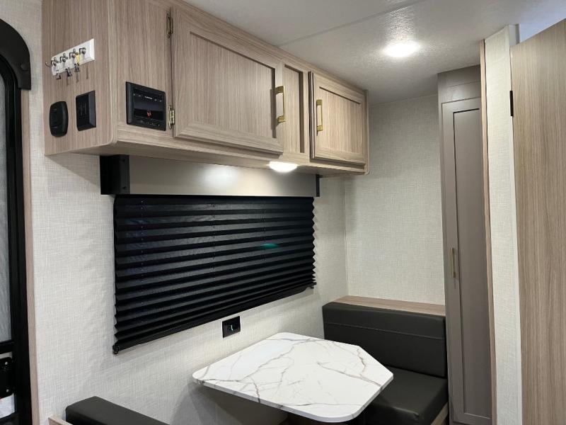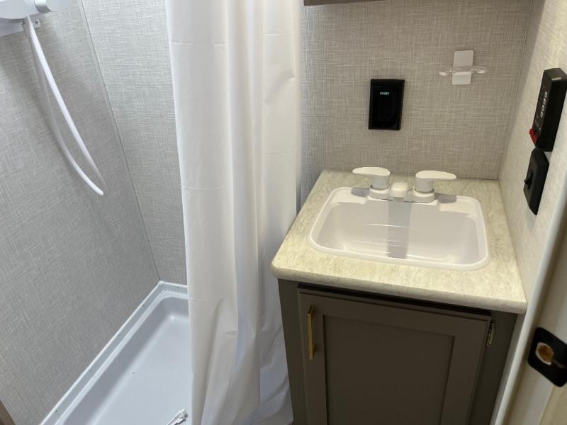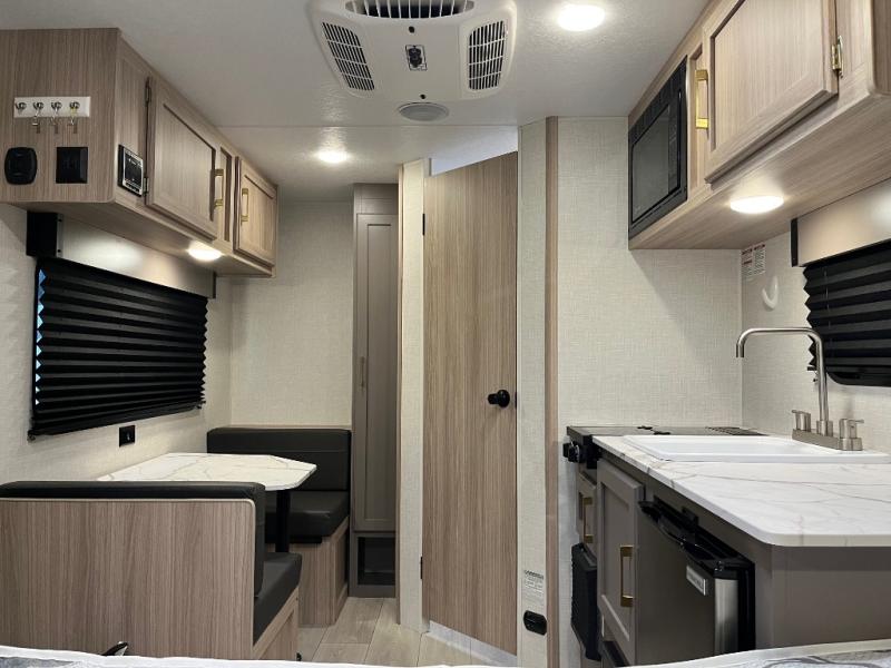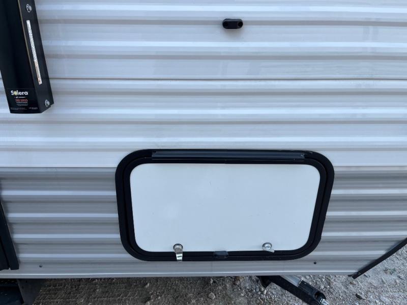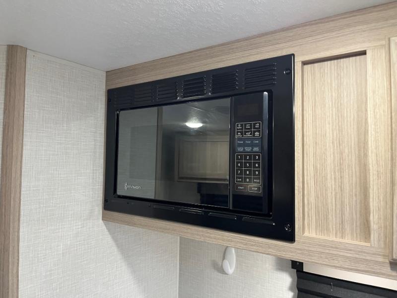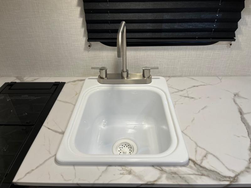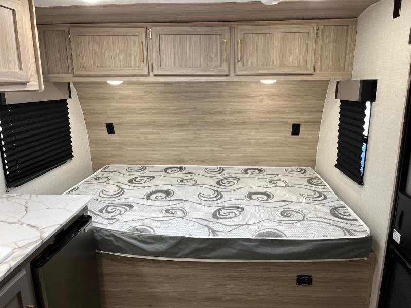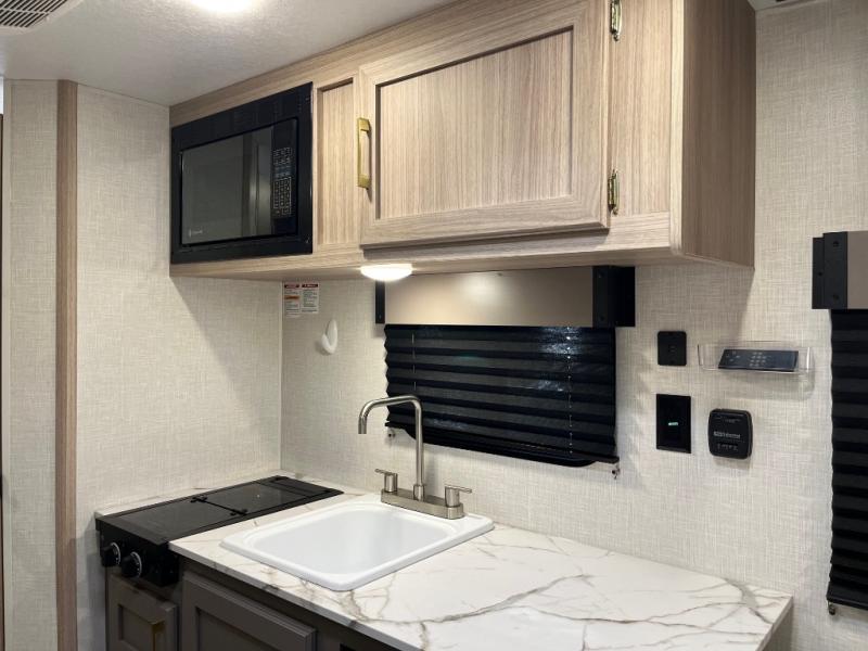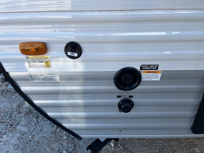 This cozy travel trailer with a front full bed is sure to feel just like home. There is a private bath with a shower and toilet so won't have to use the camp's facilities, and a booth dinette provides dining and additional sleeping space for one adult or two small children. The two burner cooktop and microwave oven will let you make meals each day, and there is a refrigerator to keep perishables fresh. When you're ready for some fresh air, grab your hiking gear from the exterior trunk door and head for the trails!