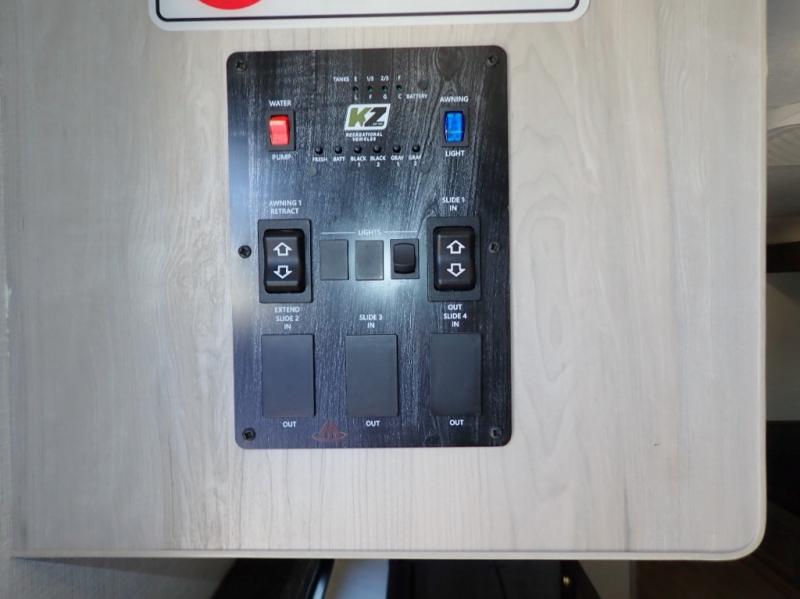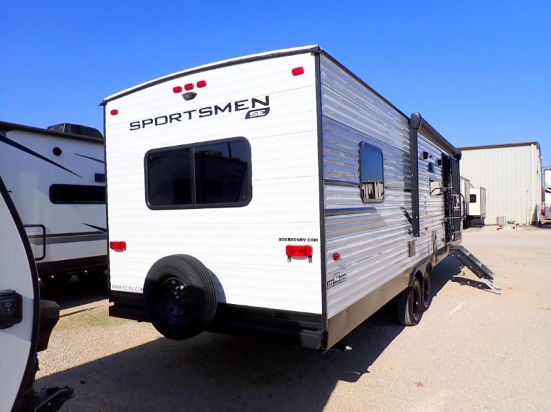 Each Sportsmen SE travel trailer and toy hauler by KZ is constructed with KZ exclusive tough shield exterior metal, a one-piece seamless walk-on Tufflex roofing material, and diamond plate rock guard to protect your unit from road debris. You will appreciate the extra large baggage doors for stowing away your gear when not in use, and tinted windows to help keep the harmful sun rays out plus keeping it cooler inside. Some of the exterior conveniences found in the mandatory Advantage Package are the solid folding steps with a large folding grab handle for easy entry and exit, a full glass friction hinged entry door, plus an exterior shower for your pets or to rinse off before you head inside. You'll also appreciate the nitrogen-filled tires, solar and backup camera prep, plus a Leash Latch with a bonus beverage opener. You'll feel right at home inside with linoleum flooring throughout, a 13,500 BTU air conditioner, large overhead cabinets, a shower surround, and much more!