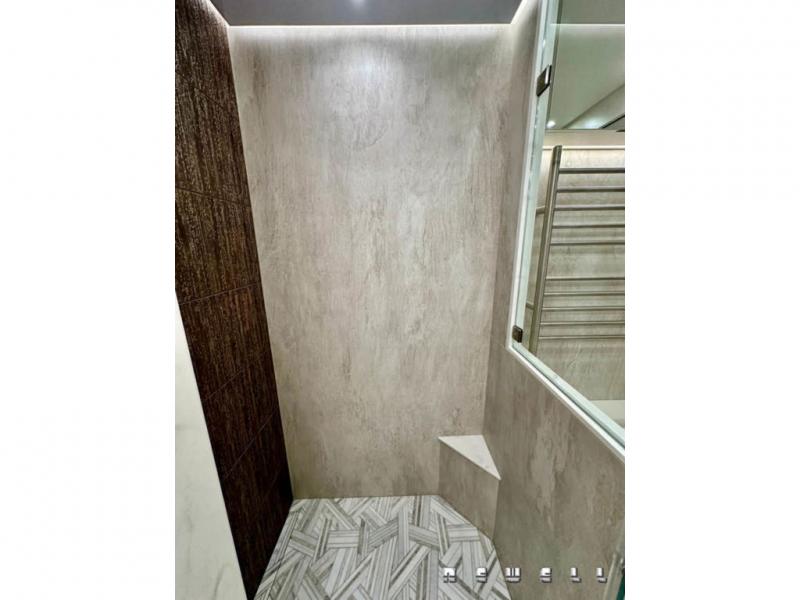 Shower in master bathroom with rain shower head and fold down wooden seat