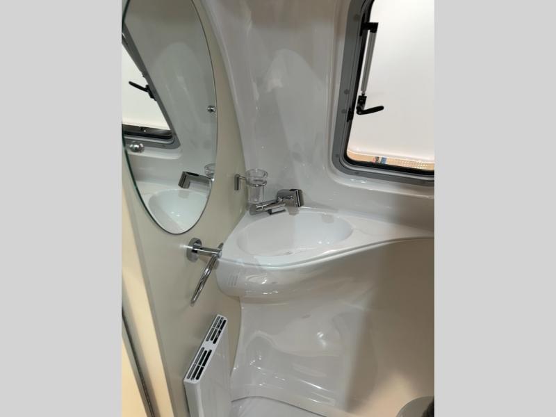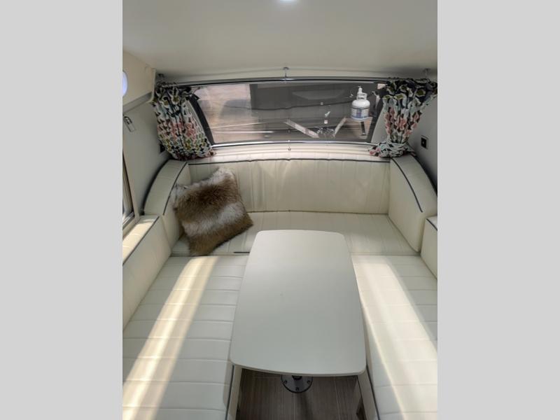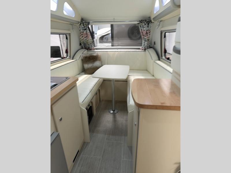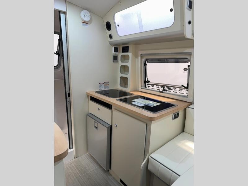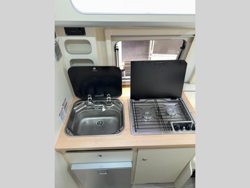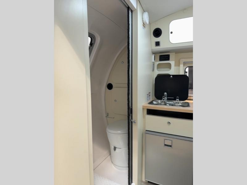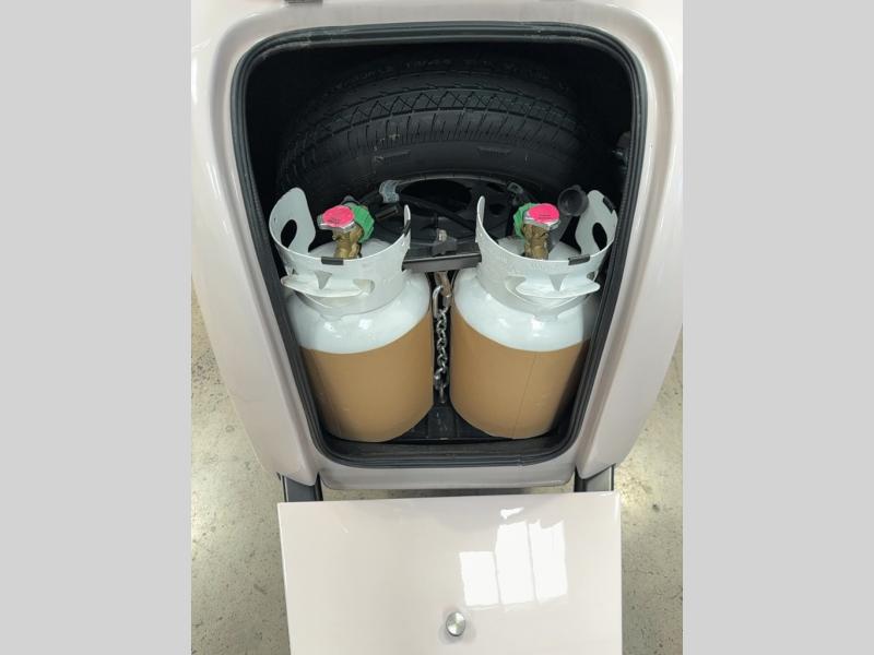 Glamping comes easy in this cute trailer for two! Once you've found a campground to park for the night, whip up a quick meal on the two burner cooktop and dine at the U-shaped dinette. Clean-up will be a breeze with the stainless steel deep-basin sink, and there is a 12V compressor refrigerator for leftovers. You will find a wall mounted pocket organizer, a wardrobe with table storage, plus designated storage for the propane tank hose and spare tire. This model also includes a portable Bose Bluetooth speaker so you can listen to your favorite tunes from your device, and the power roof fan will provide fresh air as you relax with your loved ones.