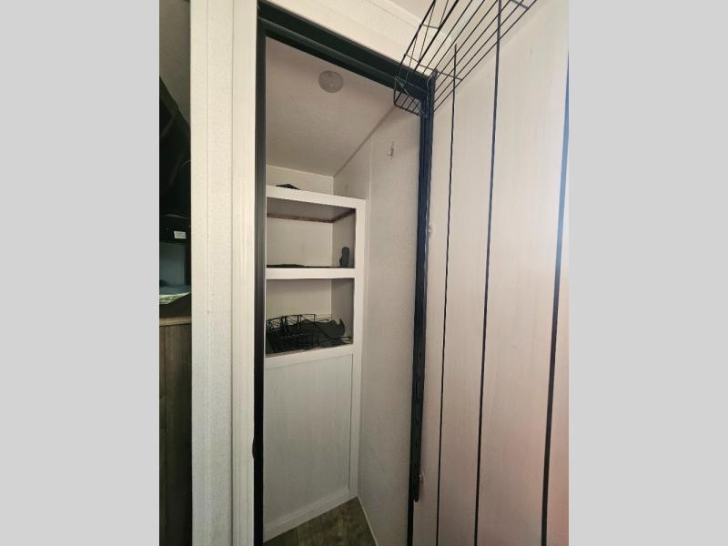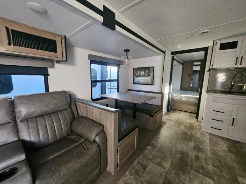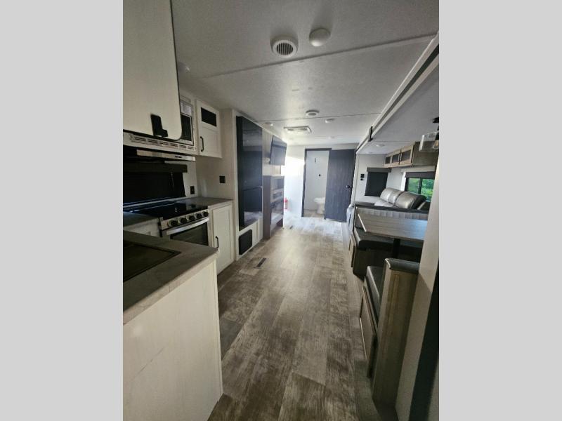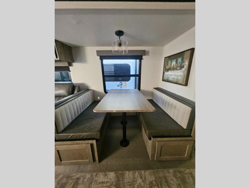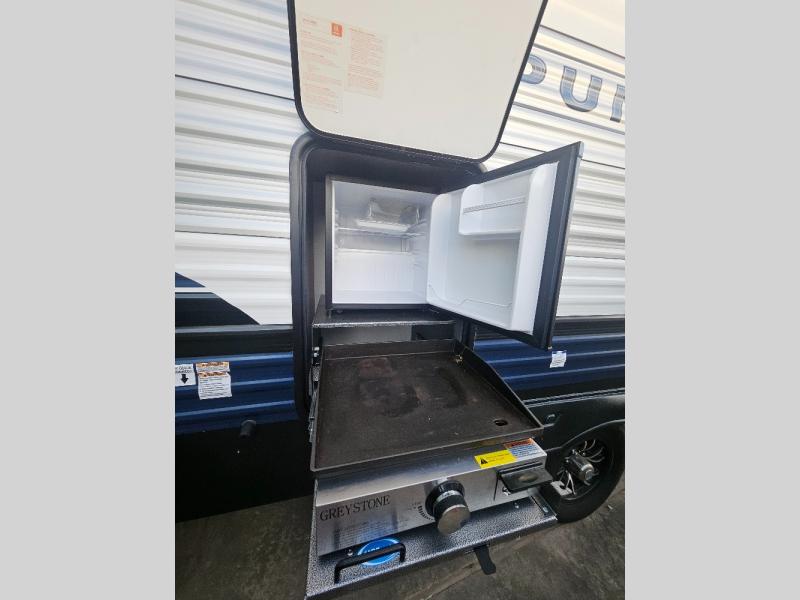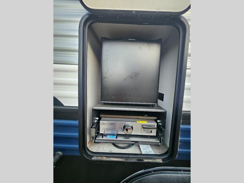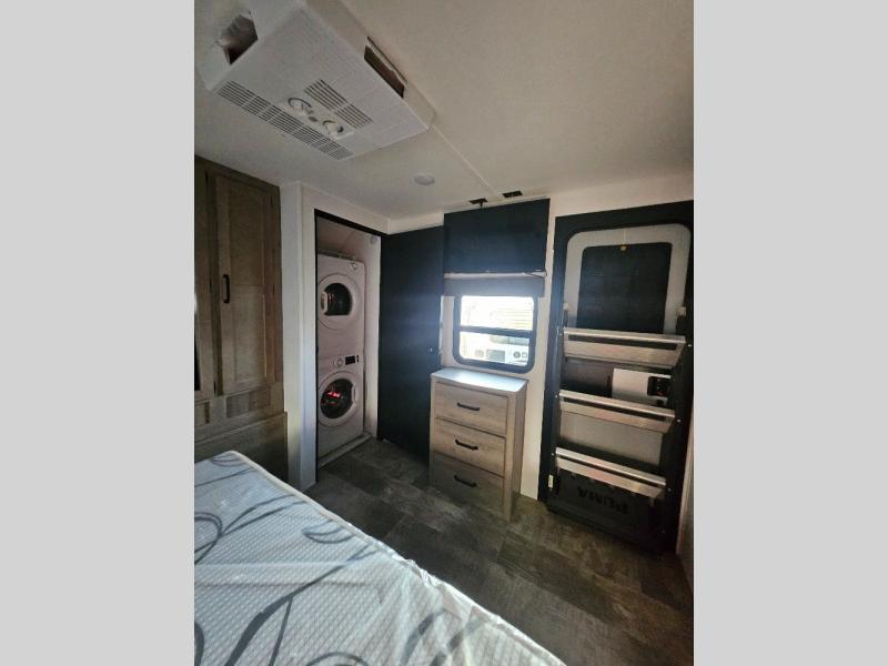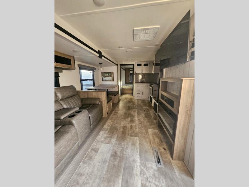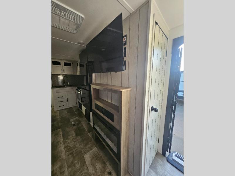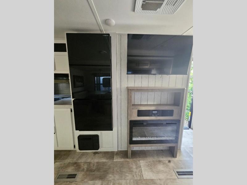 Head to the lake in this double slide out travel trailer that can sleep four to five each night. You will love having the front private bedroom all to yourselves that includes a queen bed slide out, a front wardrobe, a closet with washer and dryer prep, plus your own exterior entry door. Your guests can sleep on the sofa and booth dinette within the second slide out, and the full rear bath is tucked away for privacy. This model also includes an entryway closet/pantry for food storage and jackets, and the fireplace across from the sofa makes your space more cozy. An optional outside micro kitchen is available also if you like to cook outdoors!