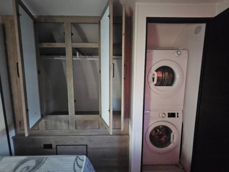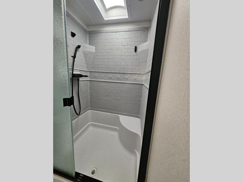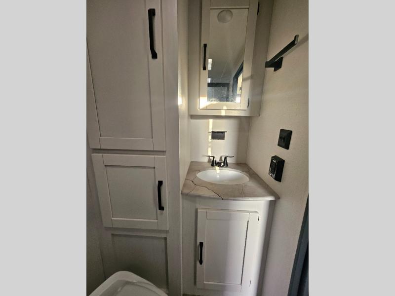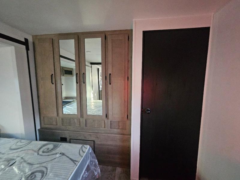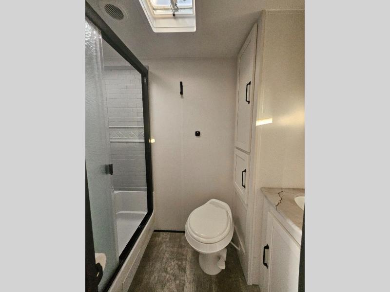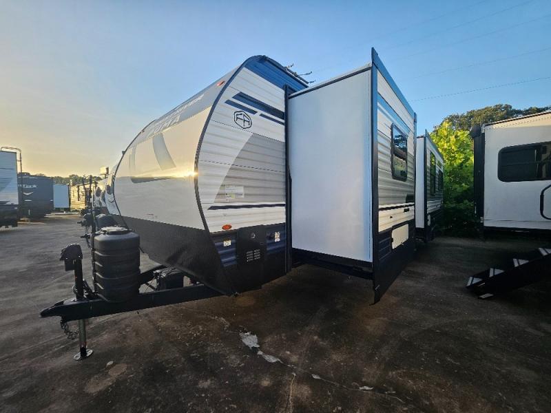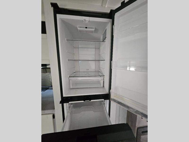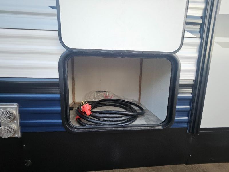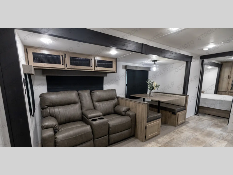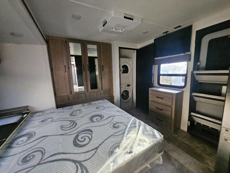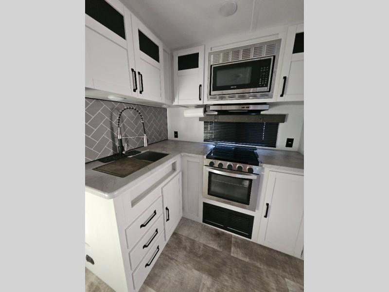 Head to the lake in this double slide out travel trailer that can sleep four to five each night. You will love having the front private bedroom all to yourselves that includes a queen bed slide out, a front wardrobe, a closet with washer and dryer prep, plus your own exterior entry door. Your guests can sleep on the sofa and booth dinette within the second slide out, and the full rear bath is tucked away for privacy. This model also includes an entryway closet/pantry for food storage and jackets, and the fireplace across from the sofa makes your space more cozy. An optional outside micro kitchen is available also if you like to cook outdoors!