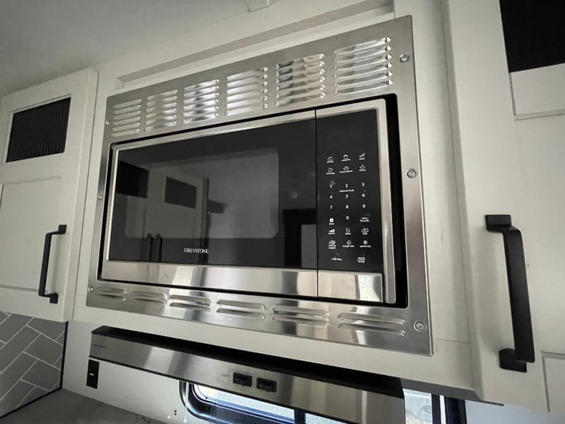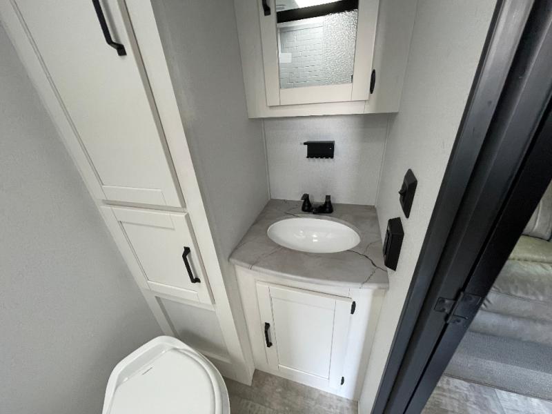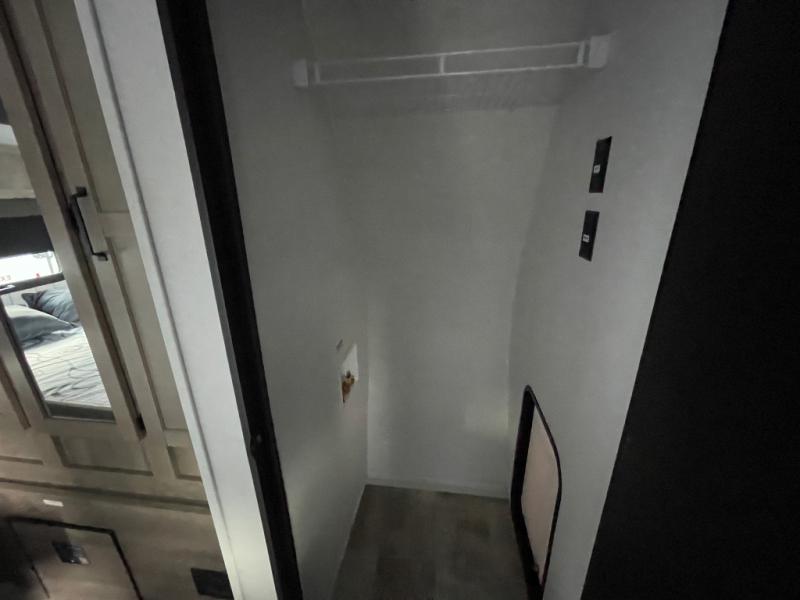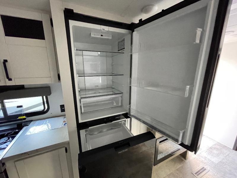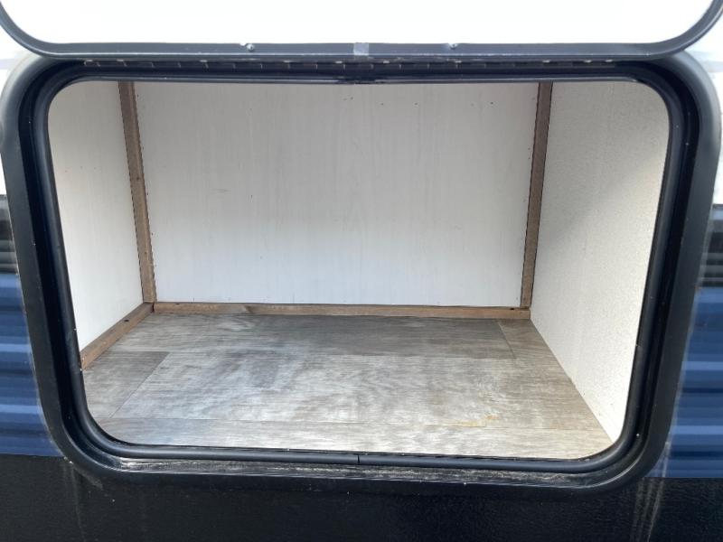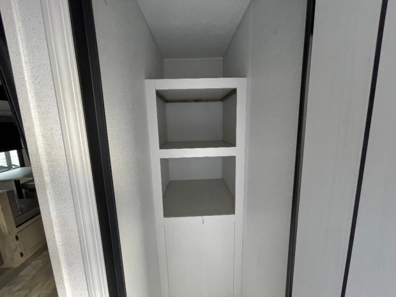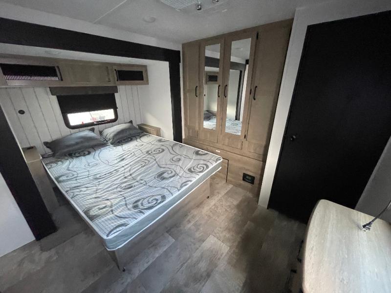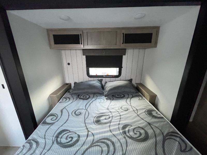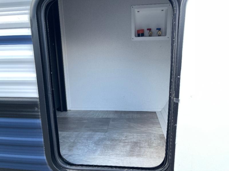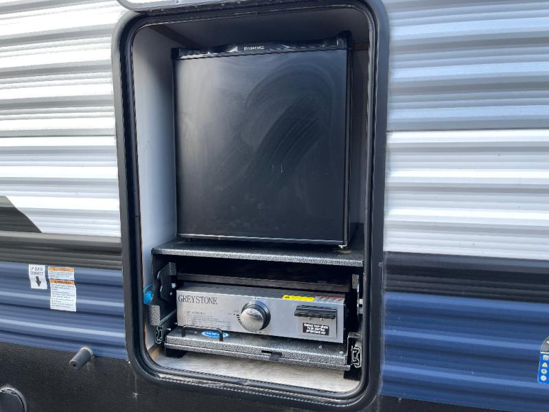 Head to the lake in this double slide out travel trailer that can sleep four to five each night. You will love having the front private bedroom all to yourselves that includes a queen bed slide out, a front wardrobe, a closet with washer and dryer prep, plus your own exterior entry door. Your guests can sleep on the sofa and booth dinette within the second slide out, and the full rear bath is tucked away for privacy. This model also includes an entryway closet/pantry for food storage and jackets, and the fireplace across from the sofa makes your space more cozy. An optional outside micro kitchen is available also if you like to cook outdoors!