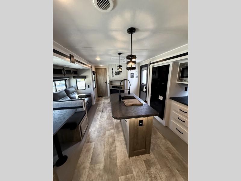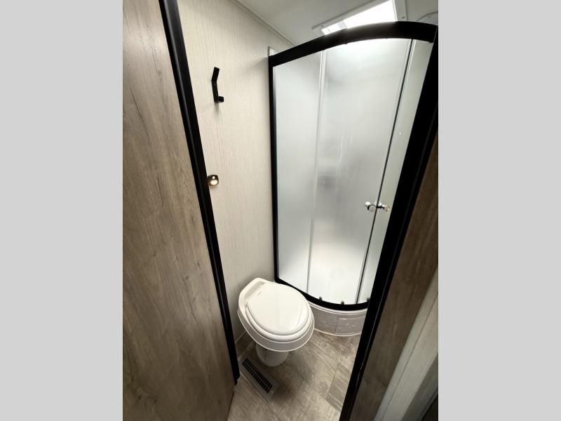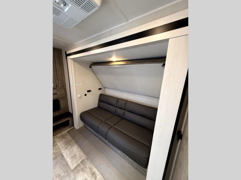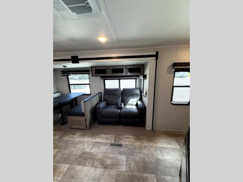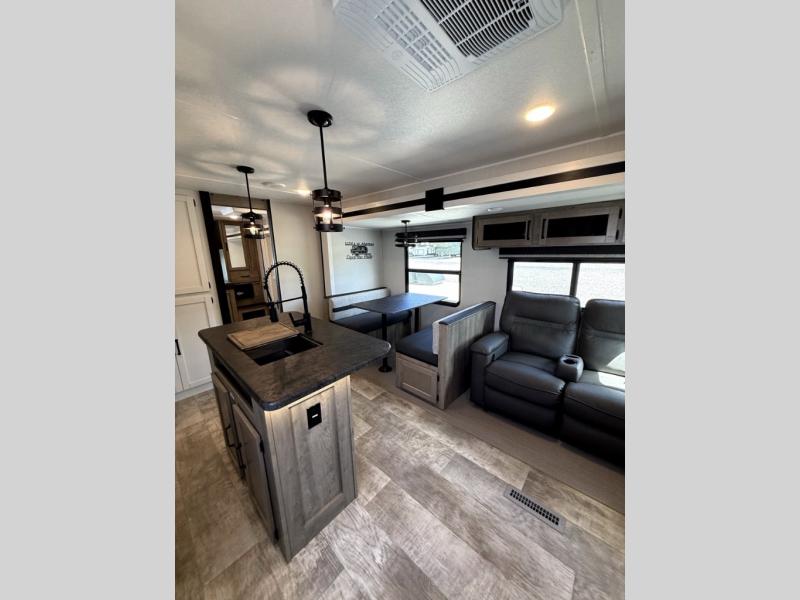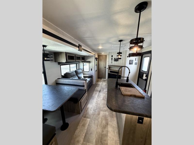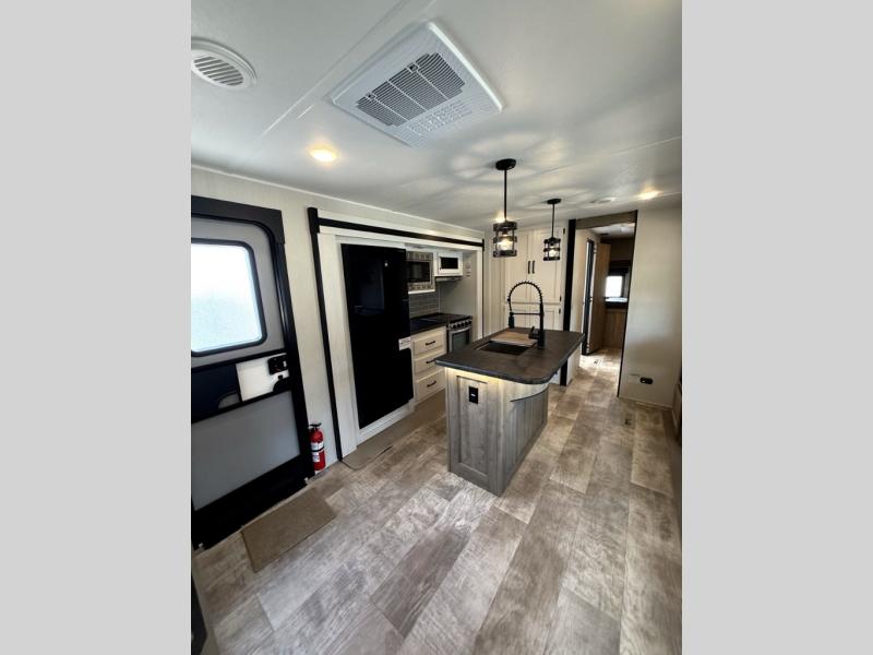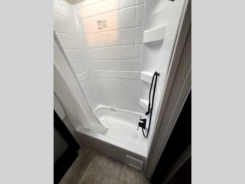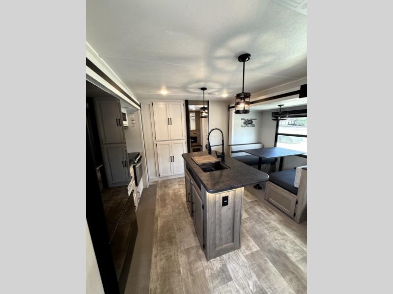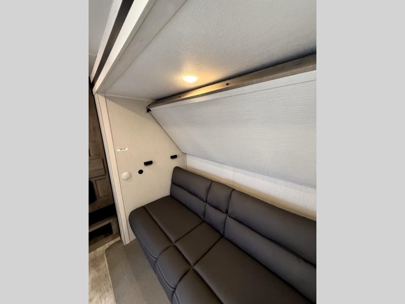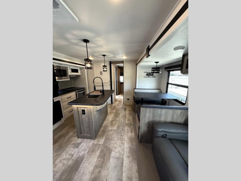 With two full bathrooms, it's a clean decision to take this travel trailer on your next family vacation! Start each morning feeling recharged after sleeping on the queen bed in the front private bedroom or in the rear private bunkhouse with an angled top bunk above a 32" x 69" double bunk bed and a 32" x 69" bunk above a 68" sofa slide. The bunkhouse also has a full bathroom with a 24" x 40" tub and one of the dual entry doors to the unit. You can relax on the sofa while enjoying the entertainment center and eat your meals prepared with the kitchen island at the booth dinette.