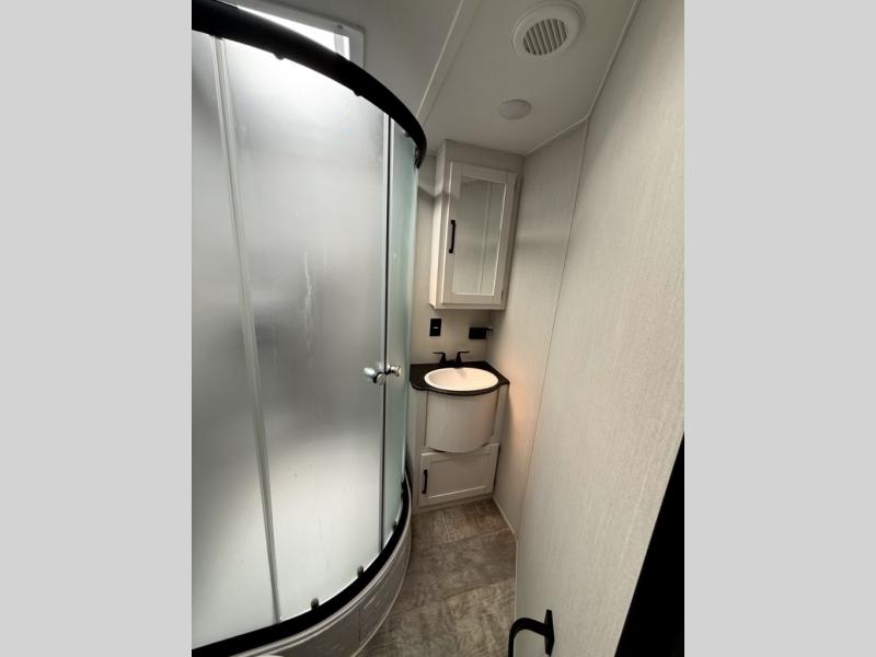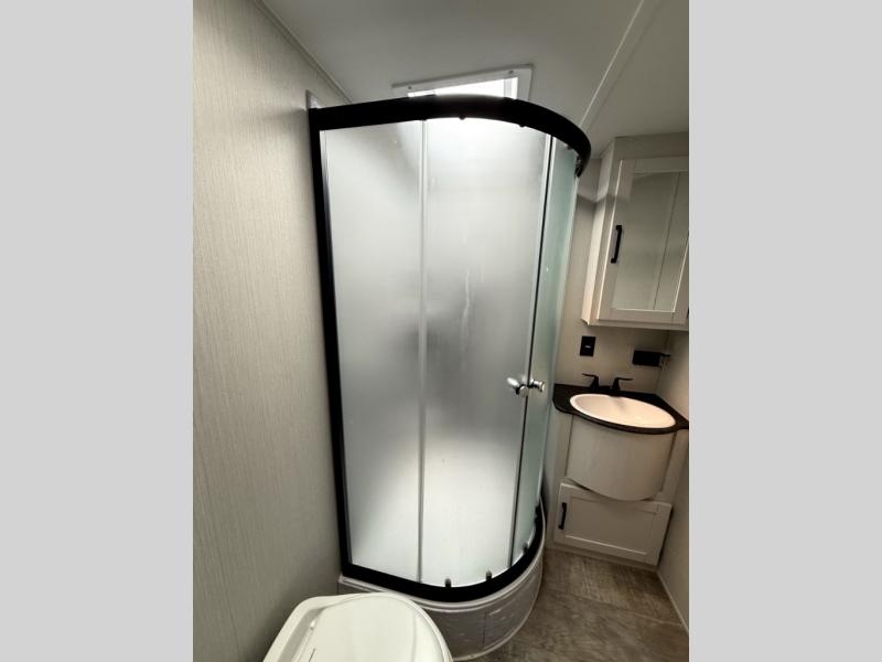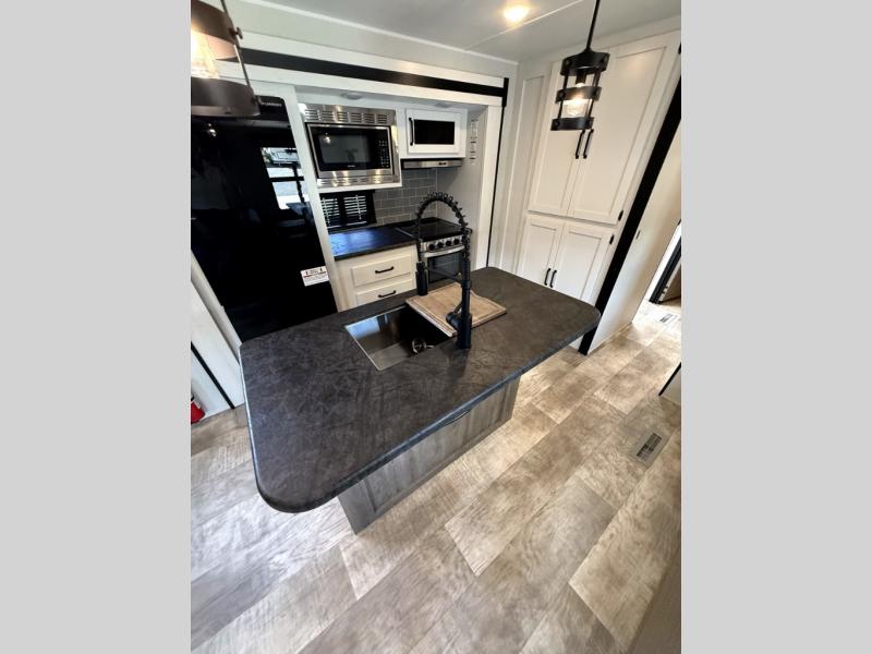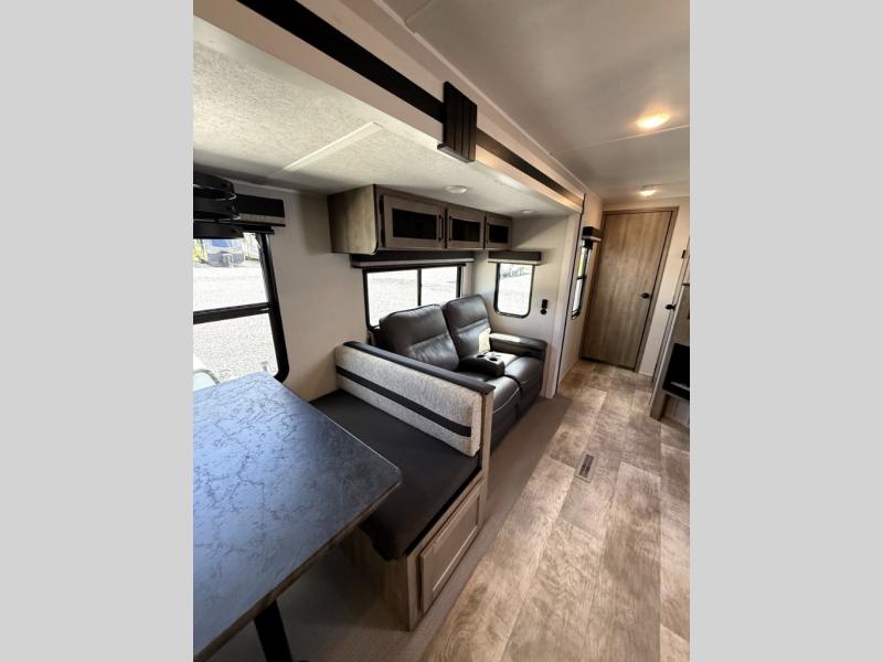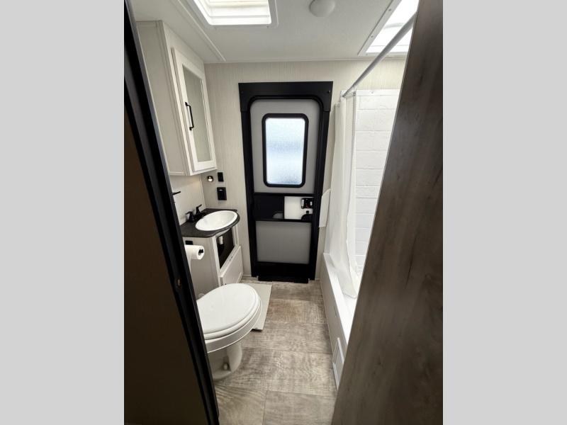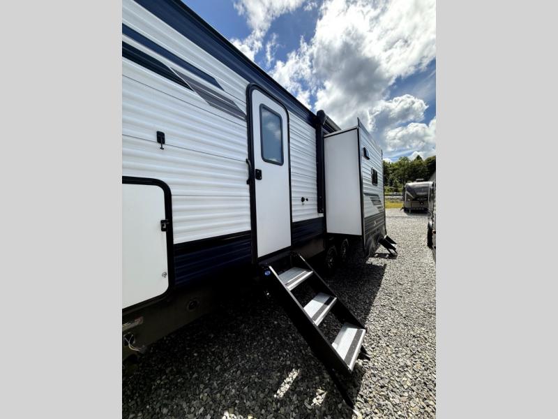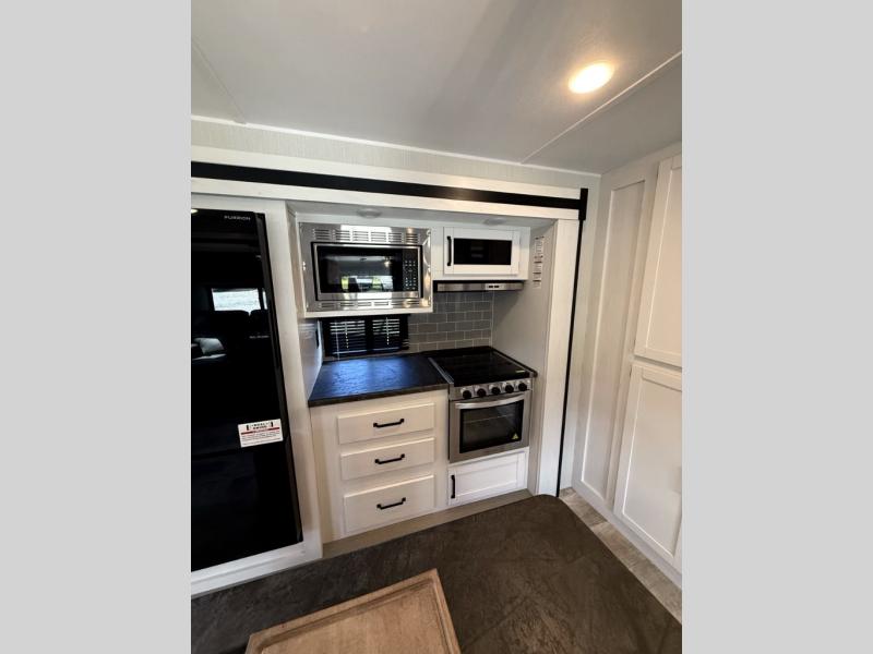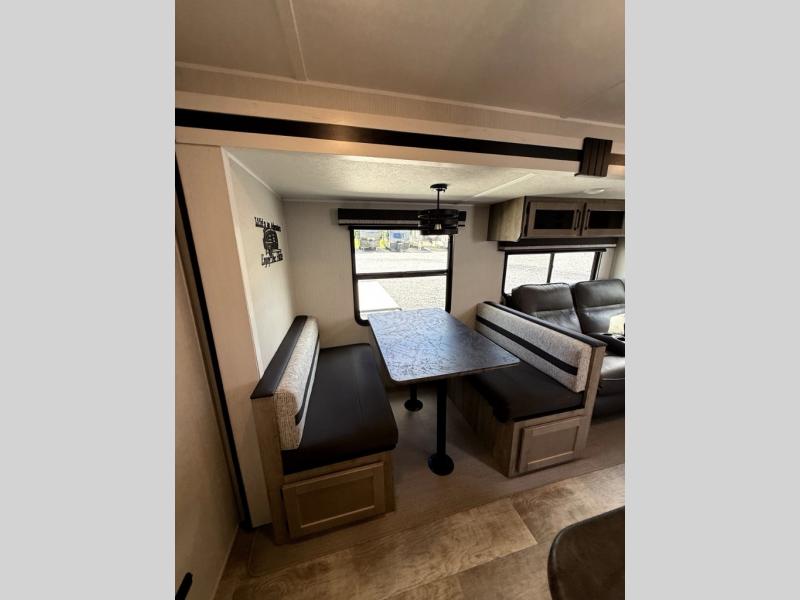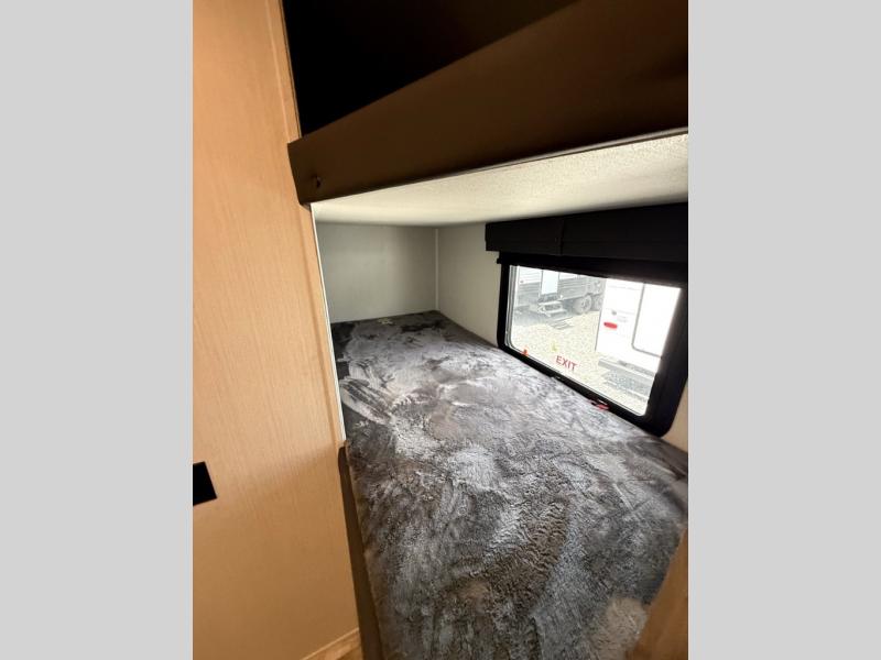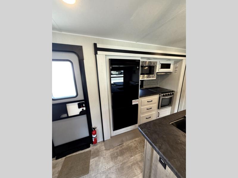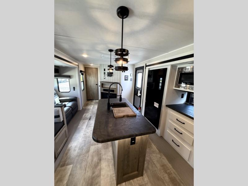 With two full bathrooms, it's a clean decision to take this travel trailer on your next family vacation! Start each morning feeling recharged after sleeping on the queen bed in the front private bedroom or in the rear private bunkhouse with an angled top bunk above a 32" x 69" double bunk bed and a 32" x 69" bunk above a 68" sofa slide. The bunkhouse also has a full bathroom with a 24" x 40" tub and one of the dual entry doors to the unit. You can relax on the sofa while enjoying the entertainment center and eat your meals prepared with the kitchen island at the booth dinette.