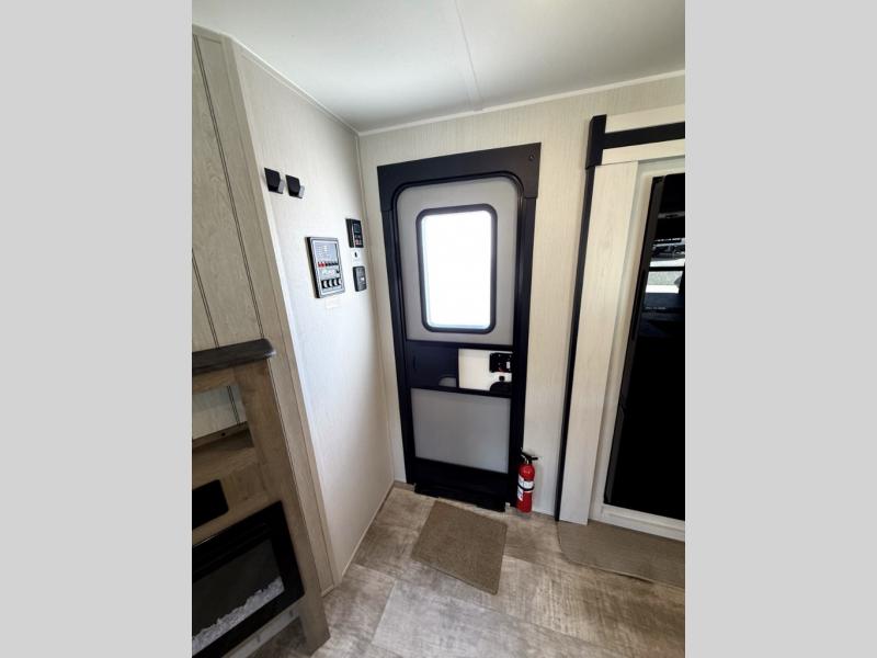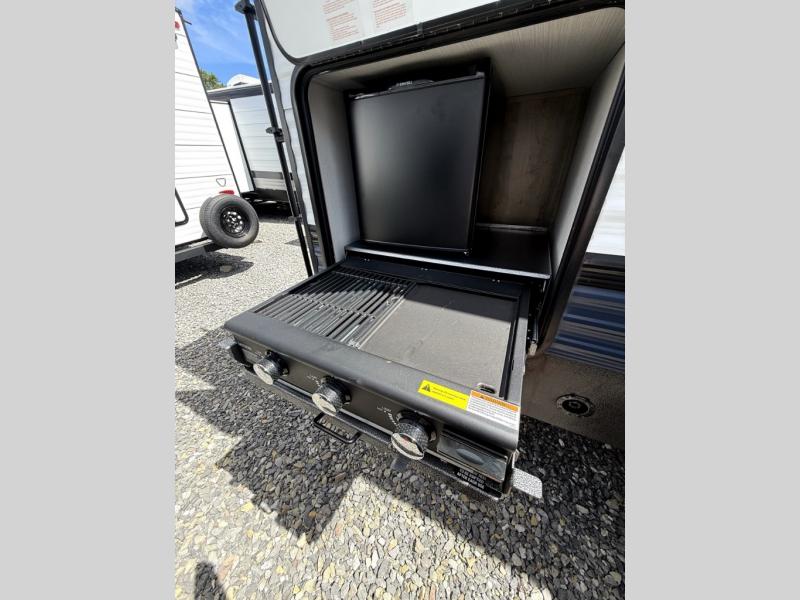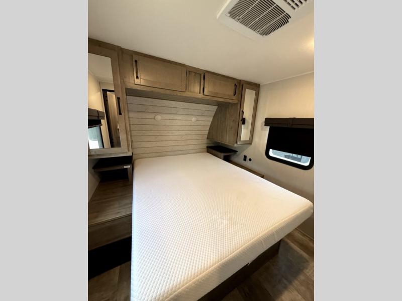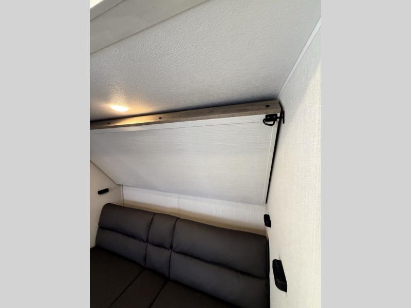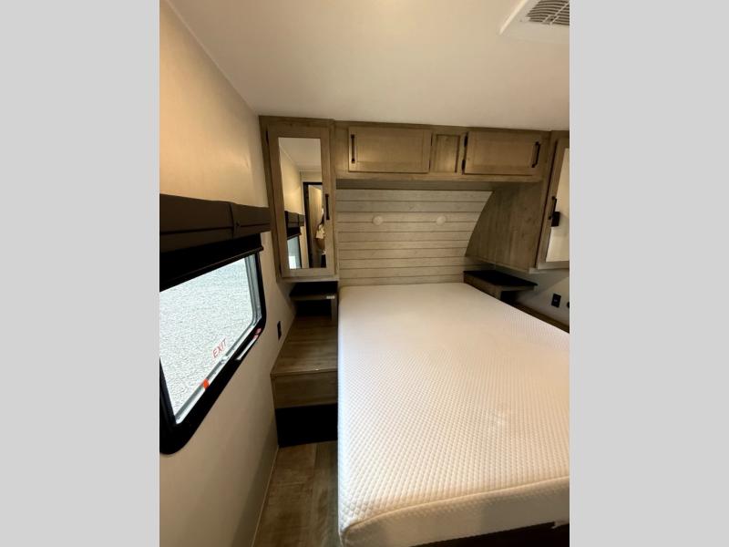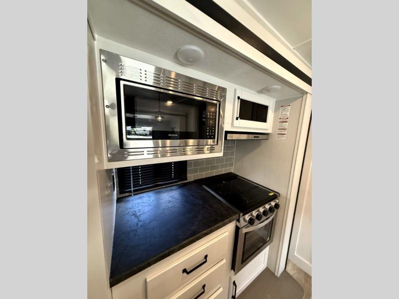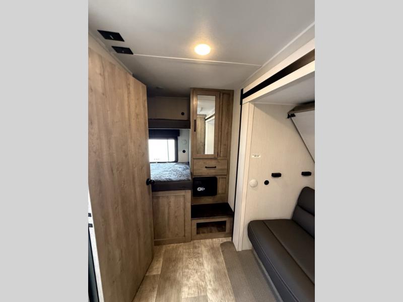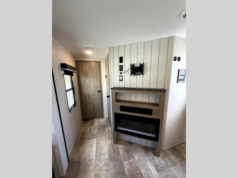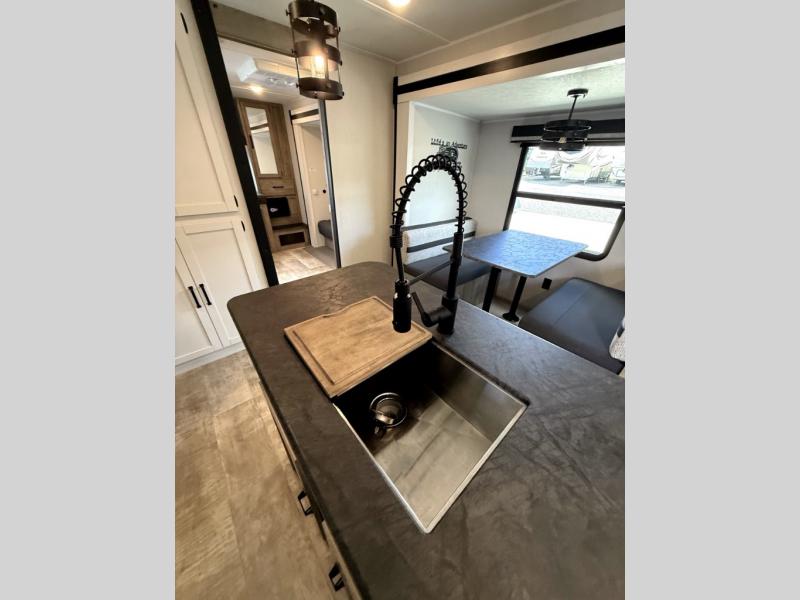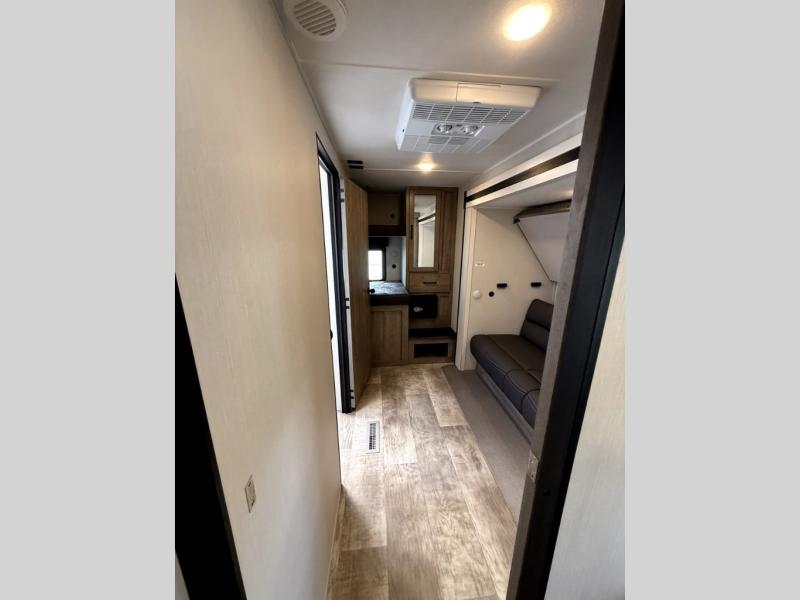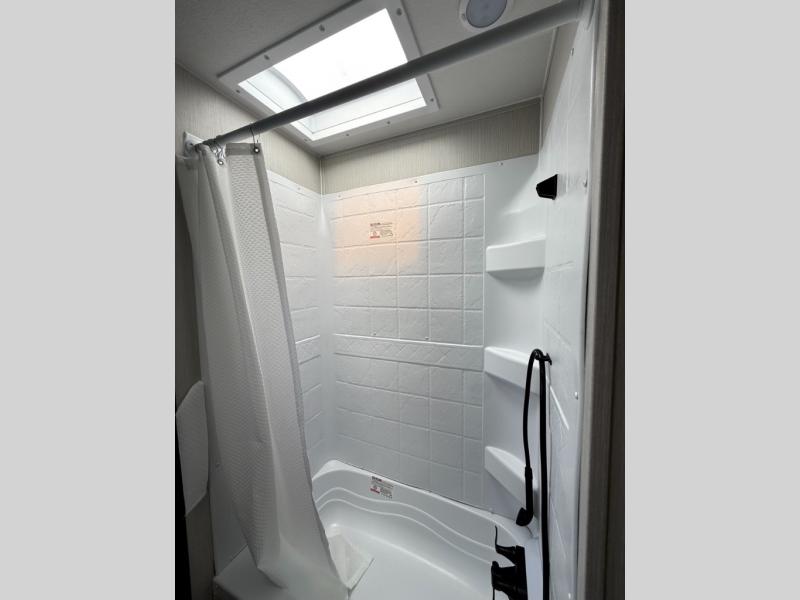 With two full bathrooms, it's a clean decision to take this travel trailer on your next family vacation! Start each morning feeling recharged after sleeping on the queen bed in the front private bedroom or in the rear private bunkhouse with an angled top bunk above a 32" x 69" double bunk bed and a 32" x 69" bunk above a 68" sofa slide. The bunkhouse also has a full bathroom with a 24" x 40" tub and one of the dual entry doors to the unit. You can relax on the sofa while enjoying the entertainment center and eat your meals prepared with the kitchen island at the booth dinette.