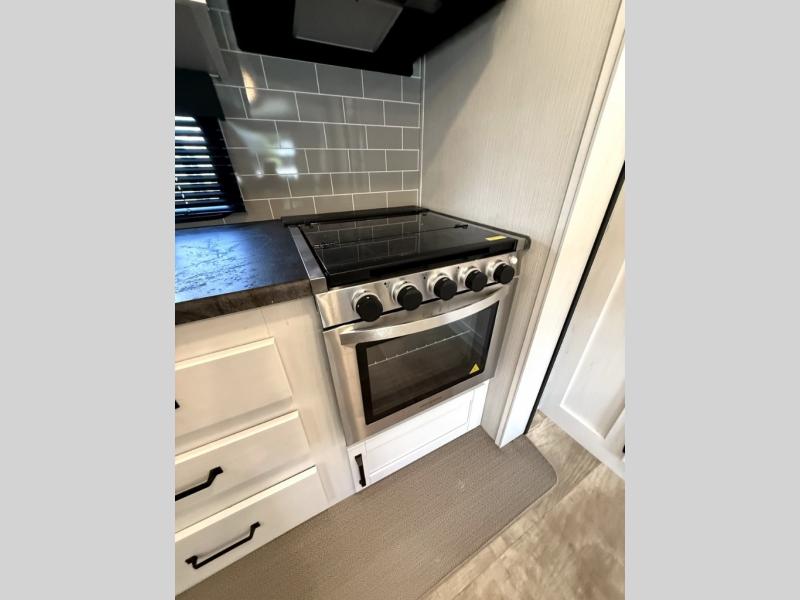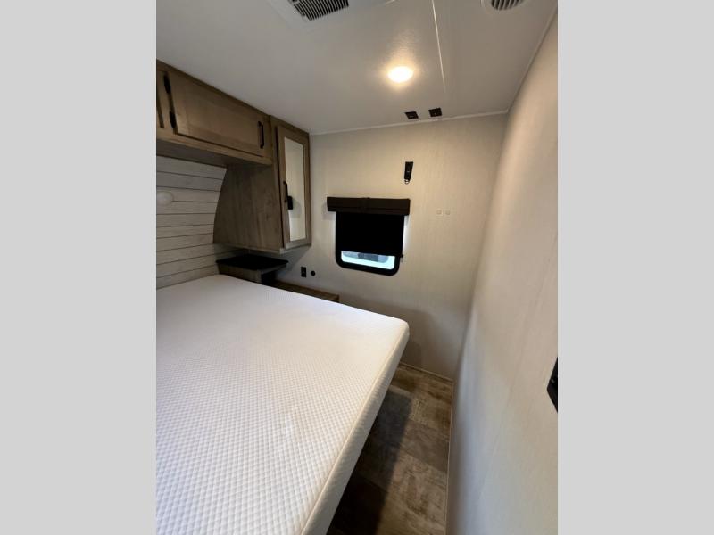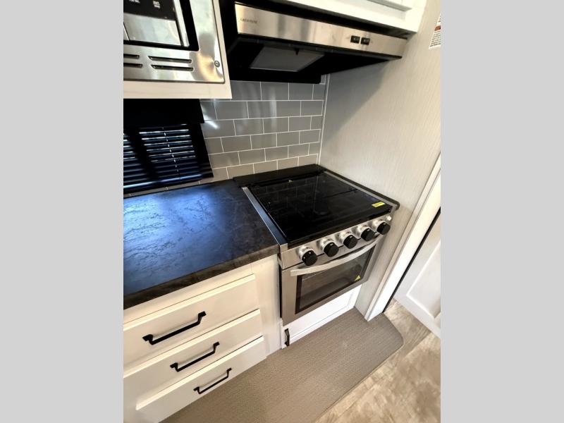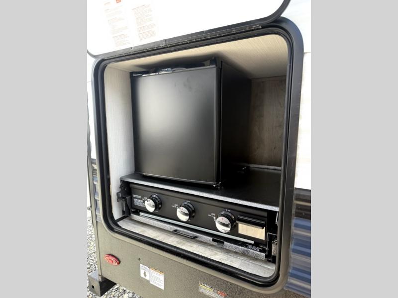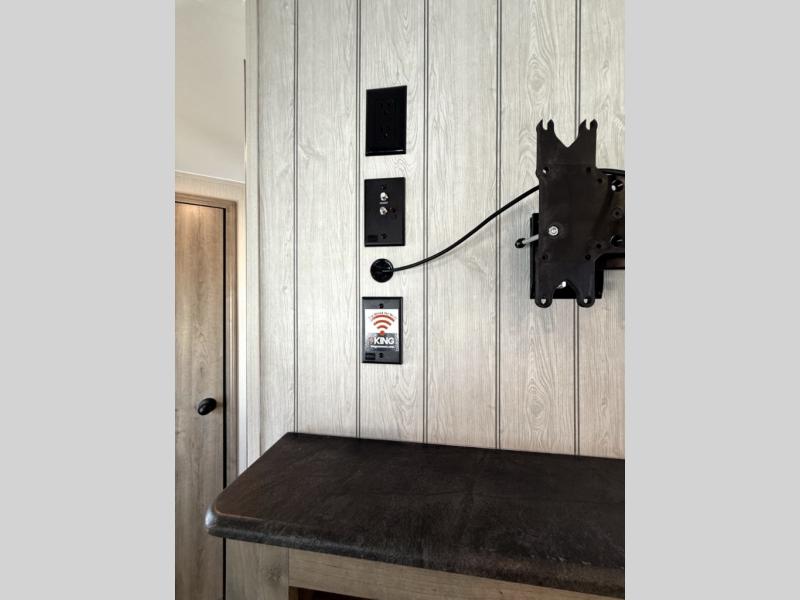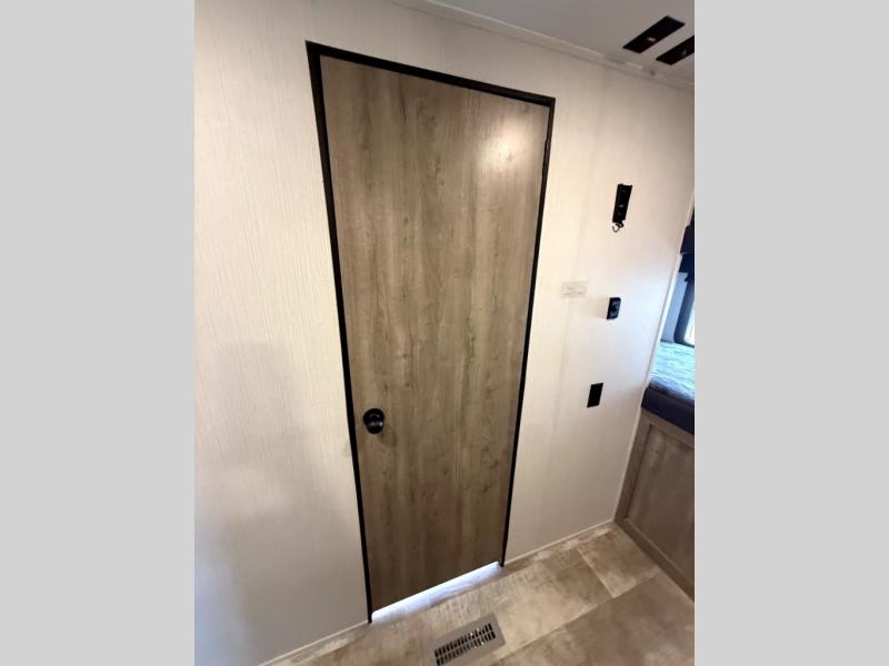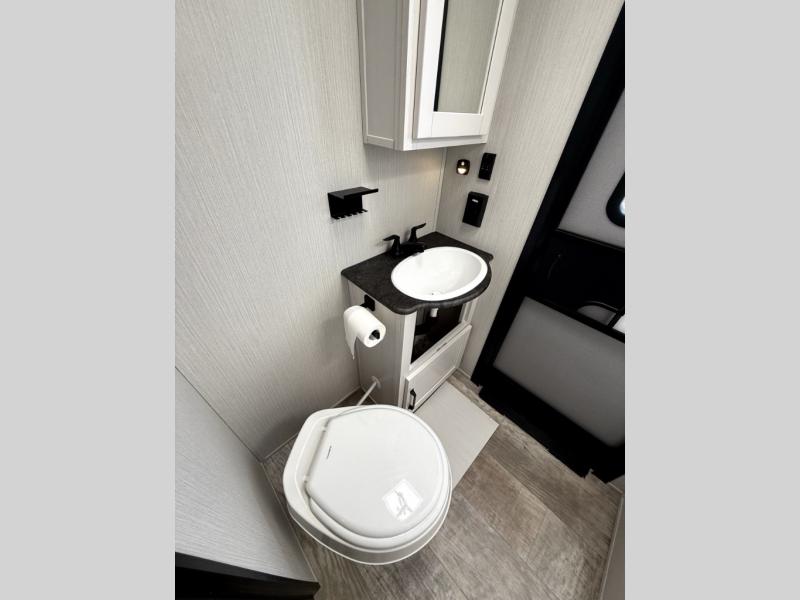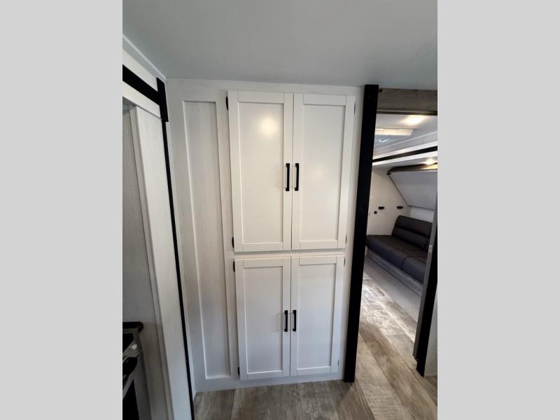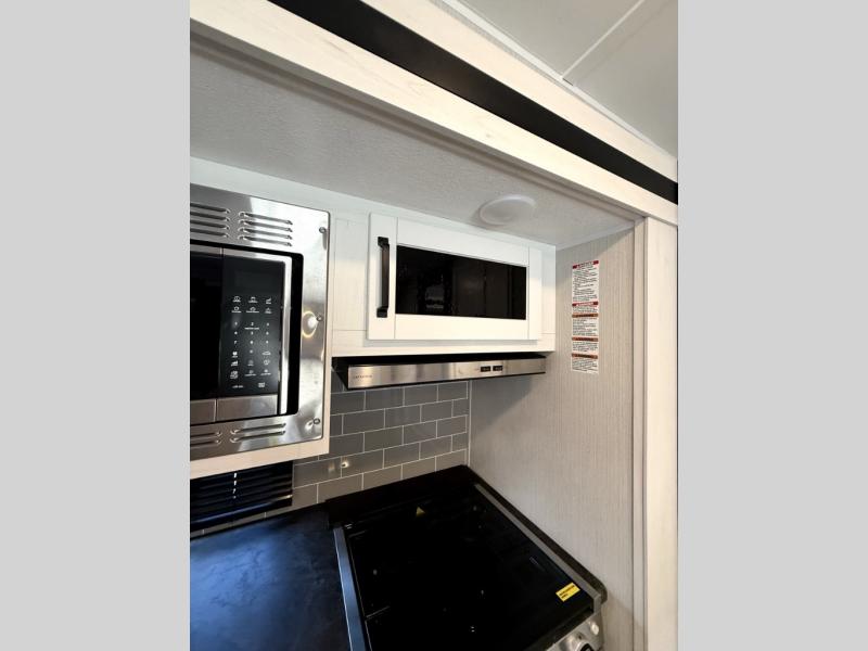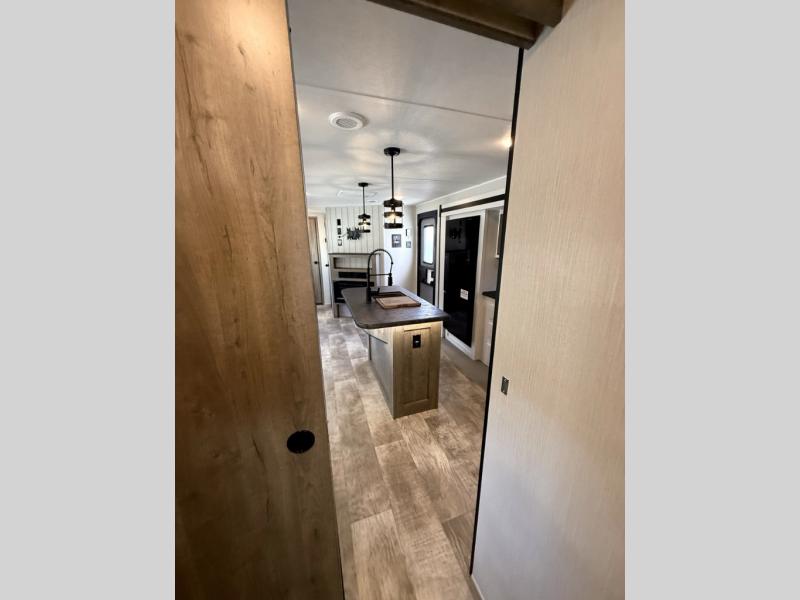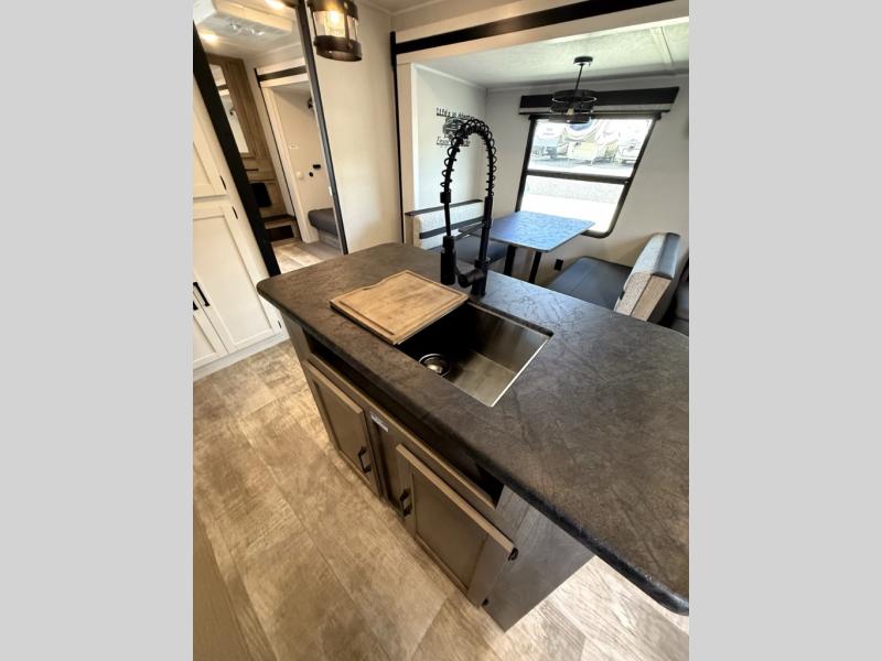 With two full bathrooms, it's a clean decision to take this travel trailer on your next family vacation! Start each morning feeling recharged after sleeping on the queen bed in the front private bedroom or in the rear private bunkhouse with an angled top bunk above a 32" x 69" double bunk bed and a 32" x 69" bunk above a 68" sofa slide. The bunkhouse also has a full bathroom with a 24" x 40" tub and one of the dual entry doors to the unit. You can relax on the sofa while enjoying the entertainment center and eat your meals prepared with the kitchen island at the booth dinette.