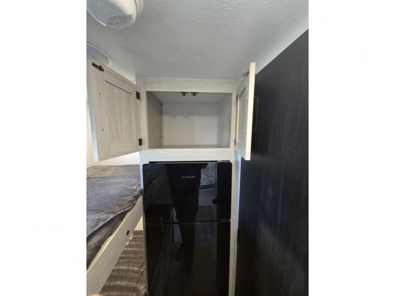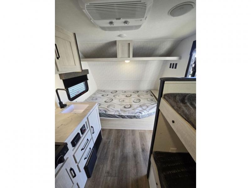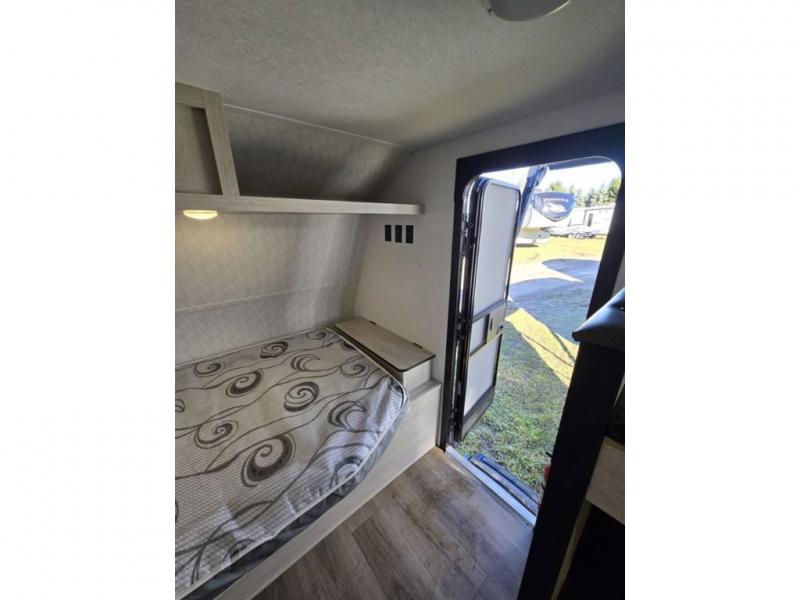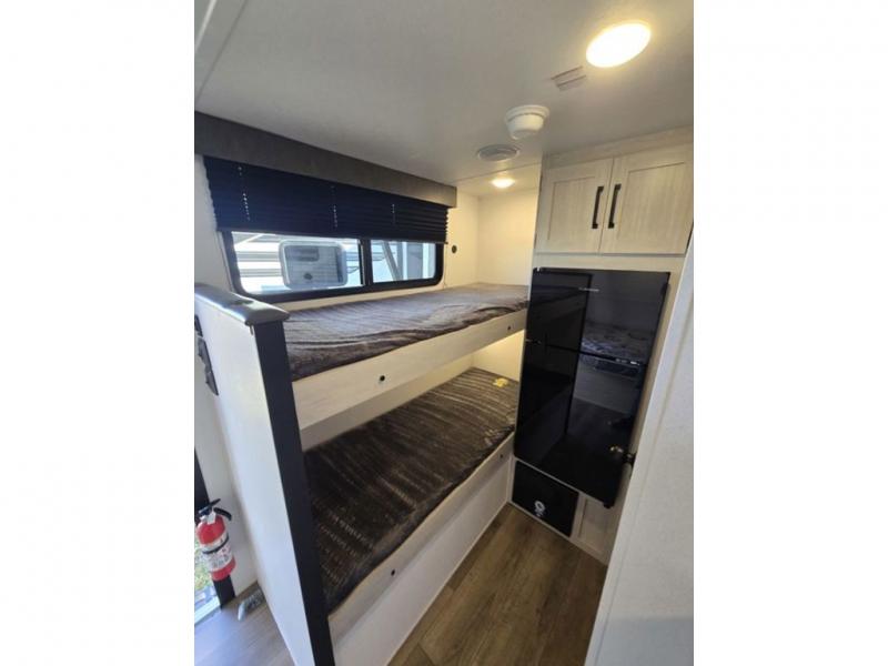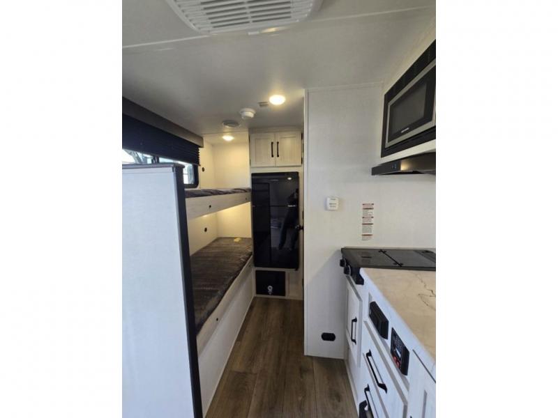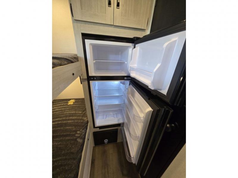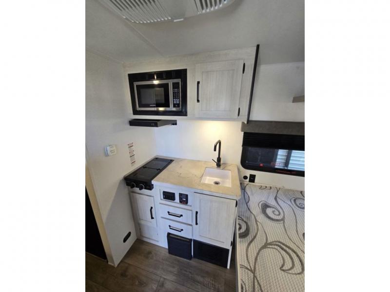 It will be so easy to enjoy camping trips in this single axle travel trailer! There is a front RV queen bed with flip-up storage at the foot of the bed for your belongings, and any additional guests can sleep on the 29" x 70" bunk beds. A full kitchen includes a stainless two burner cooktop and stainless microwave to cook meals each day, and the 4.3 cu. ft. 12V black glass refrigerator will keep your food fresh. And a private bath with a toilet and shower will let you freshen up without having to use the camp's facilities!