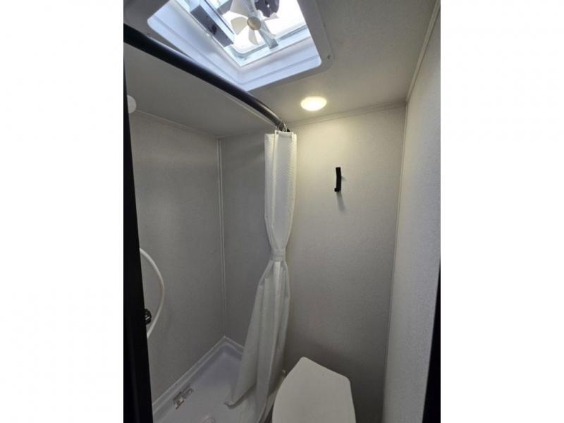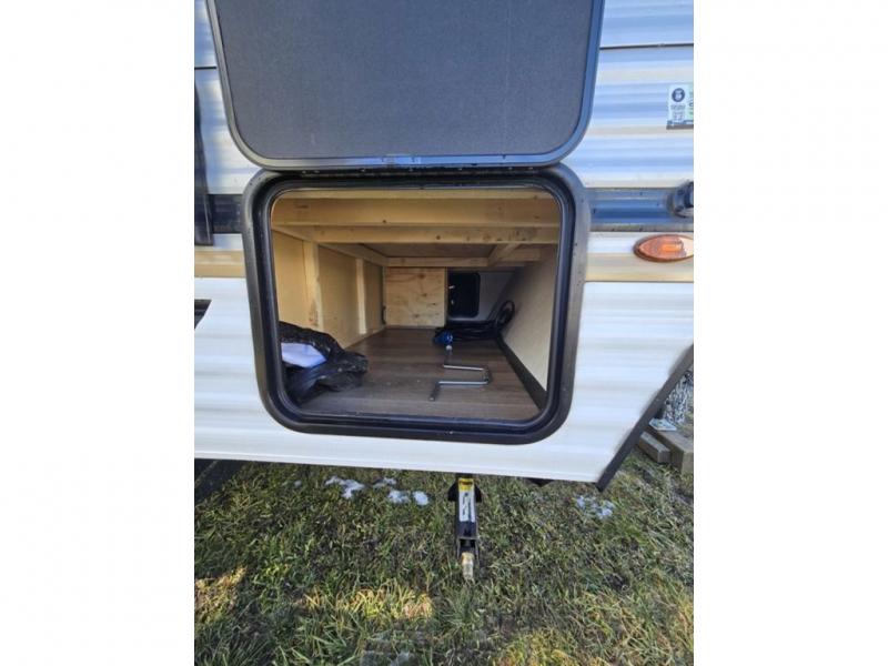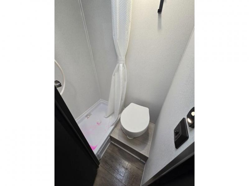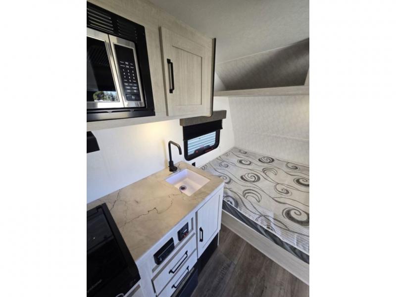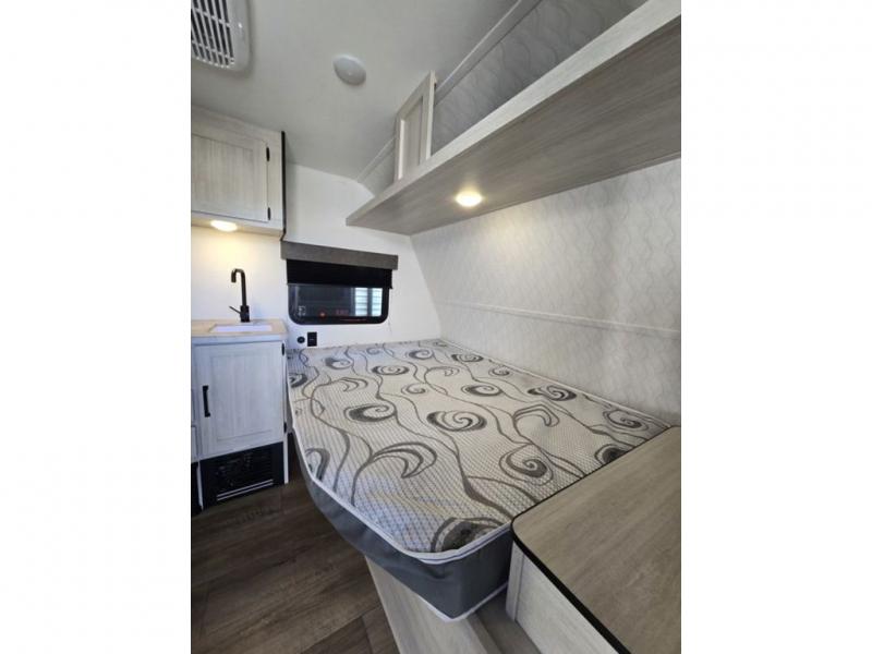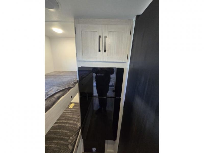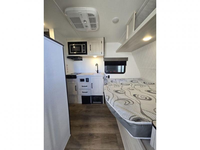 It will be so easy to enjoy camping trips in this single axle travel trailer! There is a front RV queen bed with flip-up storage at the foot of the bed for your belongings, and any additional guests can sleep on the 29" x 70" bunk beds. A full kitchen includes a stainless two burner cooktop and stainless microwave to cook meals each day, and the 4.3 cu. ft. 12V black glass refrigerator will keep your food fresh. And a private bath with a toilet and shower will let you freshen up without having to use the camp's facilities!