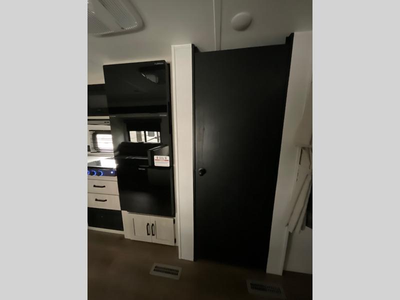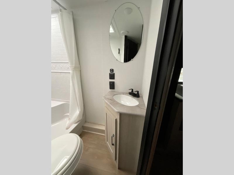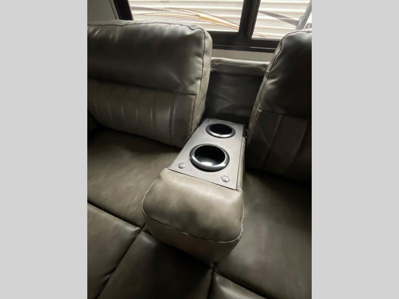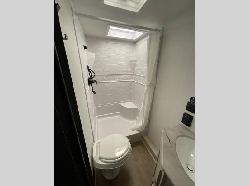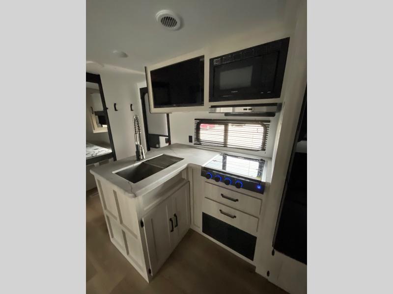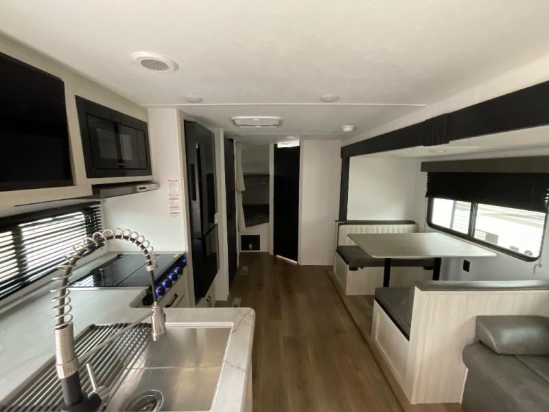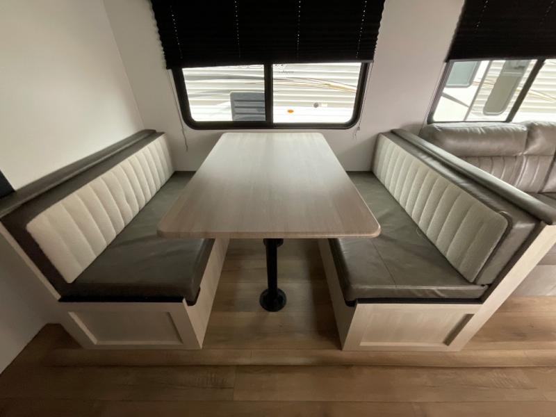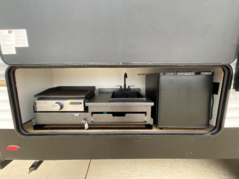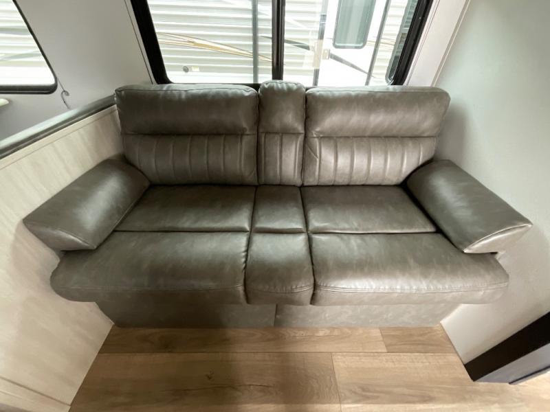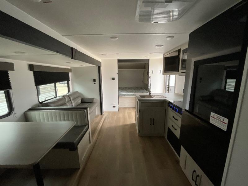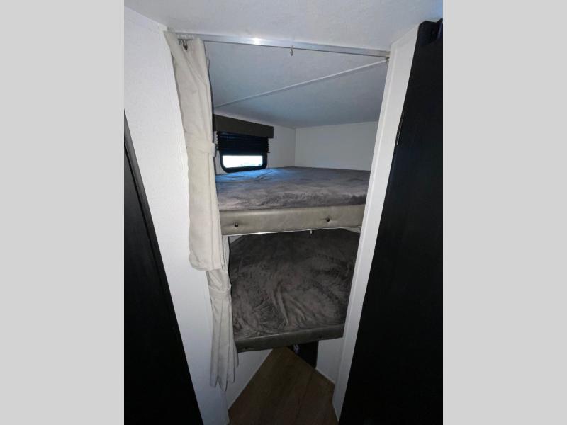 If you're looking for more space, this double axle unit features a large slide so you can walk about freely. Here, you'll find the booth dinette and sofa, which sit across from the optional TV if you want to enjoy movie nights. The full kitchen includes a stainless microwave and three burner cooktop to make meals, plus a pantry and 12V refrigerator for food storage. And an optional outside kitchen with a griddle can be added if you enjoy cooking outdoors! The kids or your guests will love the double-size bunks, and the full bath right beside the bunks includes a shower a seat for added comfort.