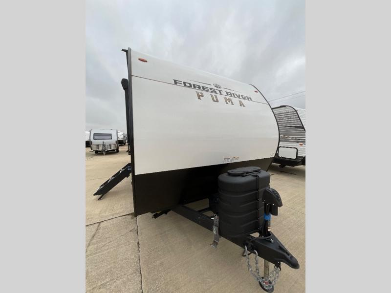 The Puma Camping Edition by Palomino offer an affordable travel trailer for rookie campers or seasoned RVers! They are built with 5/8" tongue and groove plywood flooring and a front diamond plate for added protection. There are also exterior clamp style door latches, back up camera prep, and 20 lb. LP bottles. Head inside to find Thermofoil countertops with a smooth drop edge, bedroom USB ports and outlets, and a GE appliance and kitchen package.