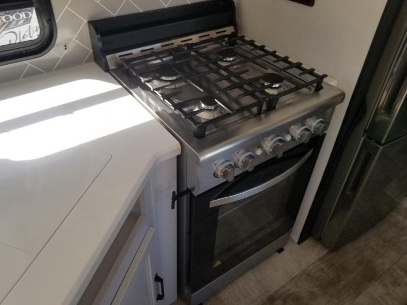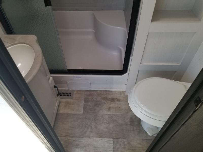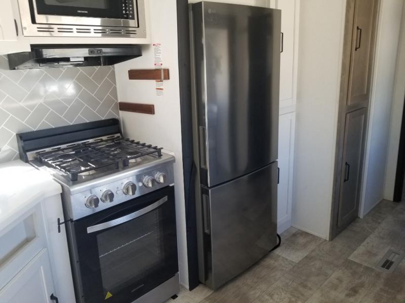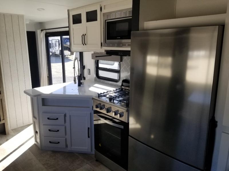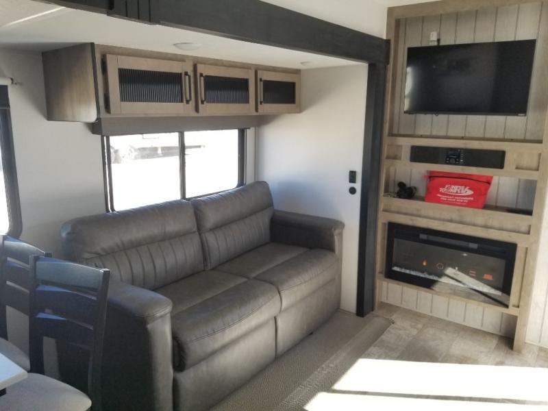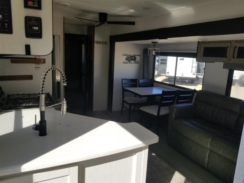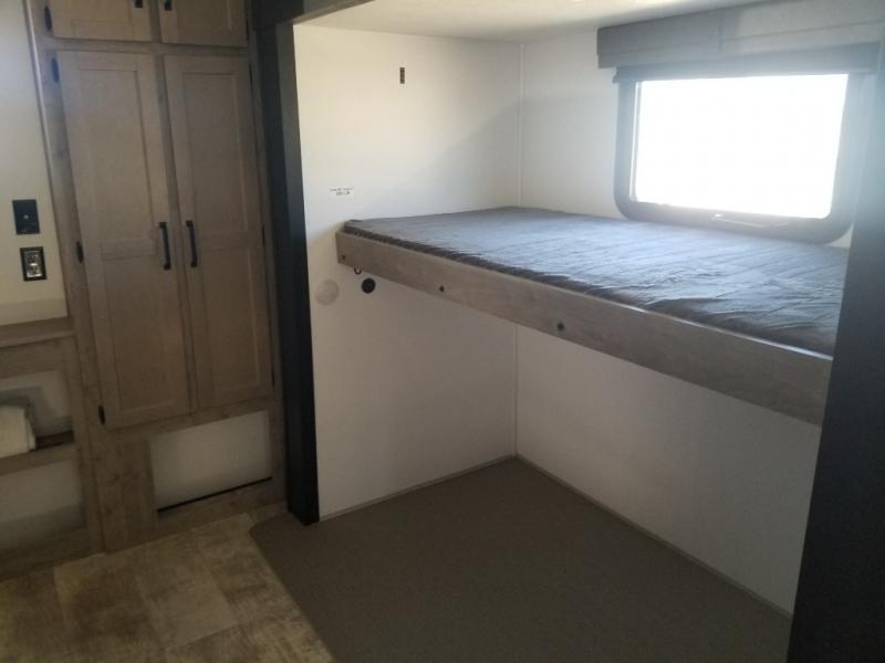 This destination trailer will probably be in the family for years to come with all of its features and amenities such as the rear private bunkhouse with a half bath attached, the dual entry doors for a smooth flow of traffic, and the spacious bedroom with a slide out king-size bed. There is even a closet with the option to add washer and dryer prep. The bunkhouse includes a slide out bunk with a jiffy sofa below, a slide out set of bunks, plus an entertainment center in between two wardrobes. The main living and kitchen area offers full amenities, a U-shaped dinette to dine at, and a sofa to relax on. You even have an optional outside kitchen to cook meals in the great outdoors!