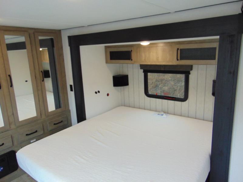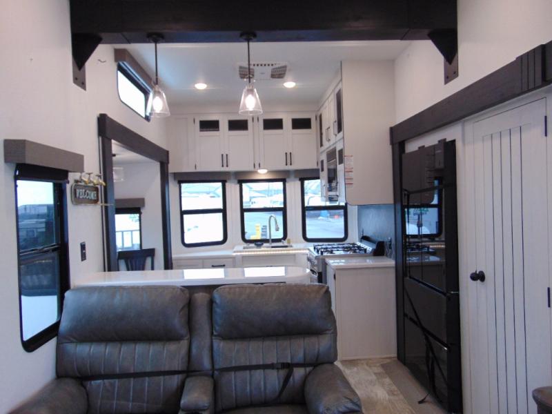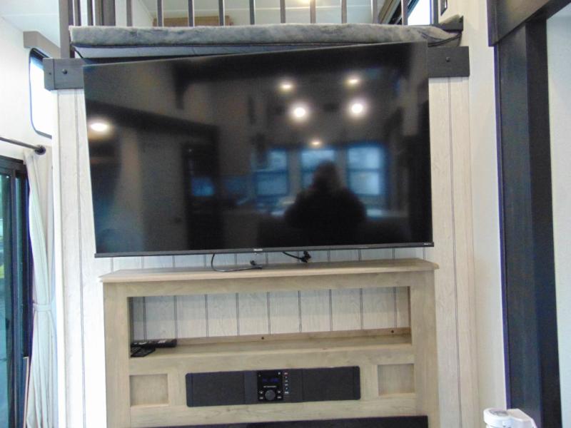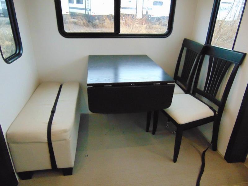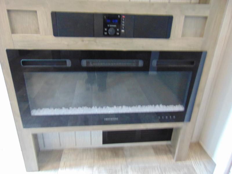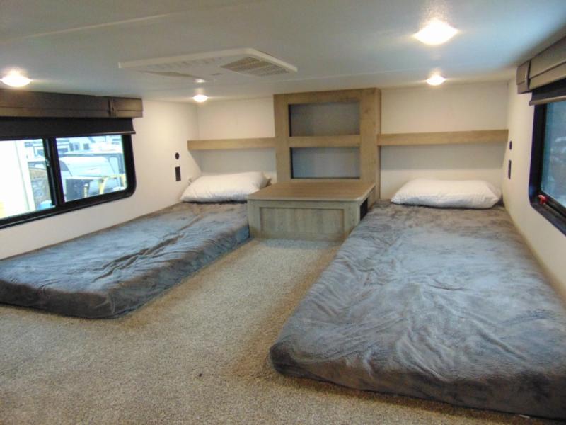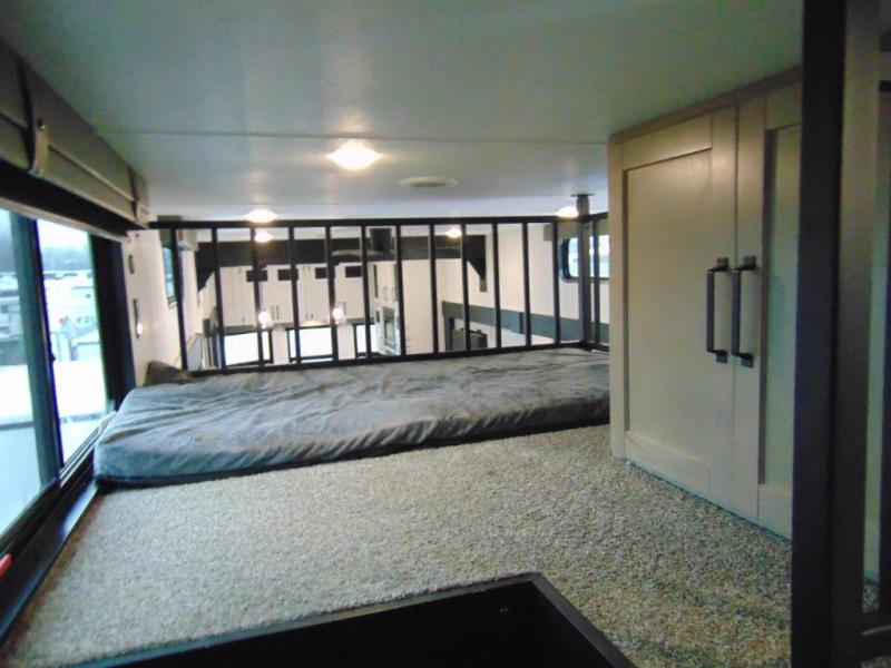 This is the perfect destination trailer for a larger group since it can sleep up to nine campers each night. The little ones will love the double loft areas with three bunk mats and storage space for their things, while you take the rear private bedroom. There is a king bed slide out here, along with a wardrobe/closet for your clothes, plus a second closet with the option to add washer and dryer prep. Everyone can meet in the middle living room to relax on the dual sofas or recliners across from the fireplace and entertainment center. Head to the front of the unit where you'll find the kitchen that includes ample counter space to prep meals, a residential style refrigerator and pantry for food storage, and a free-standing table to dine at. There is also a breakfast nook that overlooks the living area so you can visit with the cook and watch a movie at the same time!