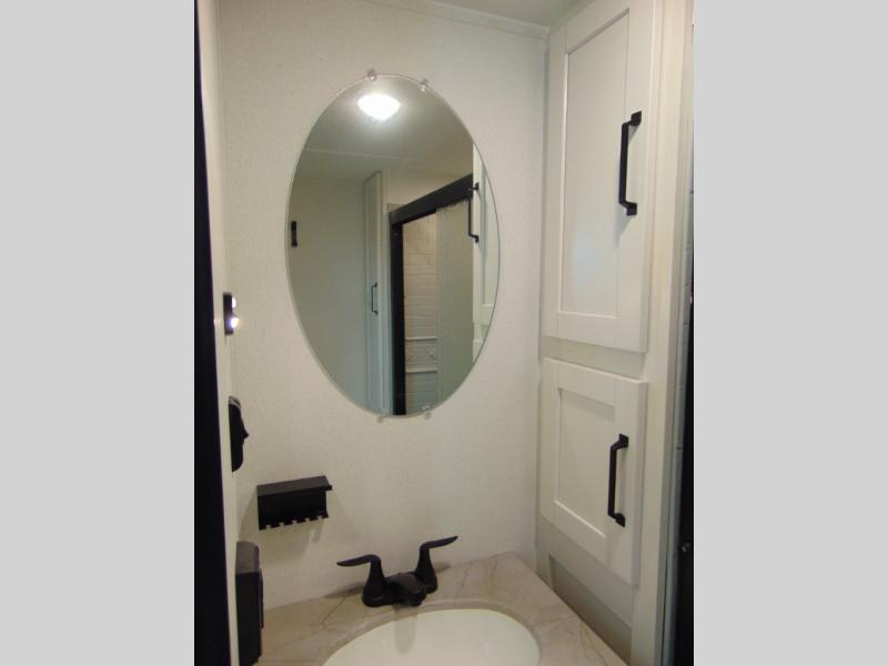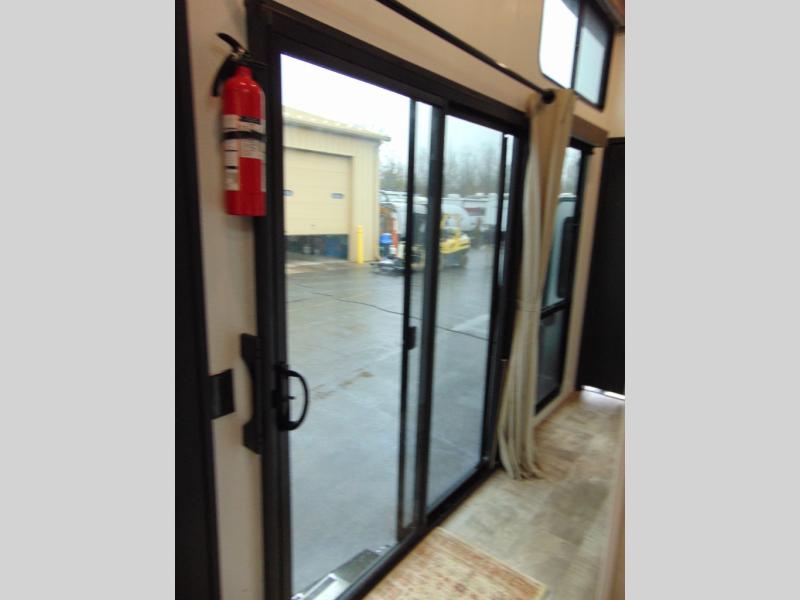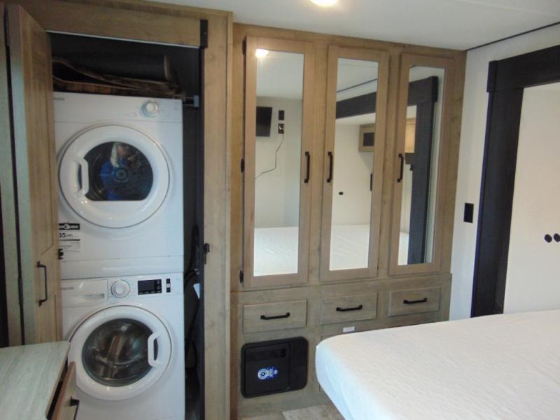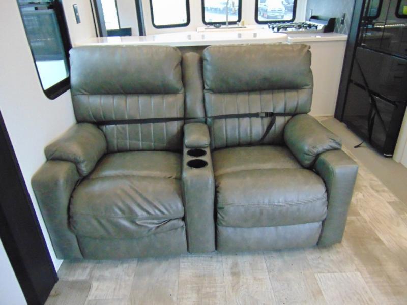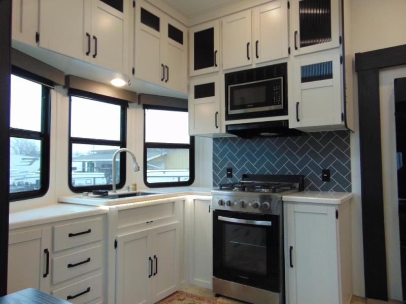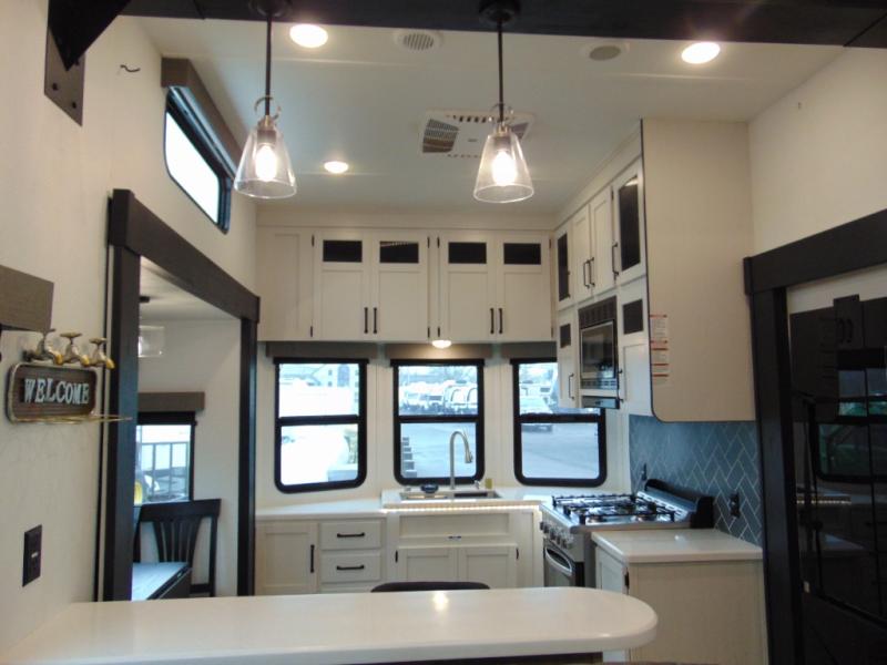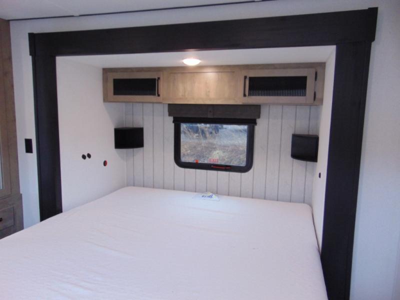 This is the perfect destination trailer for a larger group since it can sleep up to nine campers each night. The little ones will love the double loft areas with three bunk mats and storage space for their things, while you take the rear private bedroom. There is a king bed slide out here, along with a wardrobe/closet for your clothes, plus a second closet with the option to add washer and dryer prep. Everyone can meet in the middle living room to relax on the dual sofas or recliners across from the fireplace and entertainment center. Head to the front of the unit where you'll find the kitchen that includes ample counter space to prep meals, a residential style refrigerator and pantry for food storage, and a free-standing table to dine at. There is also a breakfast nook that overlooks the living area so you can visit with the cook and watch a movie at the same time!