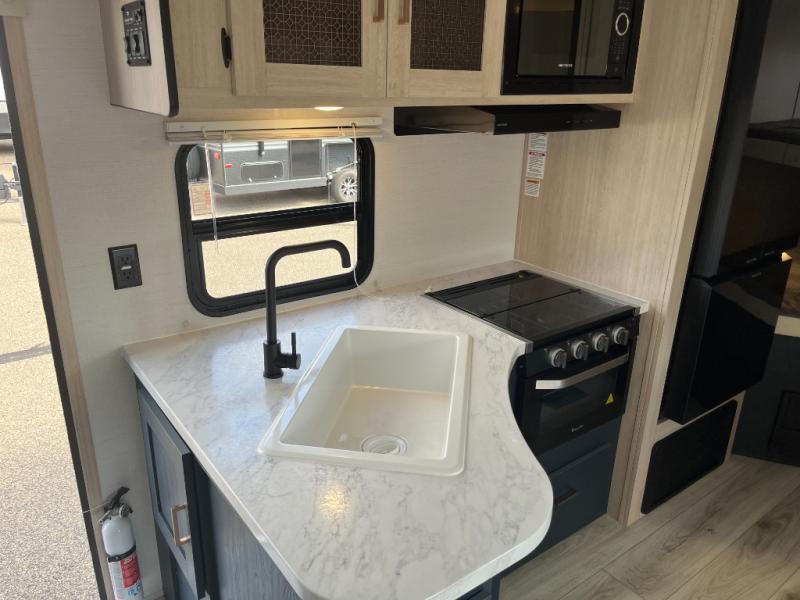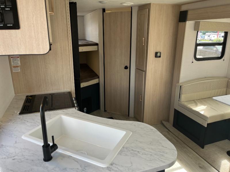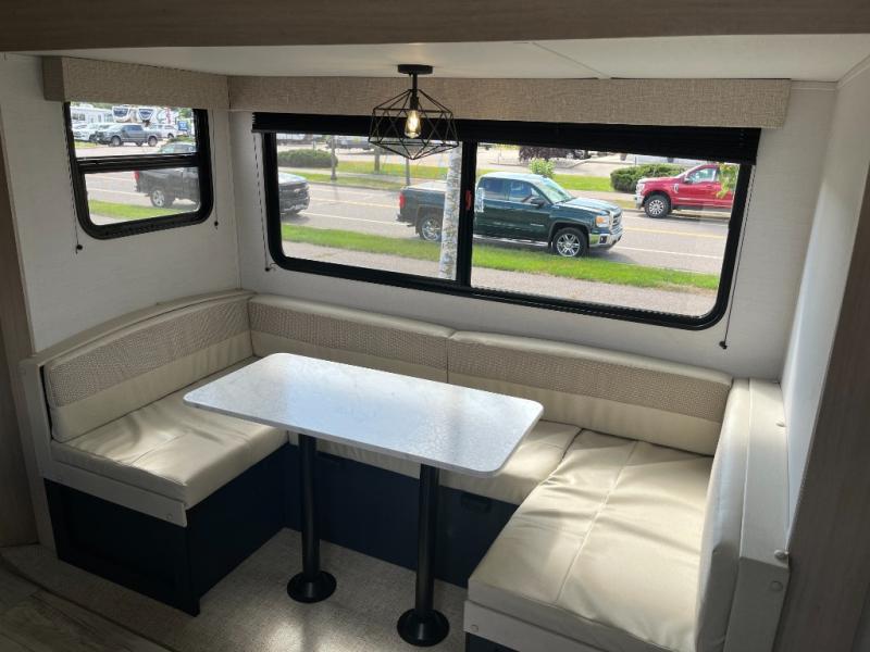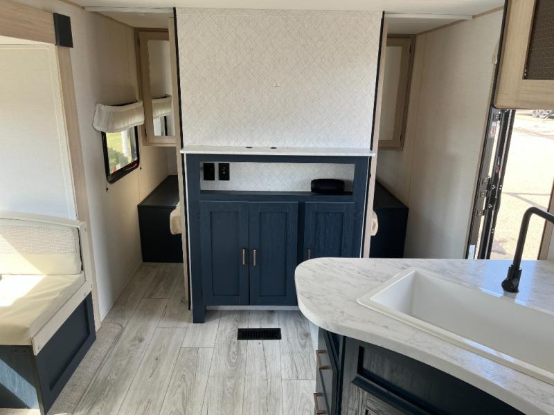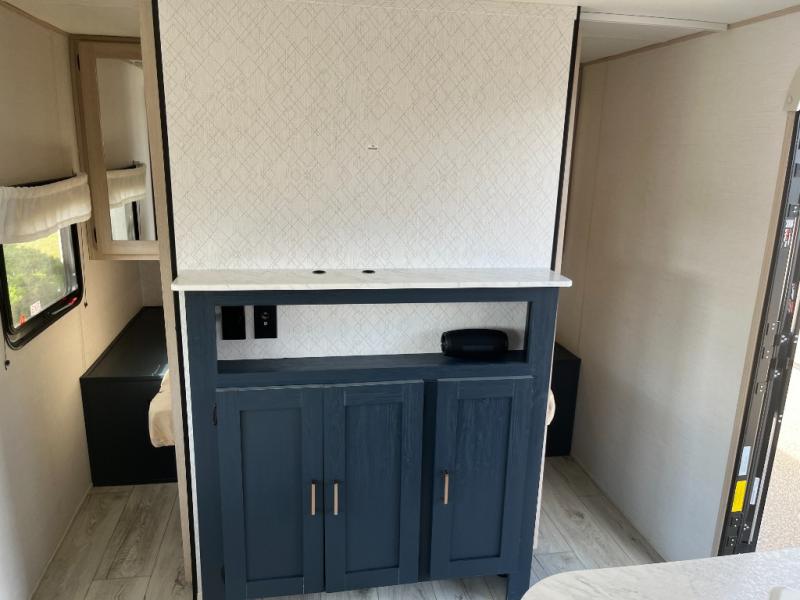 Gather the crew, load up and head out to enjoy a long-weekend at the state park! This trailer offers sleeping accommodations for eight because of the double-size bunks, the U-shaped dinette, and the queen bed. There is a rear corner full bathroom with a medicine cabinet to store personal belongings. You will find full kitchen amenities inside, as well as an outdoor kitchen where you can watch the kids play while making dinner. The single slide provides more living space in the interior, as well as extra sleeping space on the U-shaped dinette.