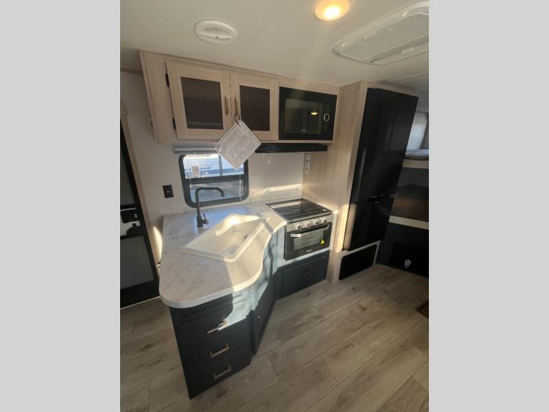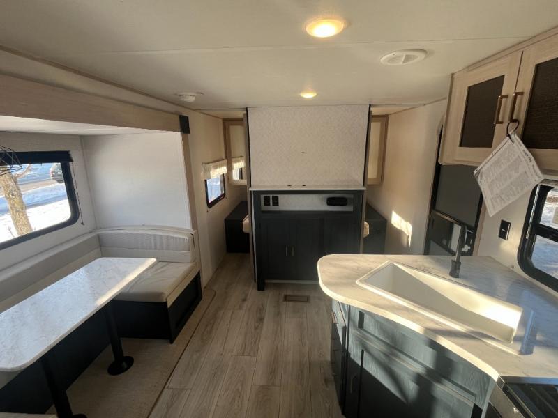 Gather the crew, load up and head out to enjoy a long-weekend at the state park! This trailer offers sleeping accommodations for eight because of the double-size bunks, the U-shaped dinette, and the queen bed. There is a rear corner full bathroom with a medicine cabinet to store personal belongings. You will find full kitchen amenities inside, as well as an outdoor kitchen where you can watch the kids play while making dinner. The single slide provides more living space in the interior, as well as extra sleeping space on the U-shaped dinette.