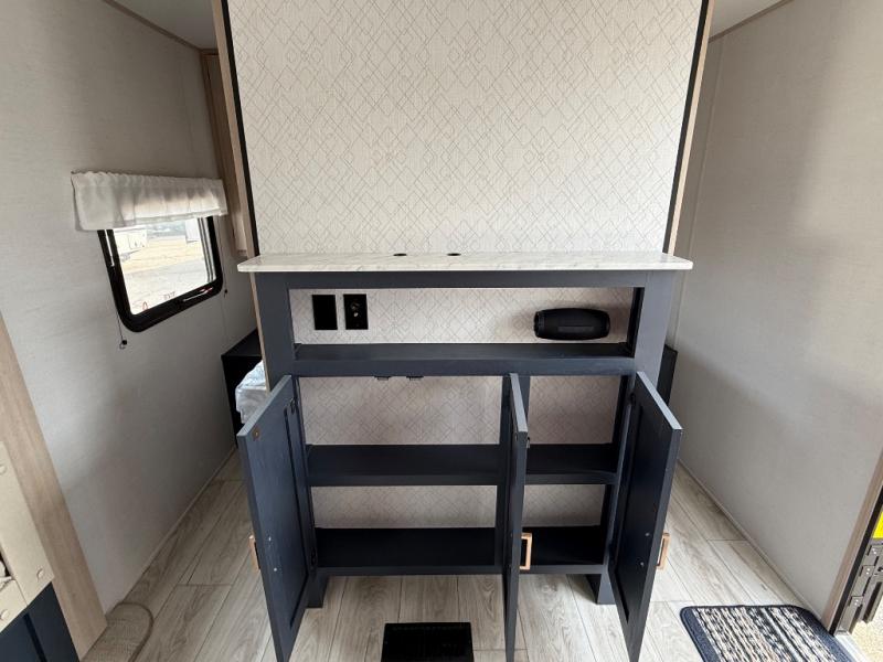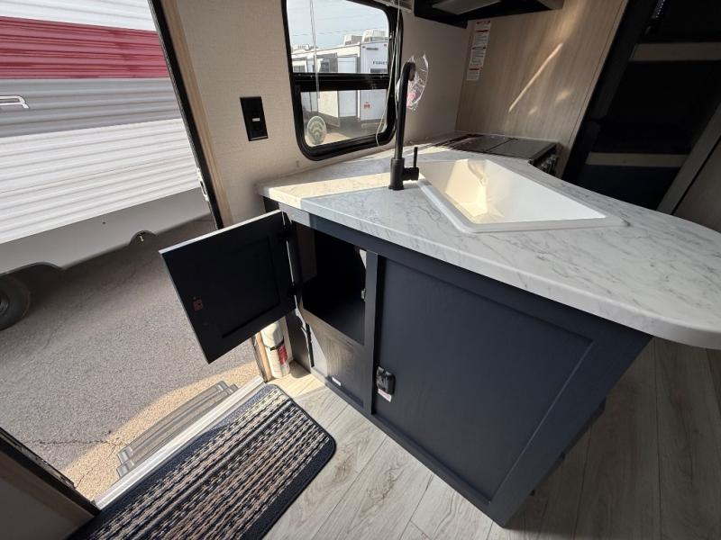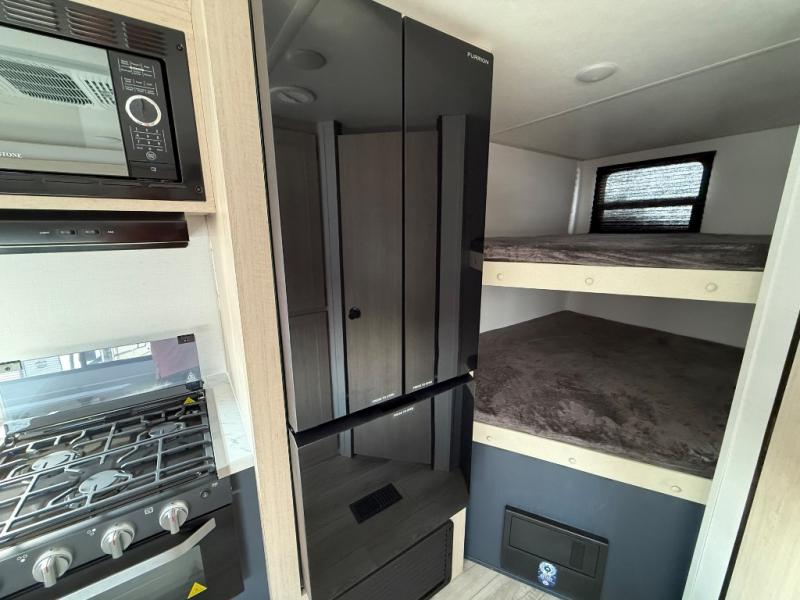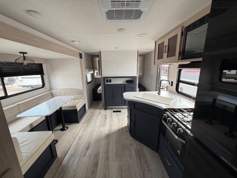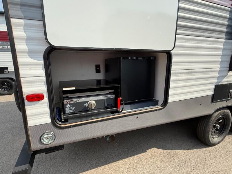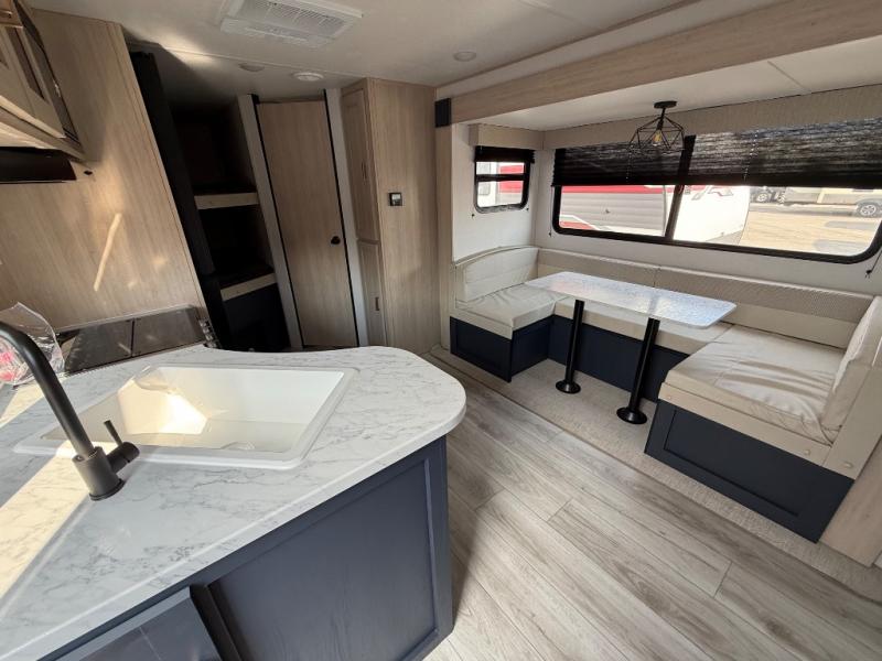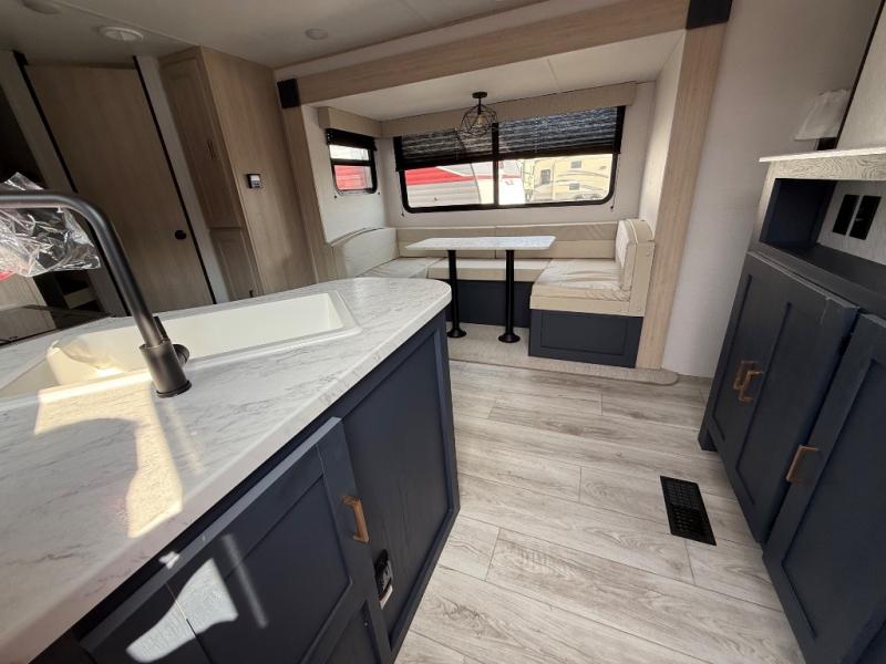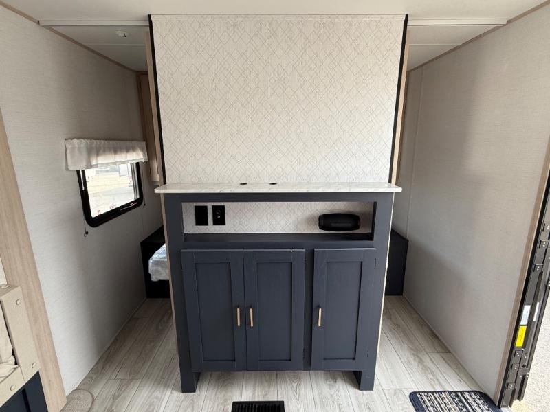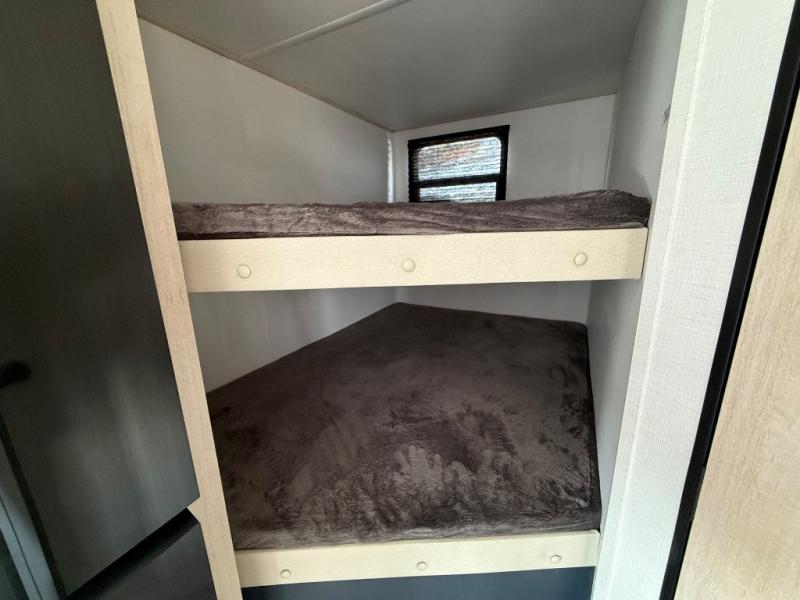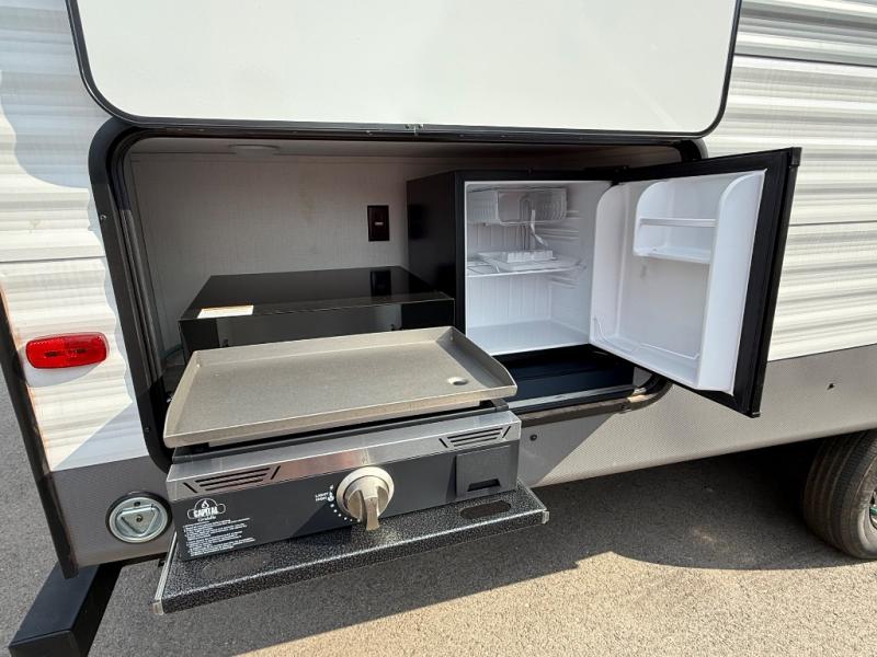 Gather the crew, load up and head out to enjoy a long-weekend at the state park! This trailer offers sleeping accommodations for eight because of the double-size bunks, the U-shaped dinette, and the queen bed. There is a rear corner full bathroom with a medicine cabinet to store personal belongings. You will find full kitchen amenities inside, as well as an outdoor kitchen where you can watch the kids play while making dinner. The single slide provides more living space in the interior, as well as extra sleeping space on the U-shaped dinette.