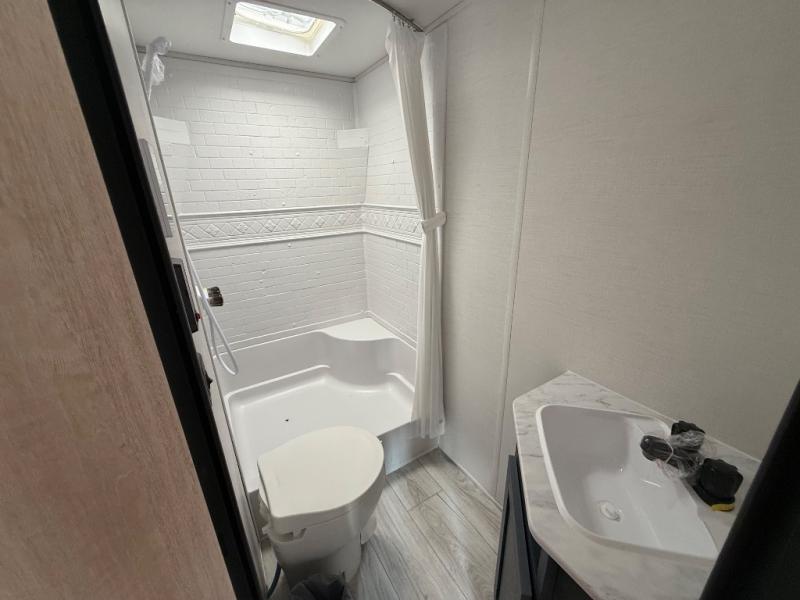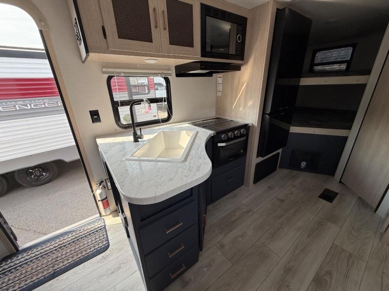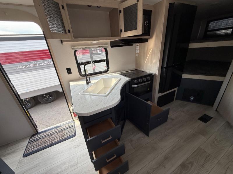 With any Avenger LE travel trailer by Prime Time RV you will enjoy at-home comforts while at the campground! Durable construction begins with an enclosed and heated underbelly, a one-piece roof membrane, and diamond plate front rock guard for added protection against debris during transport. There are also locking magnetic latches on the baggage doors, fully vented windows throughout, four stabilizer jacks, plus solar prep if you want the option to go off-grid. The interior will have you feeling right at home with residential extended ball bearing drawer glides, seamless Carefree Congoleum flooring, an XL single basin kitchen sink, and shower pans in all models that will make it easy to get in and out of the bath. Some of the convenient appliances and equipment you will appreciate are the 15,000 BTU A/C, 12V high-capacity water pump, Slim Profile range hood, and the Winegard 360+ antenna with Wi-Fi prep!