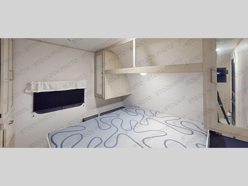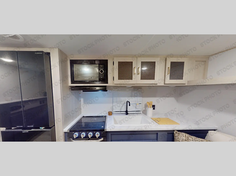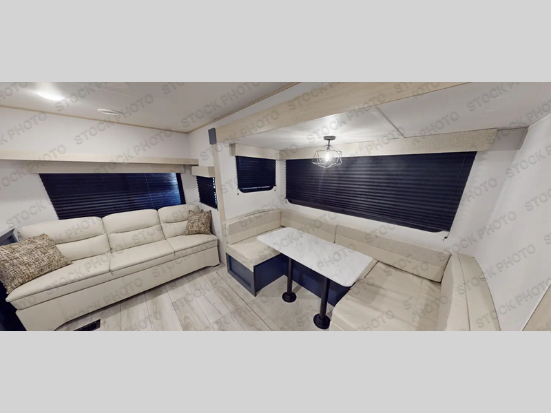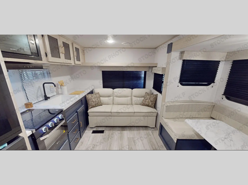 Relax indoors at your campsite in this spacious rear living area trailer that offers a U-shaped dinette slide and a rear sofa. This combined living and kitchen area also offers the cook counter space, a deep basin sink, and full amenities to whip up a meal while everyone enjoys the entertainment center. There is a full bathroom with easy access from this area as well as the entry. And the front private bedroom offers a queen bed and three wardrobes to hold your belongings.