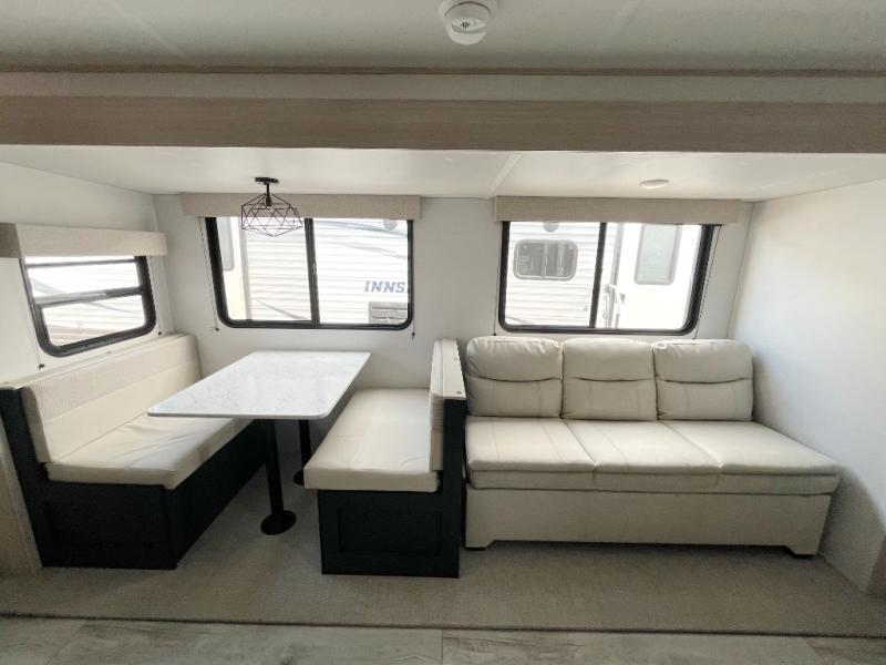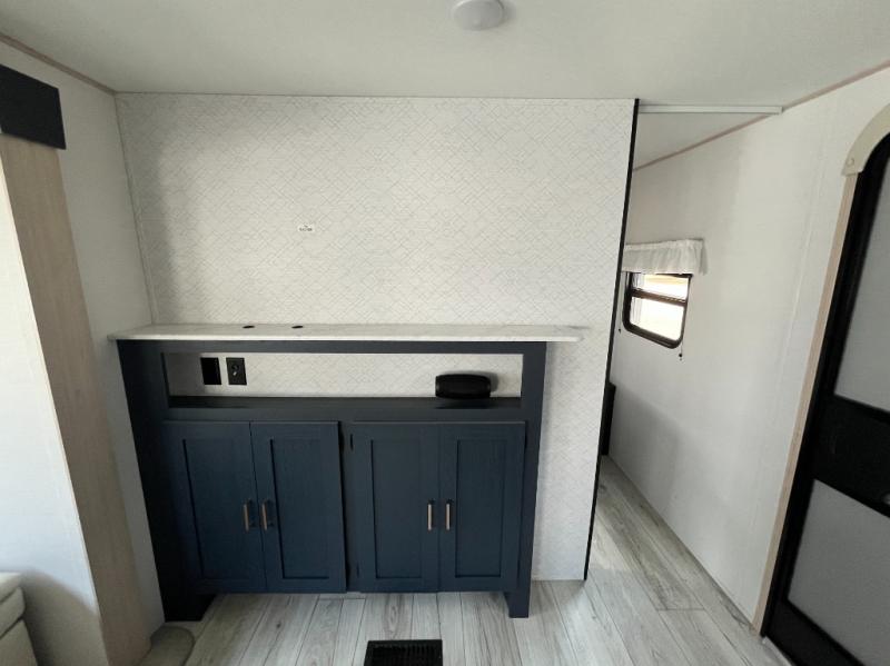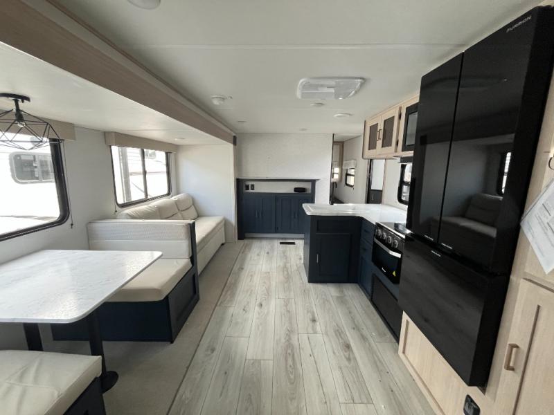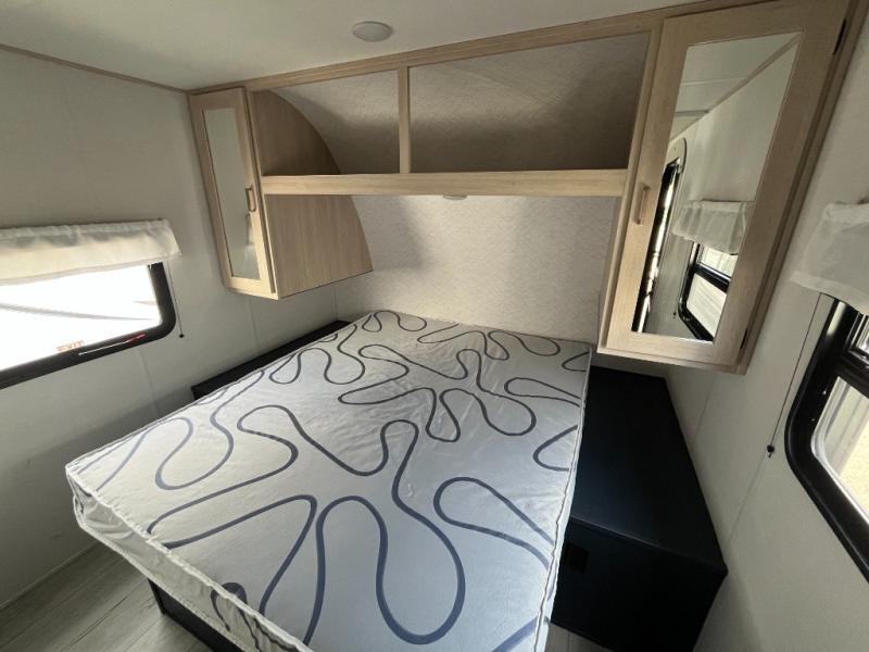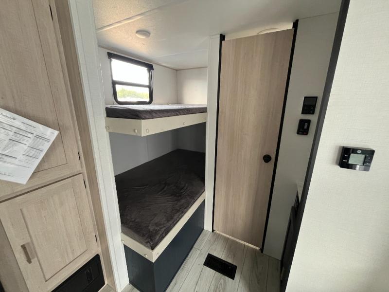 Looking for a trailer that houses everyone? This trailer offers lots of sleeping choices with a set of double-size bunks, a queen bed and furniture that doubles as sleeping space! You will also appreciate the added interior space thanks to the large slide in the living area that features a booth dinette and sofa. Up front, there is a private bedroom where you can retreat to at night away from the bunks in the back, and the bedroom features ample storage with dual wardrobes and an overhead shelf for your things.