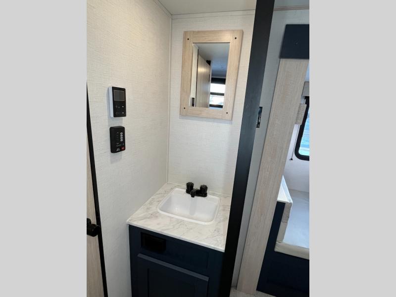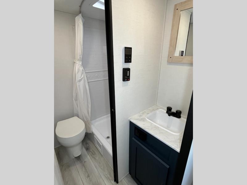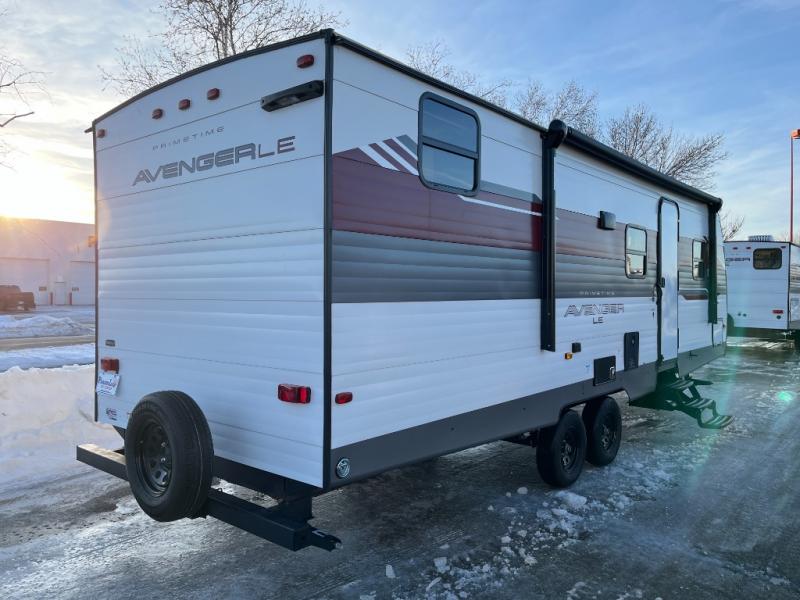 With any Avenger LE travel trailer by Prime Time RV you will enjoy at-home comforts while at the campground! Durable construction begins with an enclosed and heated underbelly, a one-piece roof membrane, and diamond plate front rock guard for added protection against debris during transport. There are also locking magnetic latches on the baggage doors, fully vented windows throughout, four stabilizer jacks, plus solar prep if you want the option to go off-grid. The interior will have you feeling right at home with residential extended ball bearing drawer glides, seamless Carefree Congoleum flooring, an XL single basin kitchen sink, and shower pans in all models that will make it easy to get in and out of the bath. Some of the convenient appliances and equipment you will appreciate are the 15,000 BTU A/C, 12V high-capacity water pump, Slim Profile range hood, and the Winegard 360+ antenna with Wi-Fi prep!