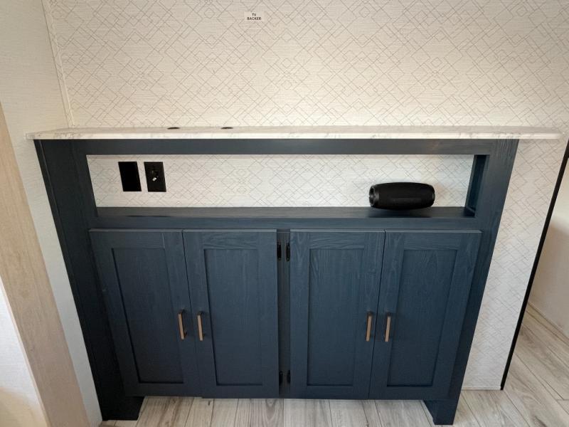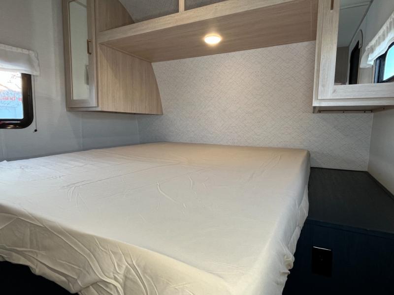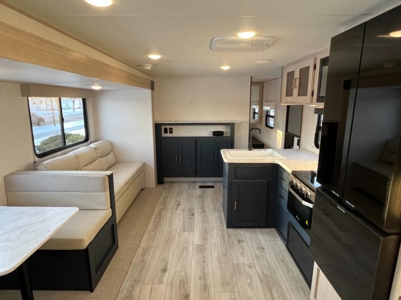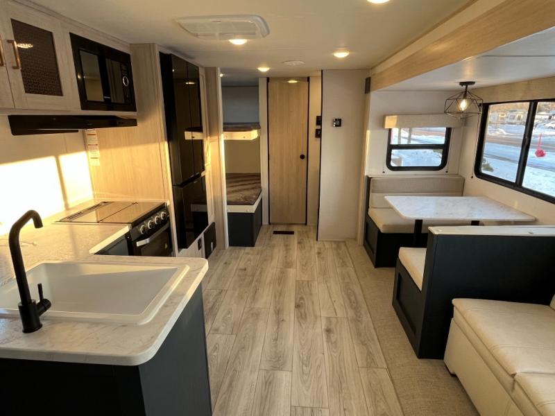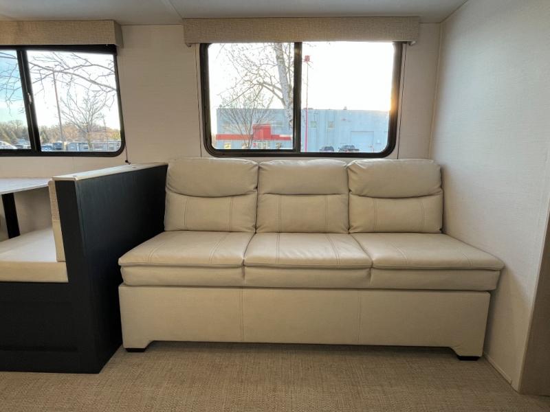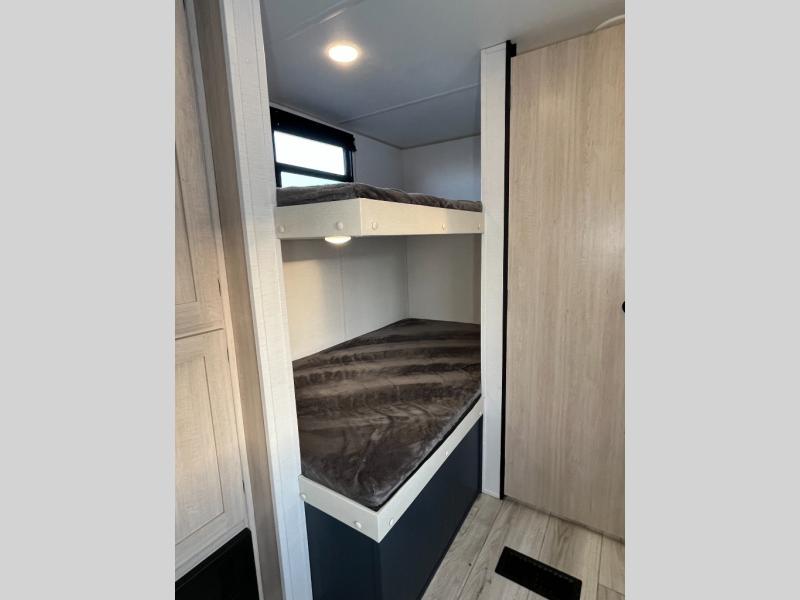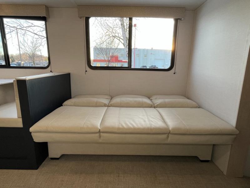 Looking for a trailer that houses everyone? This trailer offers lots of sleeping choices with a set of double-size bunks, a queen bed and furniture that doubles as sleeping space! You will also appreciate the added interior space thanks to the large slide in the living area that features a booth dinette and sofa. Up front, there is a private bedroom where you can retreat to at night away from the bunks in the back, and the bedroom features ample storage with dual wardrobes and an overhead shelf for your things.
