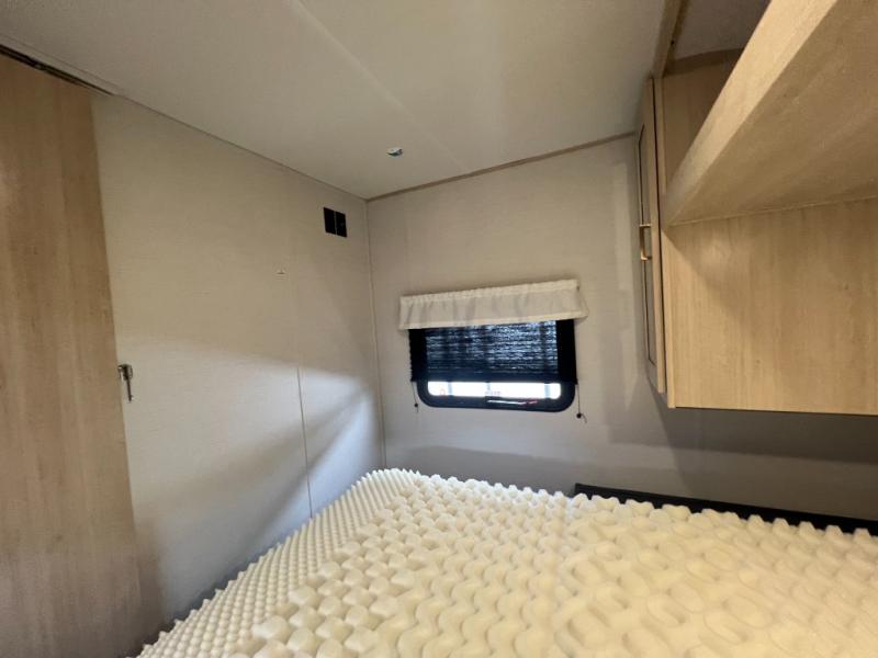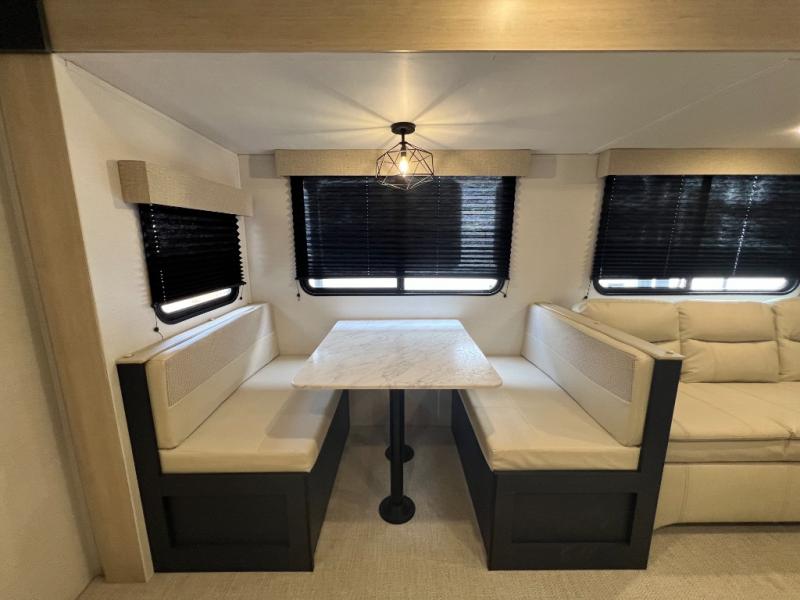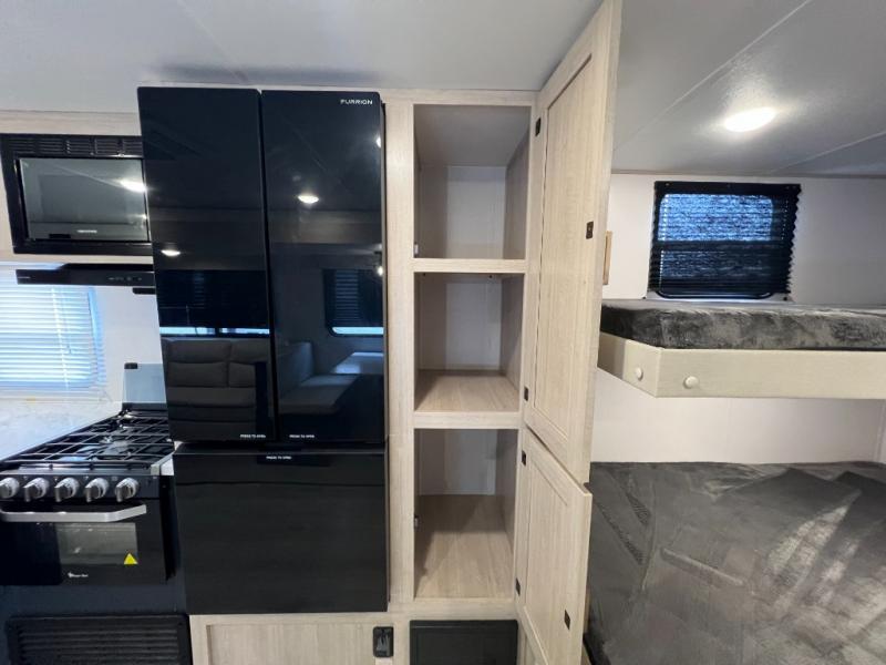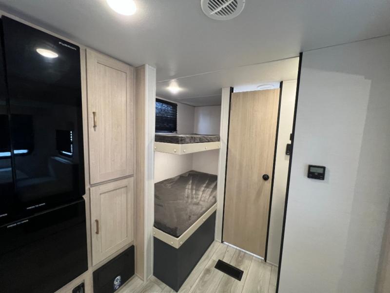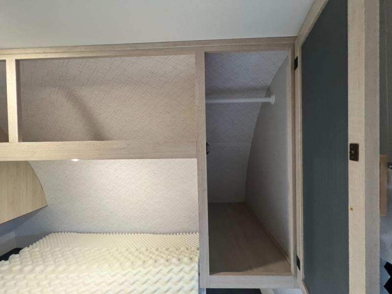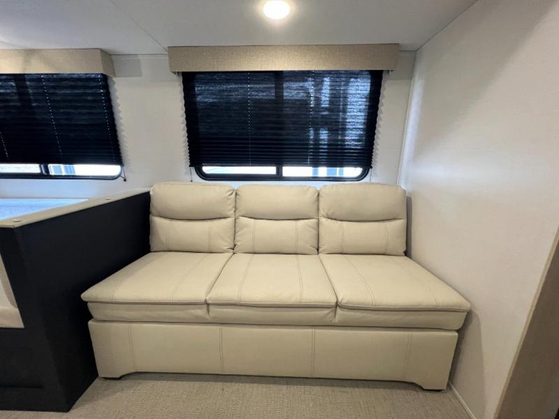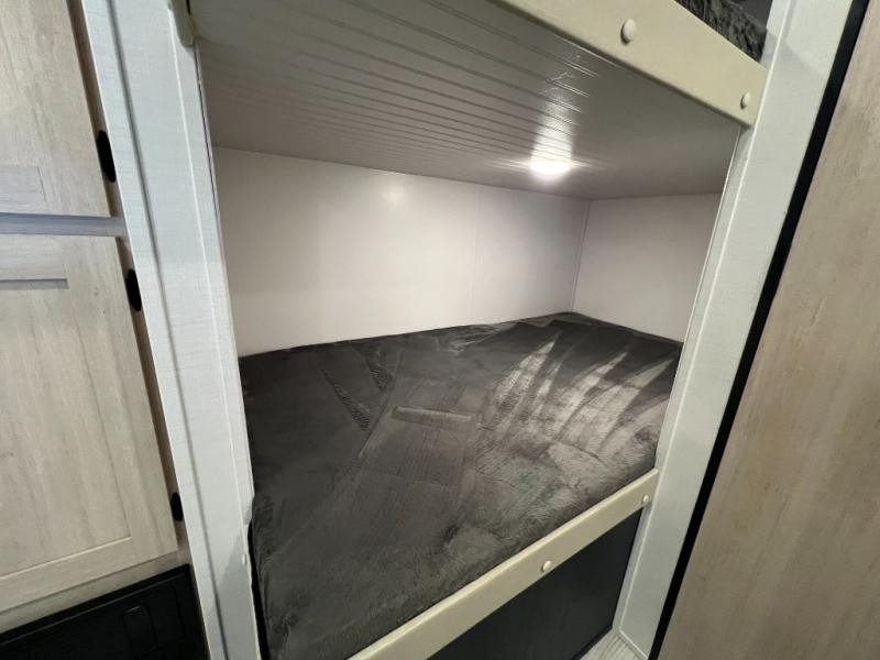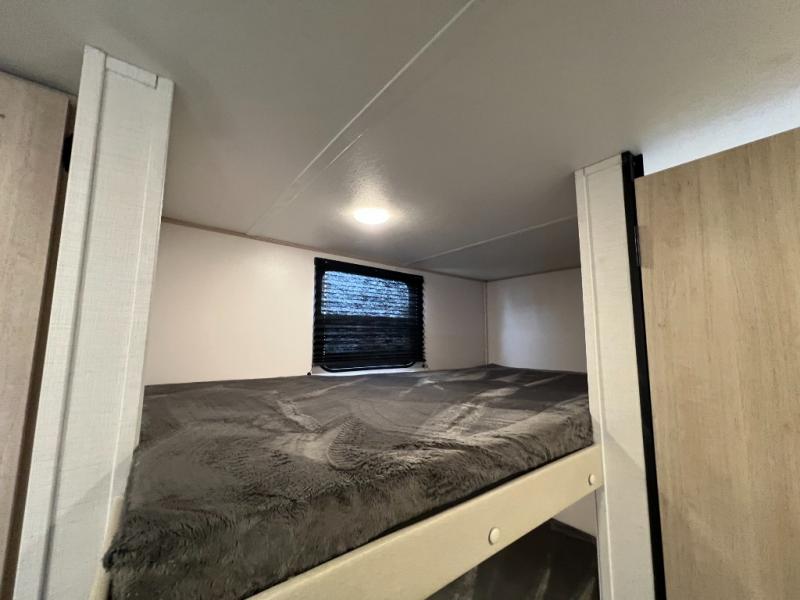 Looking for a trailer that houses everyone? This trailer offers lots of sleeping choices with a set of double-size bunks, a queen bed and furniture that doubles as sleeping space! You will also appreciate the added interior space thanks to the large slide in the living area that features a booth dinette and sofa. Up front, there is a private bedroom where you can retreat to at night away from the bunks in the back, and the bedroom features ample storage with dual wardrobes and an overhead shelf for your things.