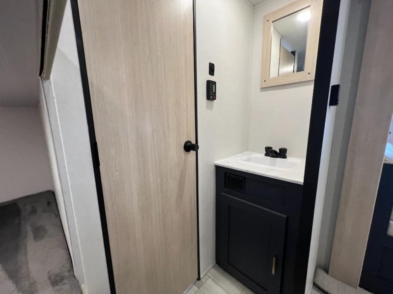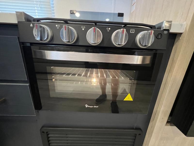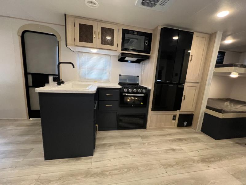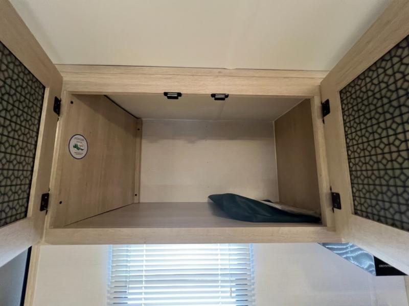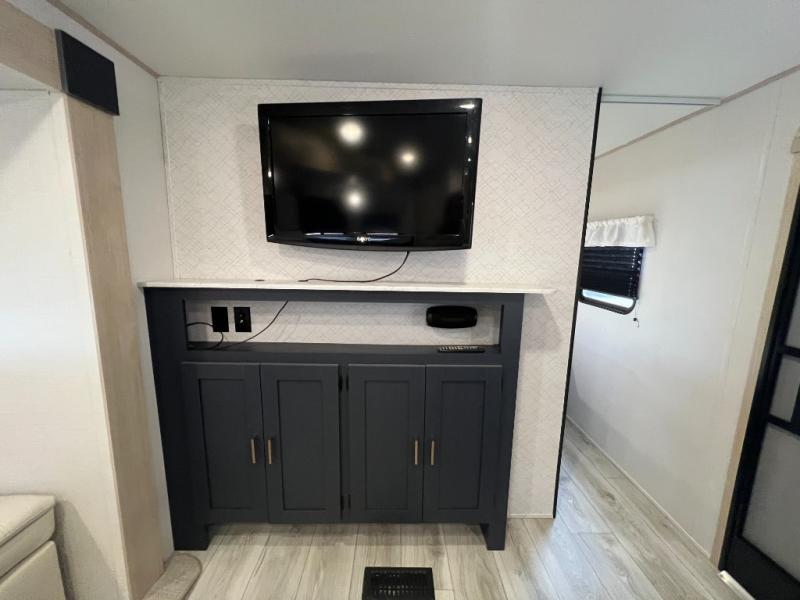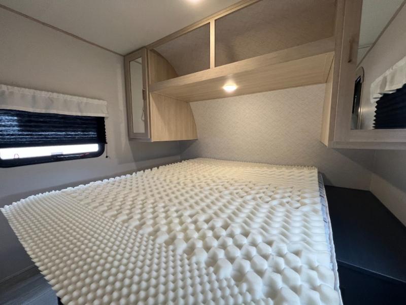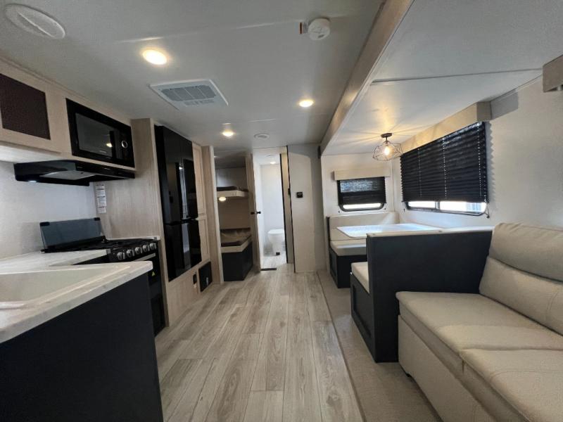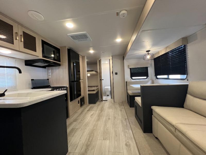 Looking for a trailer that houses everyone? This trailer offers lots of sleeping choices with a set of double-size bunks, a queen bed and furniture that doubles as sleeping space! You will also appreciate the added interior space thanks to the large slide in the living area that features a booth dinette and sofa. Up front, there is a private bedroom where you can retreat to at night away from the bunks in the back, and the bedroom features ample storage with dual wardrobes and an overhead shelf for your things.