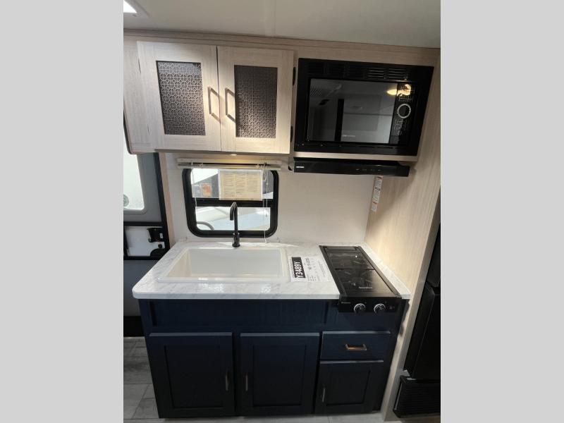 With any Avenger LT travel trailer by Prime Time, the exterior includes an aerodynamic smooth front metal, a front diamond plate for protection on the road, and two stabilizer jacks. There is also exclusive Everlast construction, a PVC roof membrane, and solar prep for the option to go off-grid. The interior offers seamless Carefree Congoleum flooring for easy cleanup and durability, pleated night shades throughout for privacy, a bottle opener, and residential extended ball bearing drawer guides.