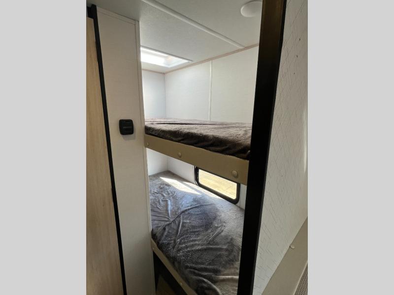 Compact and loaded with comfort and convenience for you to enjoy each and every camping trip! Because this trailer is easily towable, you'll be ready in no time. After a day of hiking, the kids will love sleeping on the bunk beds, and you can sleep on the front bed. And with enough storage space for your valuables and board games, this trailer makes camping easy!