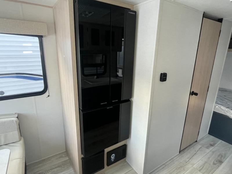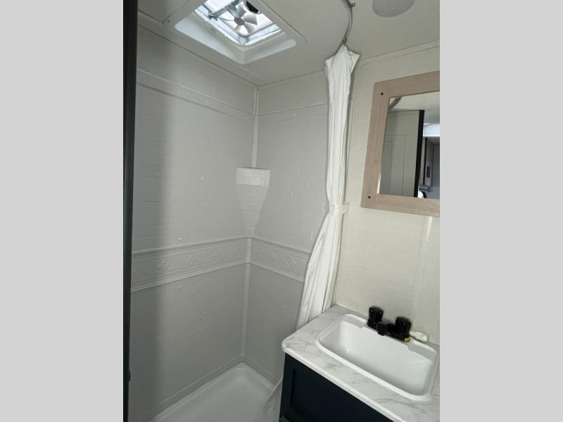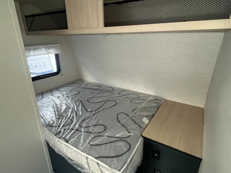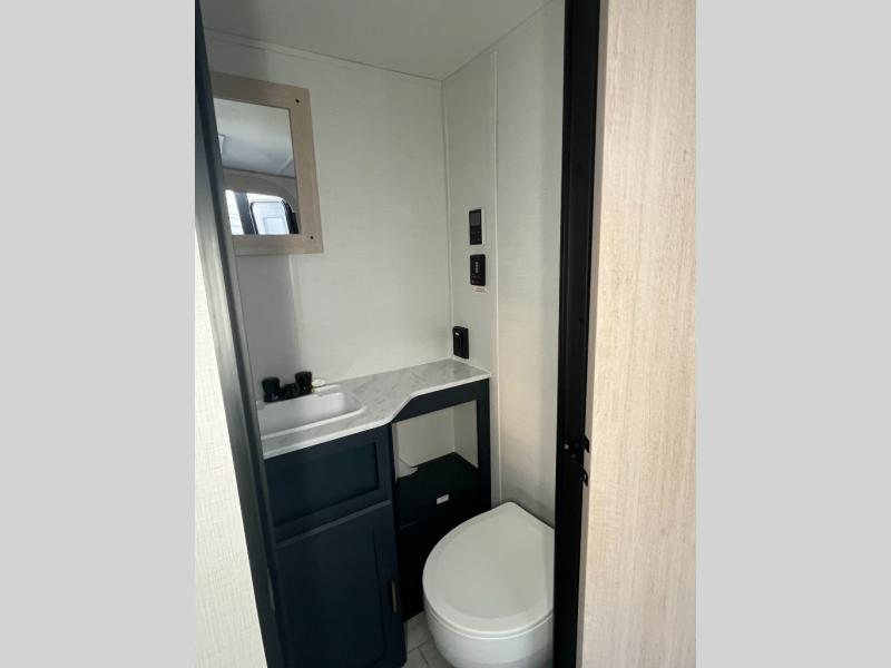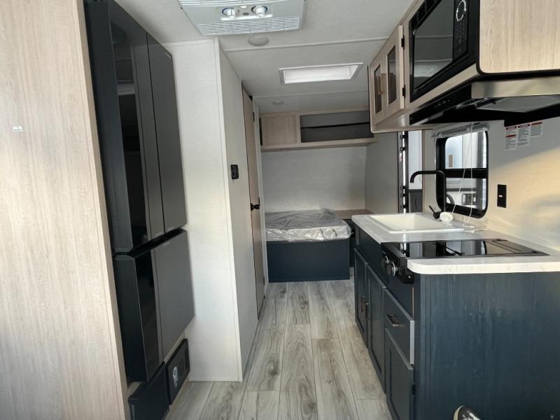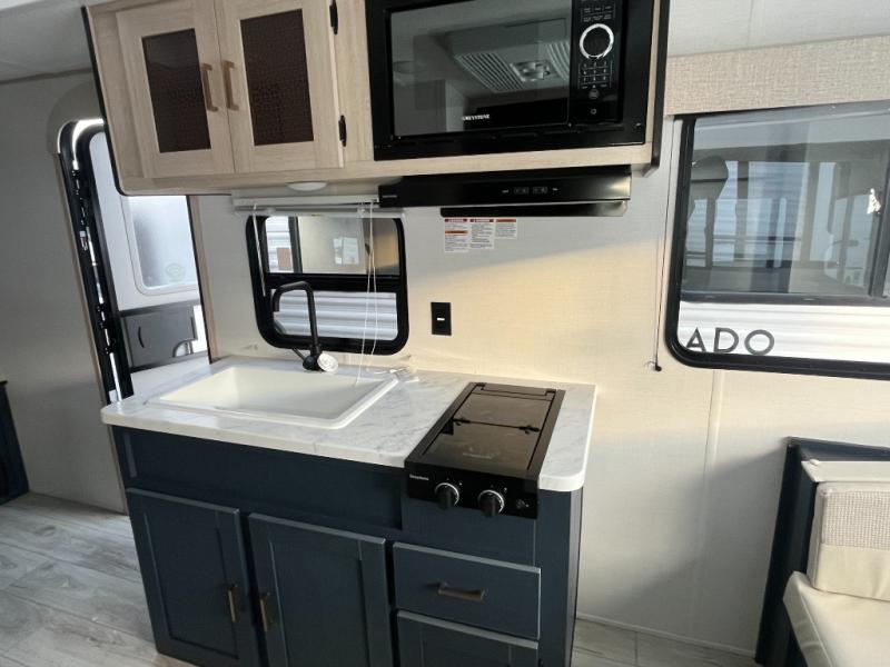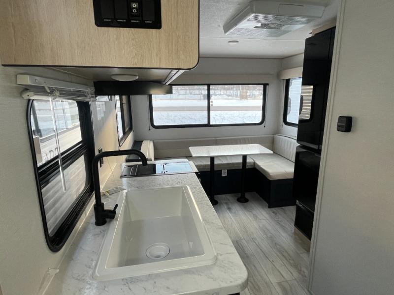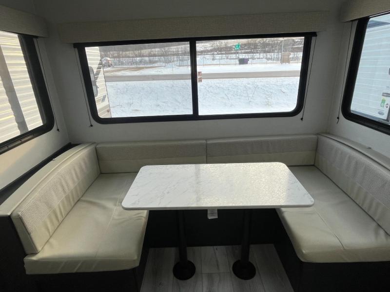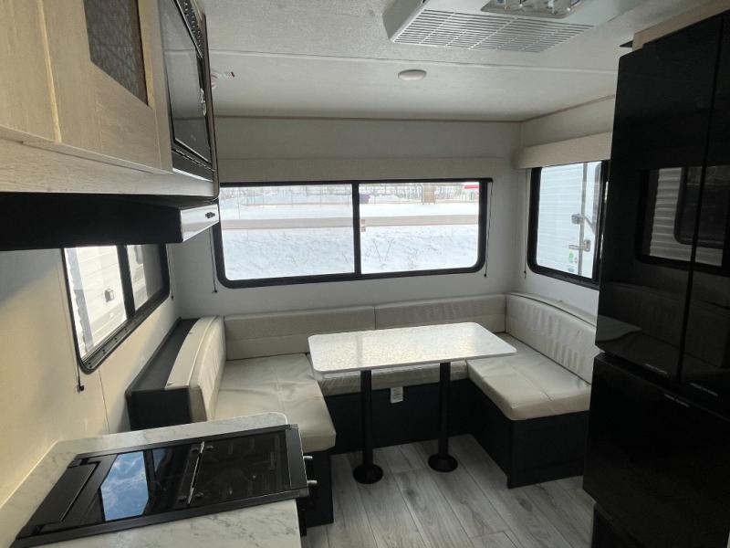 Camping with your friends or family doesn't have to be hard! This easy-to-tow, store and clean up RV allows two to four people to sleep comfortably on the U-shaped dinette along the rear wall with a large window and the front bed with nightstand. The kitchen includes a 10.7 cu. ft. 12V refrigerator, a microwave, plus a two-burner cooktop for preparing meals just like you do at home.