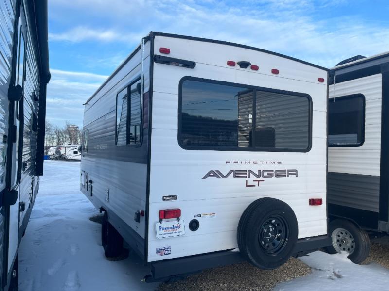 With any Avenger LT travel trailer by Prime Time, the exterior includes an aerodynamic smooth front metal, a front diamond plate for protection on the road, and two stabilizer jacks. There is also exclusive Everlast construction, a PVC roof membrane, and solar prep for the option to go off-grid. The interior offers seamless Carefree Congoleum flooring for easy cleanup and durability, pleated night shades throughout for privacy, a bottle opener, and residential extended ball bearing drawer guides.