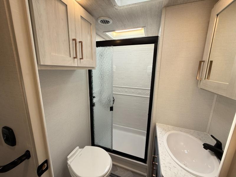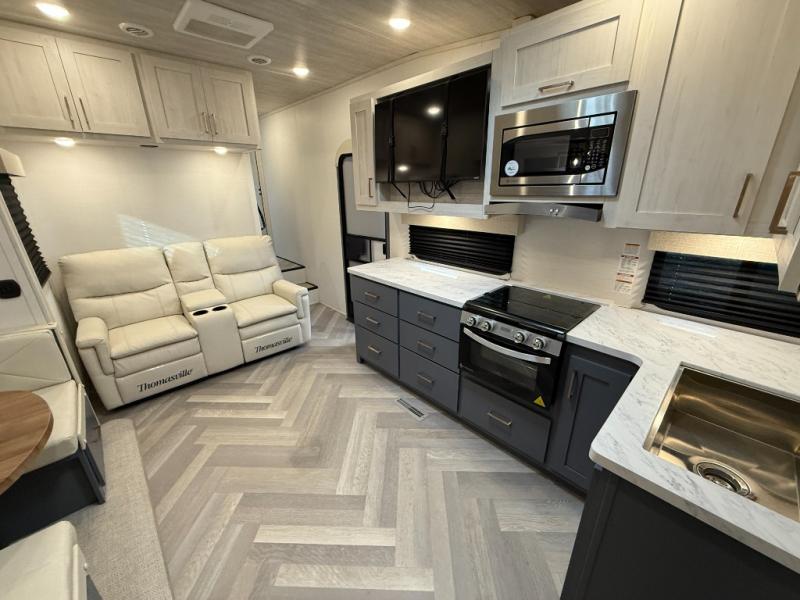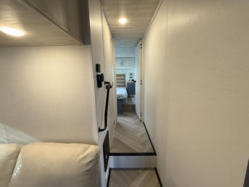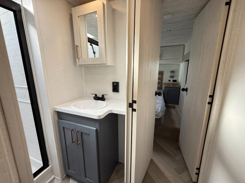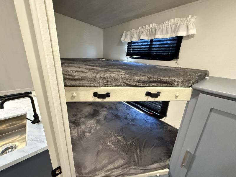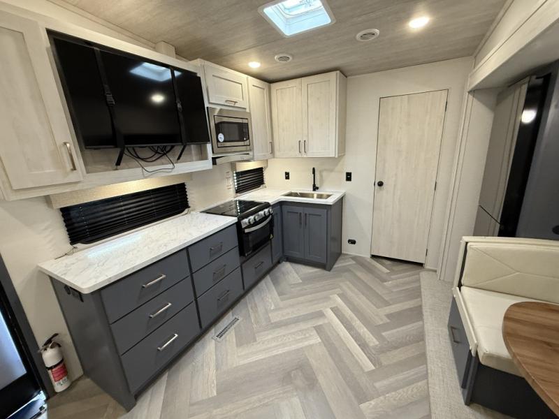 Camping with a larger group has never been easier than with this fifth wheel. There is a rear private bunkhouse that includes bunk beds with lower doggy storage to keep items organized. You will feel right at home in the front private bedroom that includes a queen bed, a wardrobe, and dual nightstands. The combined living and kitchen is cozy with its theater seating and booth dinette, plus there is a 40" LED Smart TV to make it a movie night. Everyone will also appreciate having a full bath onboard to stay clean throughout each trip!