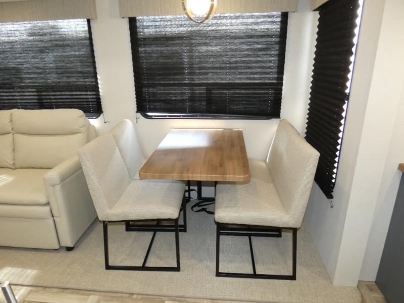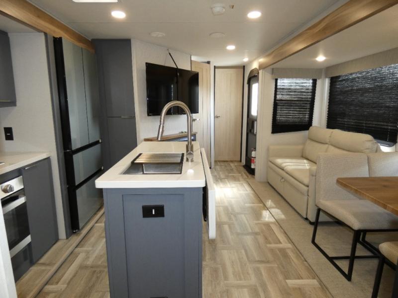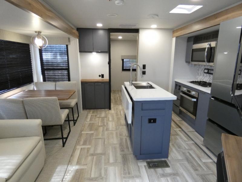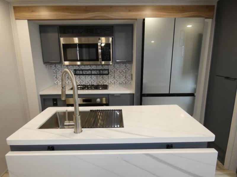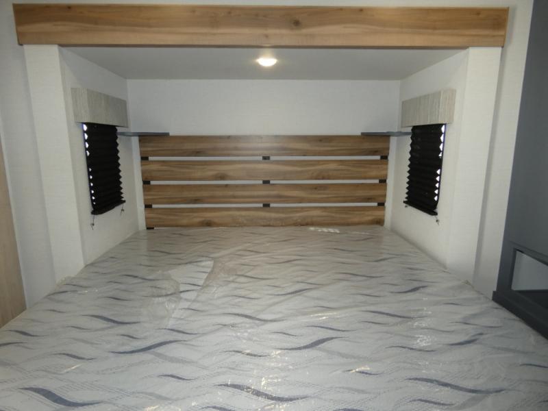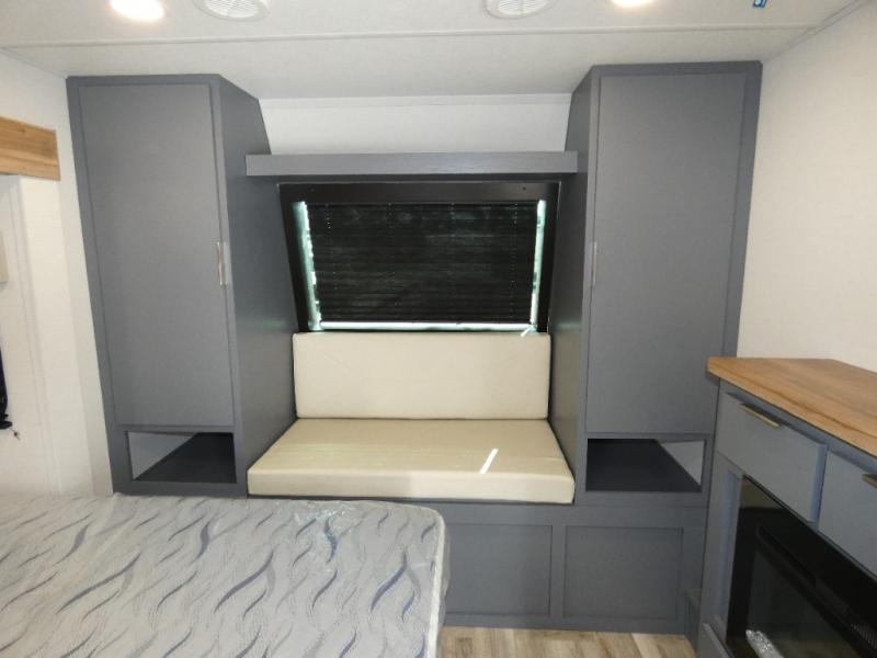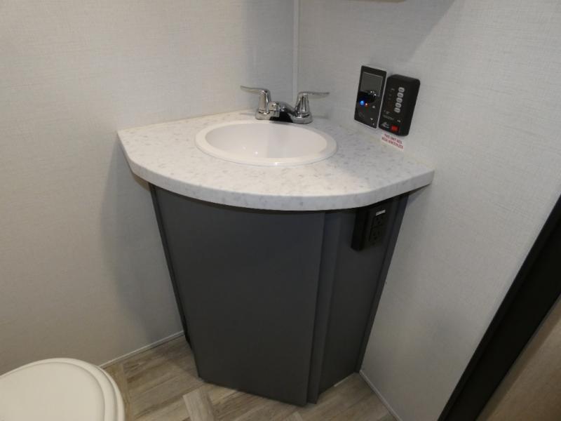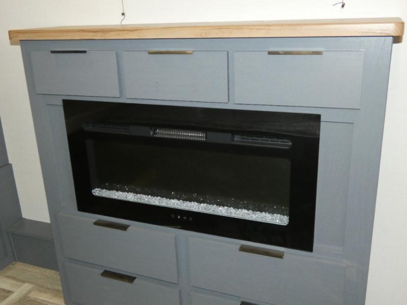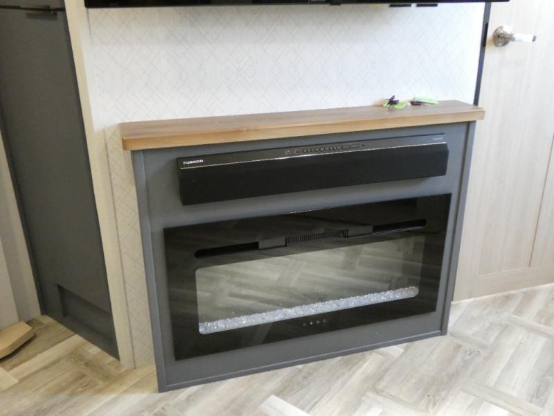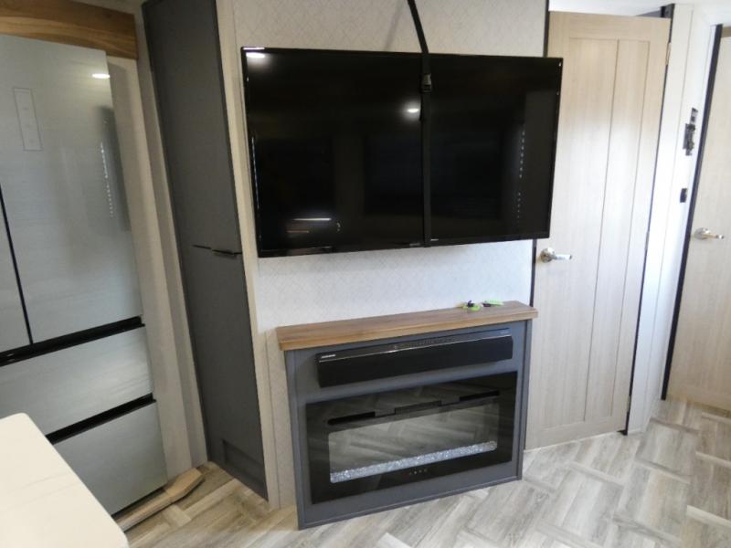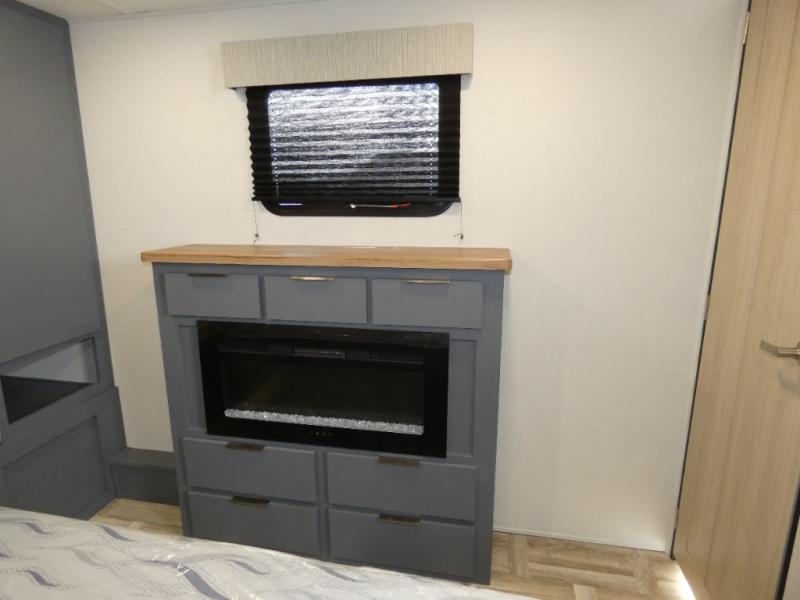 Privacy abounds in this travel trailer with a bedroom at each end! A king bed slide in the front has its own fireplace for cozy nights. Dual wardrobes frame the reading bench which looks out the front window for peaceful moments appreciating the view. At the rear, a second bedroom with queen bed has its own half bath. A pantry closet here also has prep for an optional washer/dryer for convenience on the road. In the center everyone can meet up in the spacious kitchen/living room. A hide-a-bed sofa has even more sleeping space, or relax there and watch the TV which is in the entertainment center along with another fireplace. The kitchen is well-equipped with a three-burner cooktop, microwave, and even an island where the sink is located for easy meal prep. Outside there are not one but two 10' power awnings for extra protection from the elements!