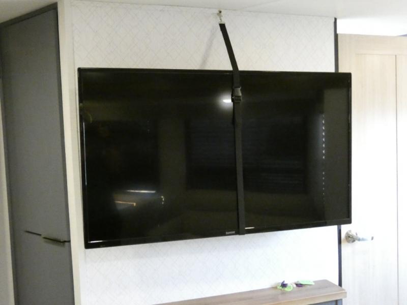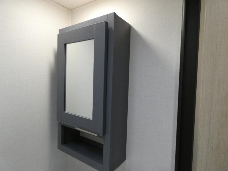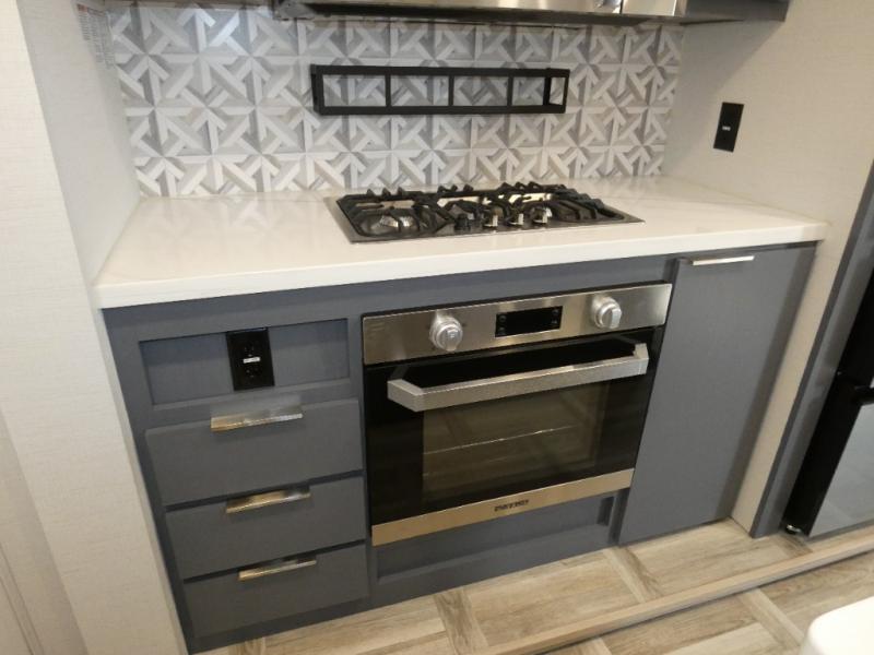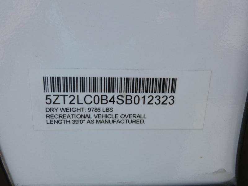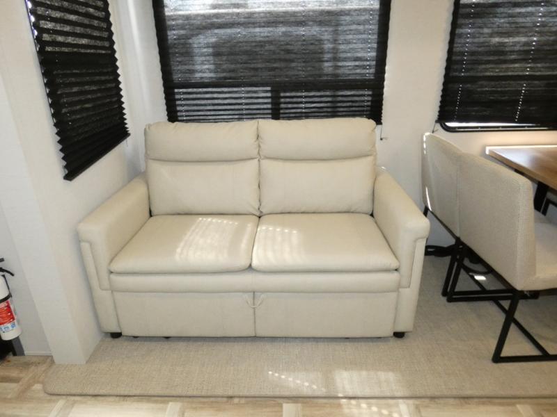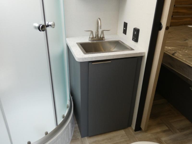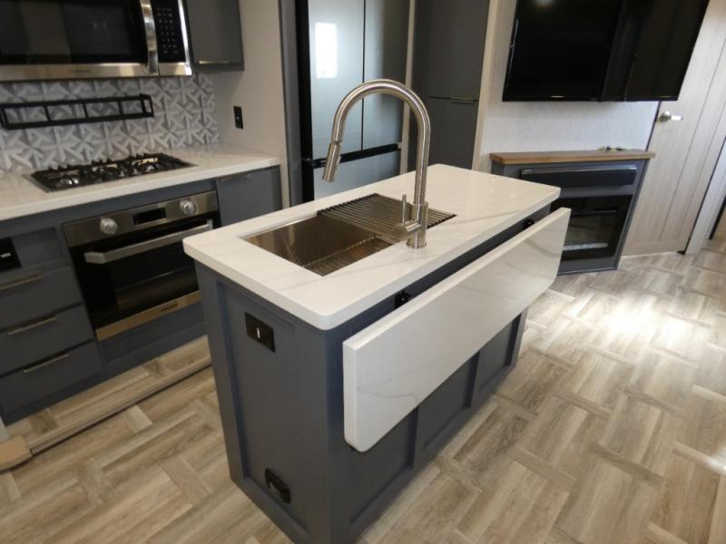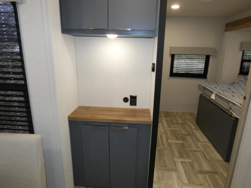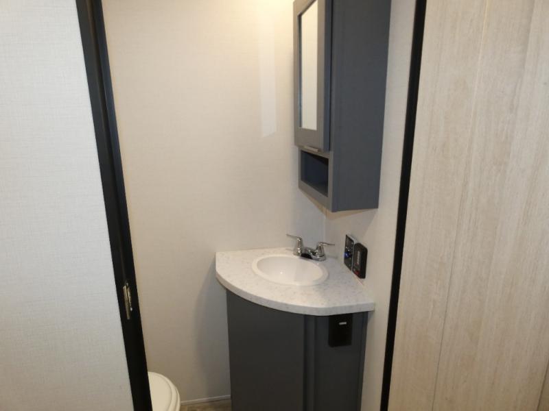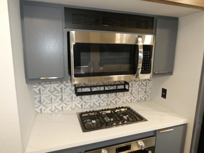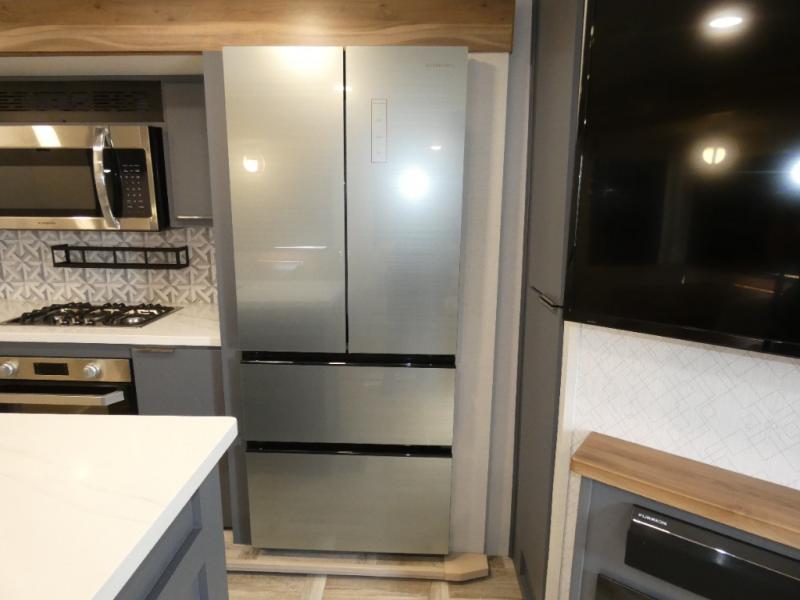 Privacy abounds in this travel trailer with a bedroom at each end! A king bed slide in the front has its own fireplace for cozy nights. Dual wardrobes frame the reading bench which looks out the front window for peaceful moments appreciating the view. At the rear, a second bedroom with queen bed has its own half bath. A pantry closet here also has prep for an optional washer/dryer for convenience on the road. In the center everyone can meet up in the spacious kitchen/living room. A hide-a-bed sofa has even more sleeping space, or relax there and watch the TV which is in the entertainment center along with another fireplace. The kitchen is well-equipped with a three-burner cooktop, microwave, and even an island where the sink is located for easy meal prep. Outside there are not one but two 10' power awnings for extra protection from the elements!