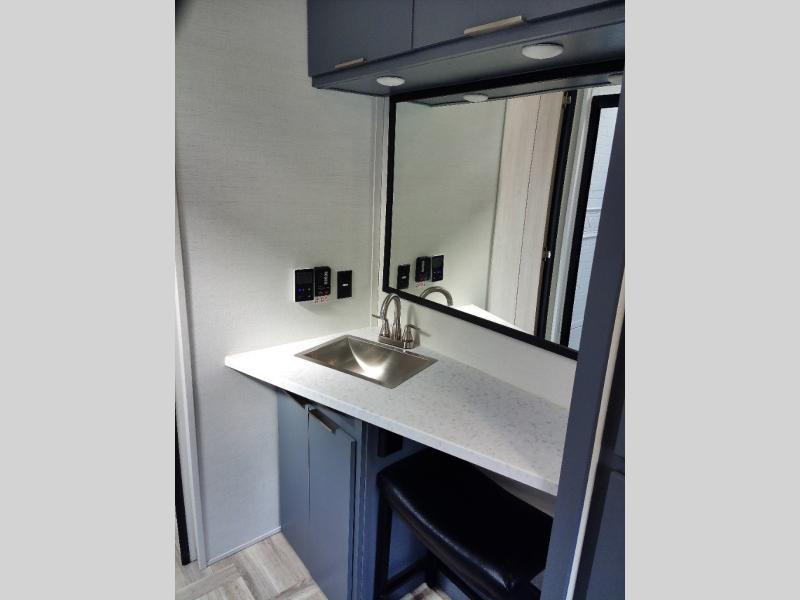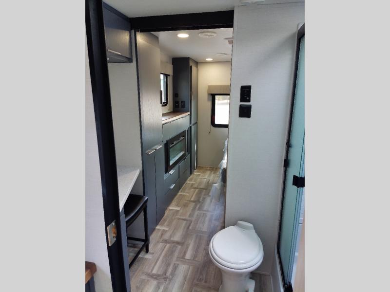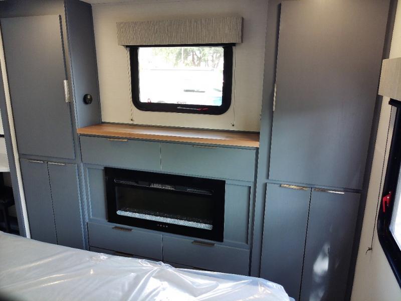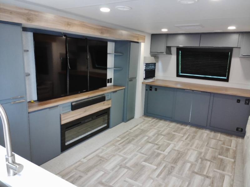 This Lacrosse travel trailer is made for entertaining! The living room is a standout with its unique bar seating at the large front window. This is perfect for eating and drinking, or use it as desk space to work from the road. The sofa sits in its own slide out for extra comfort, and has a great view of the enormous entertainment center with fireplace and 70" TV. A second fireplace warms up the rear bedroom, which also features a king bed slide for maximum floor space. There's a full bath, a well-equipped kitchen, and plenty of storage space. Invite your friends along for a great time!