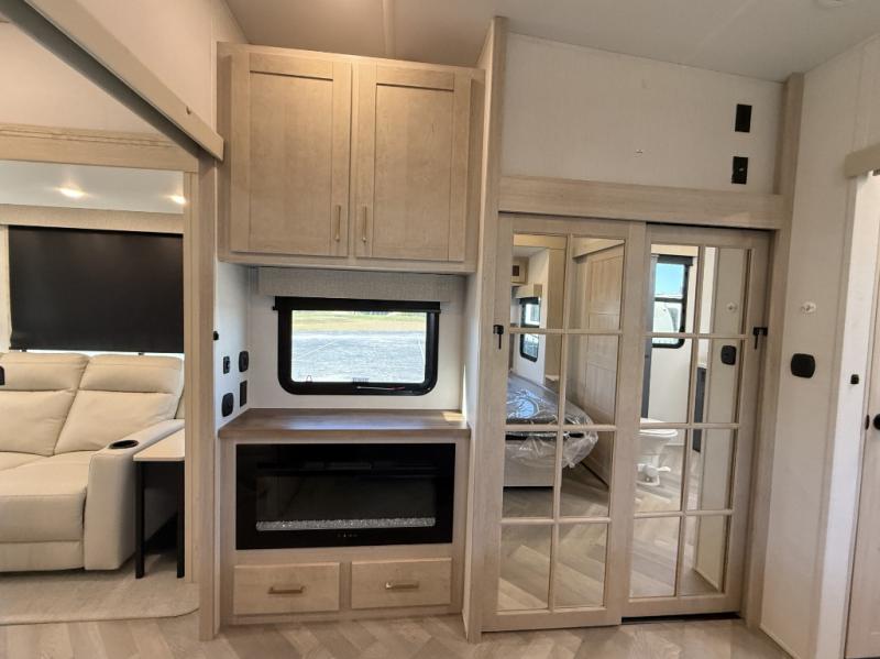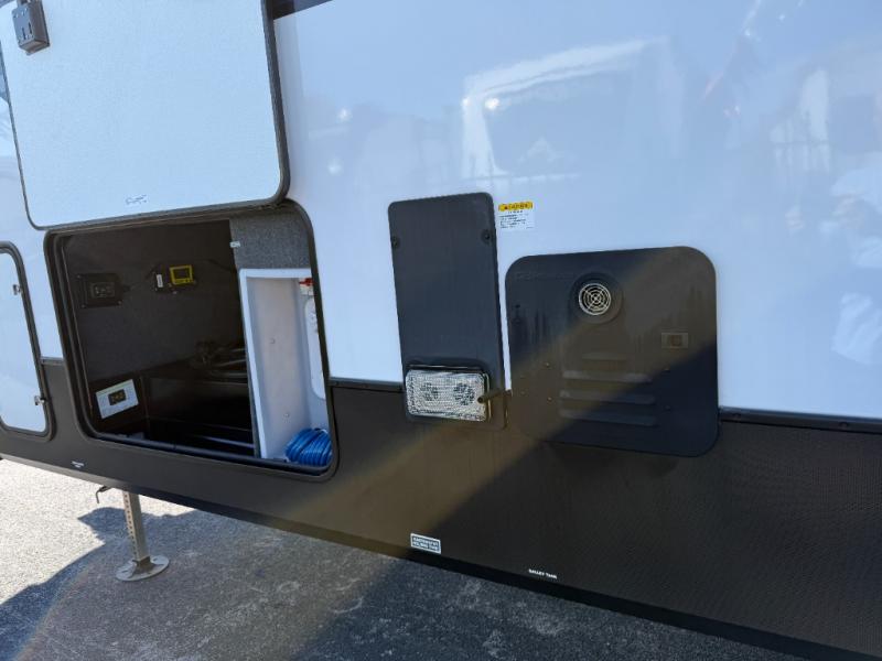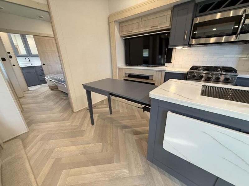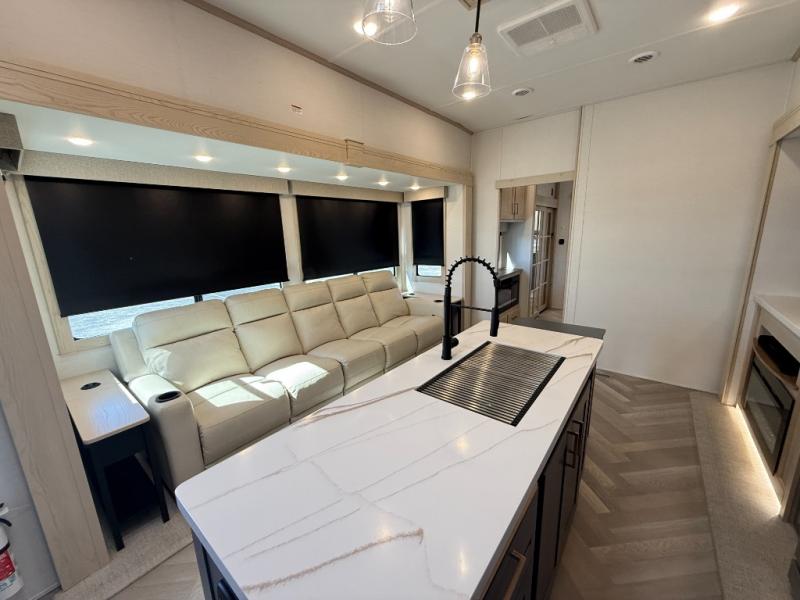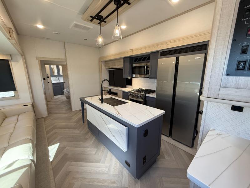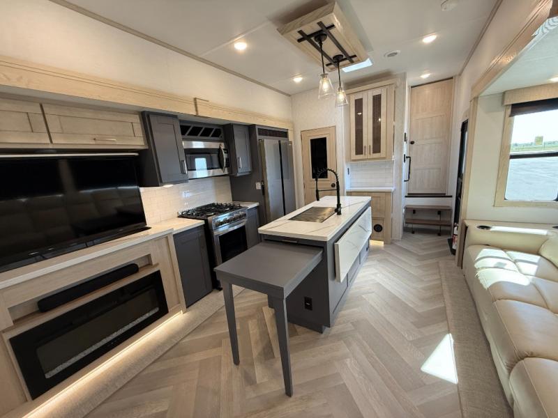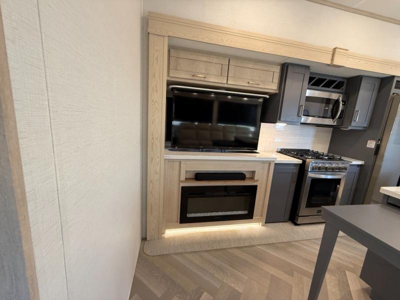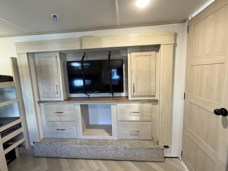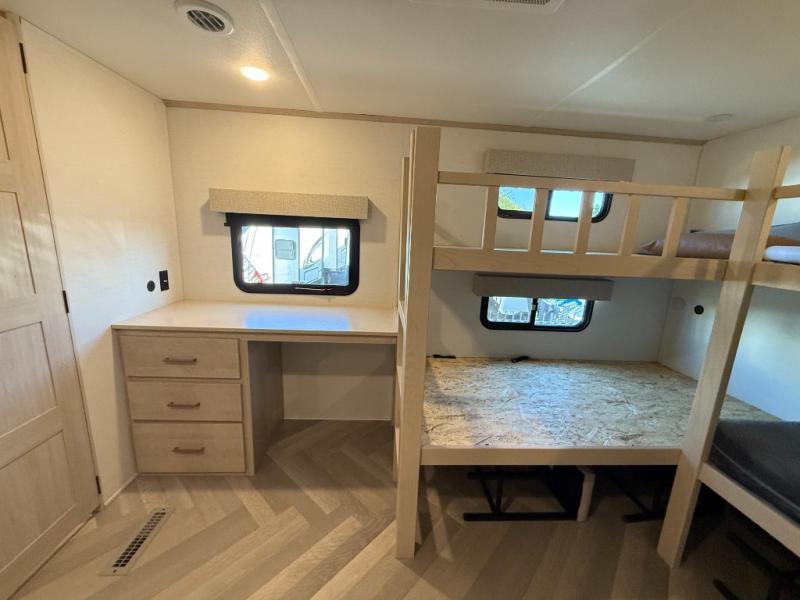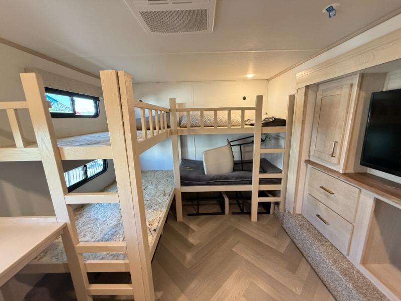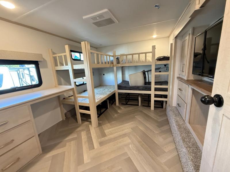 Camping with friends and family just got easier in this spacious fifth wheel that can sleep eight each night. There is a full rear bath, complete with dual bath sinks, a linen closet, plus a second linen closet with washer/dryer prep for added convenience. The half bath is in the front bunkhouse suite, where your guest will also enjoy four bunk beds, a 40" TV, a large wardrobe, plus a desk if they need to get some work done. The combined middle kitchen and living area includes a kitchen island with a flip-up countertop and a hidden dinette the chef of your group is sure to love, plus there is a large pantry for food, a hutch to store nice dishes, and a 16 cu. ft. French door 12V refrigerator for perishables. And everyone will love relaxing on the large sofa across from the pop-up LED Smart TV and fireplace!