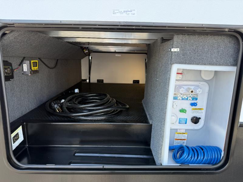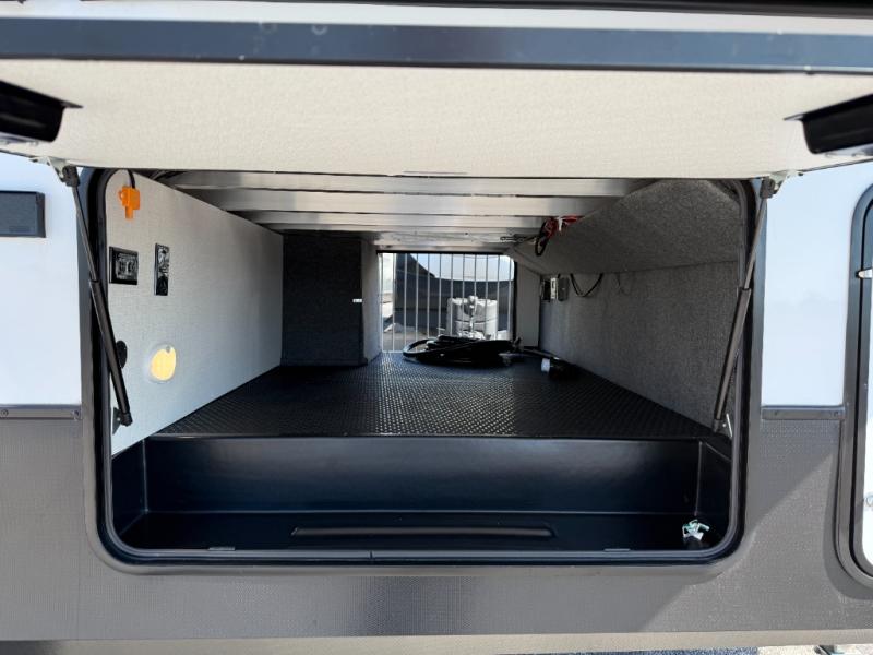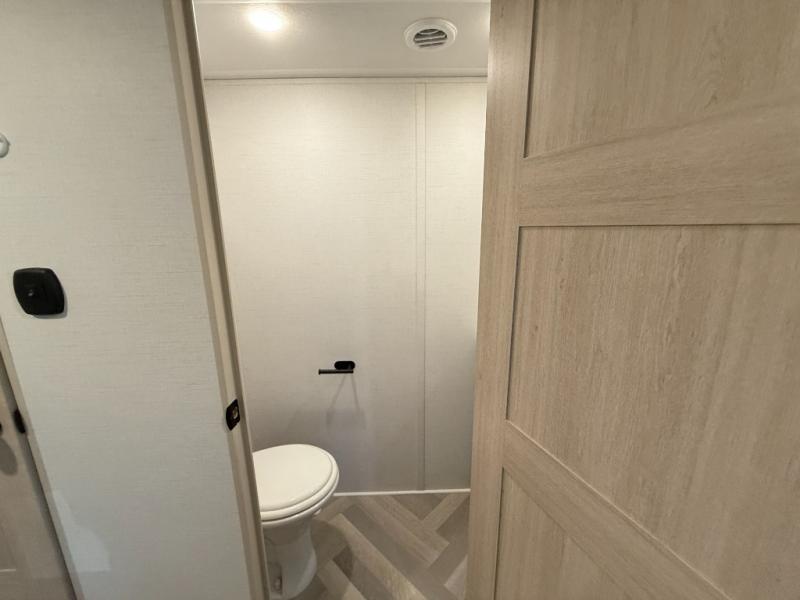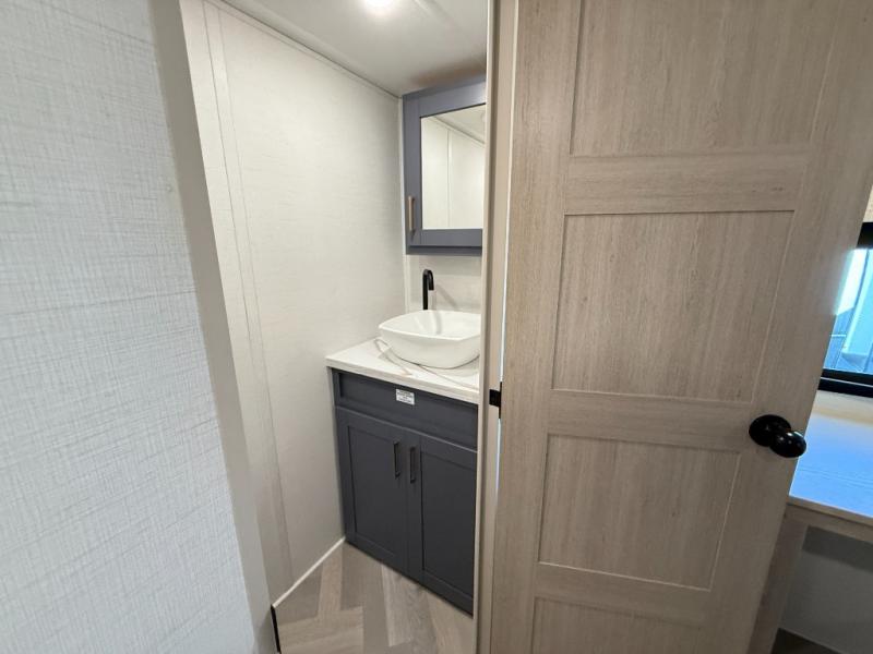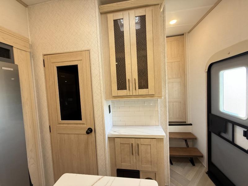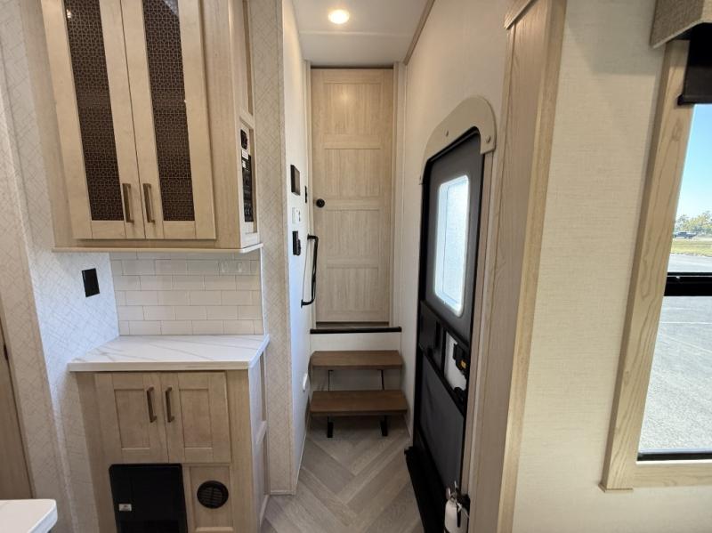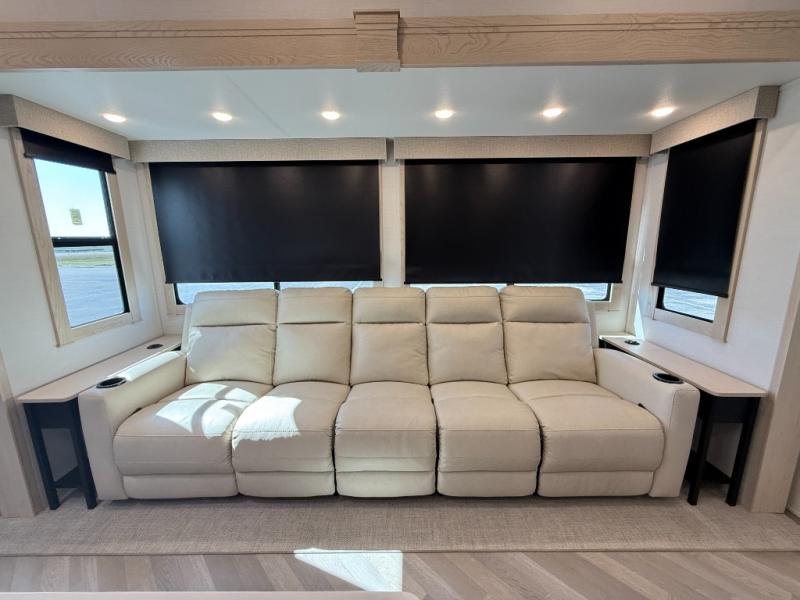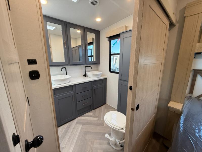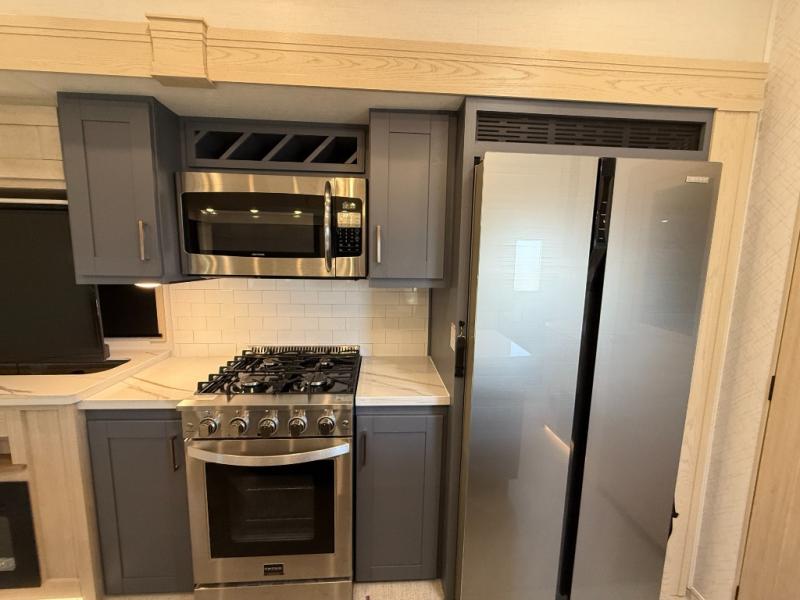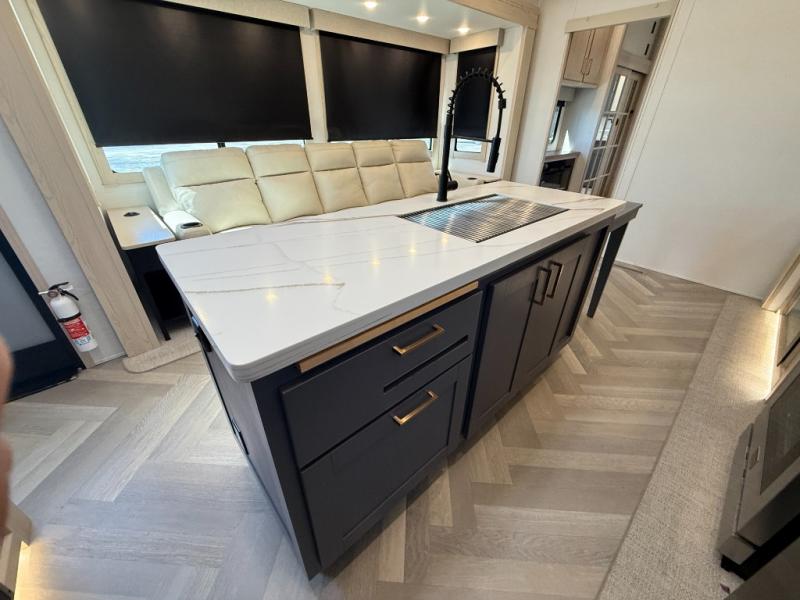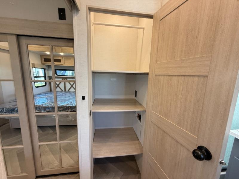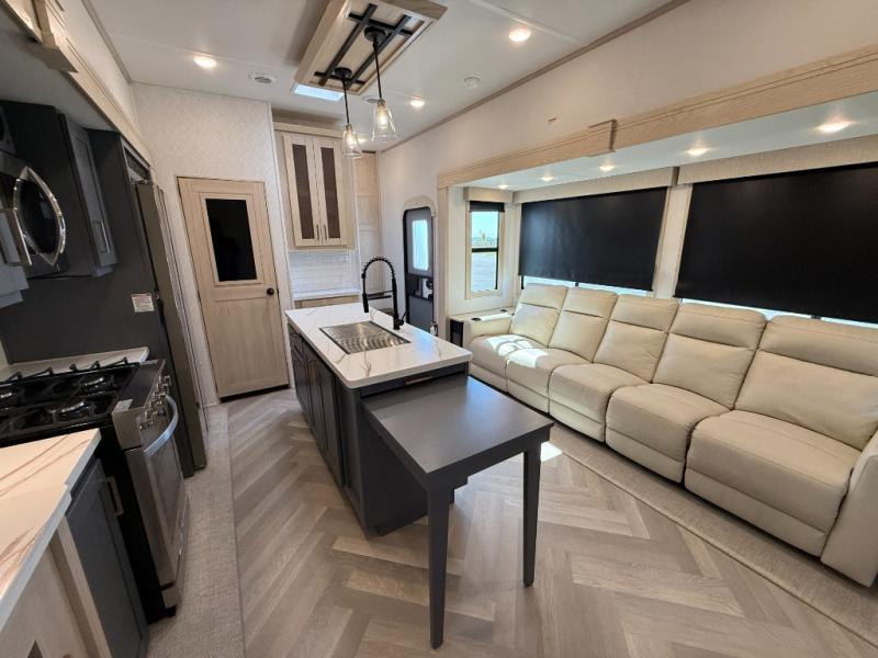 Camping with friends and family just got easier in this spacious fifth wheel that can sleep eight each night. There is a full rear bath, complete with dual bath sinks, a linen closet, plus a second linen closet with washer/dryer prep for added convenience. The half bath is in the front bunkhouse suite, where your guest will also enjoy four bunk beds, a 40" TV, a large wardrobe, plus a desk if they need to get some work done. The combined middle kitchen and living area includes a kitchen island with a flip-up countertop and a hidden dinette the chef of your group is sure to love, plus there is a large pantry for food, a hutch to store nice dishes, and a 16 cu. ft. French door 12V refrigerator for perishables. And everyone will love relaxing on the large sofa across from the pop-up LED Smart TV and fireplace!