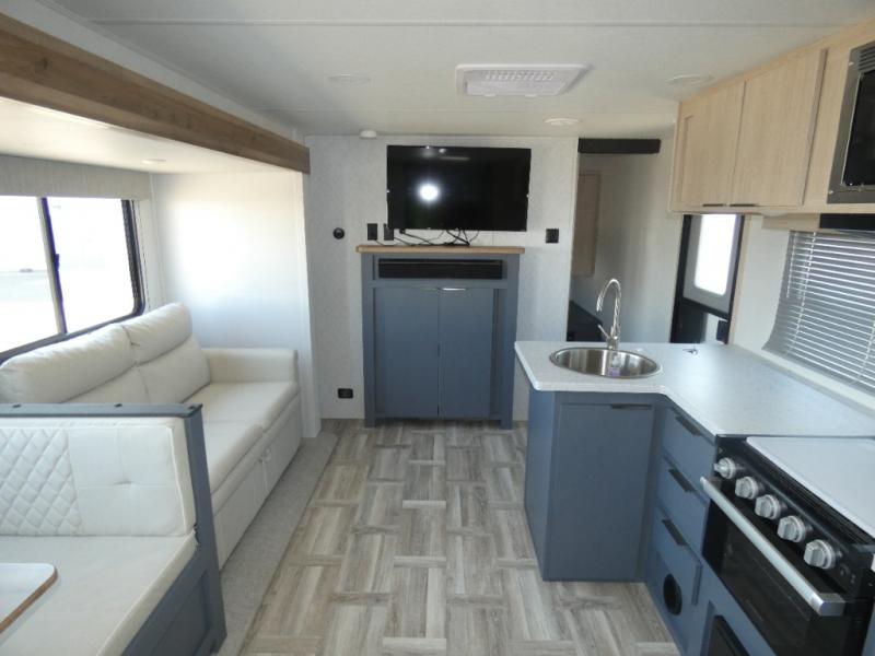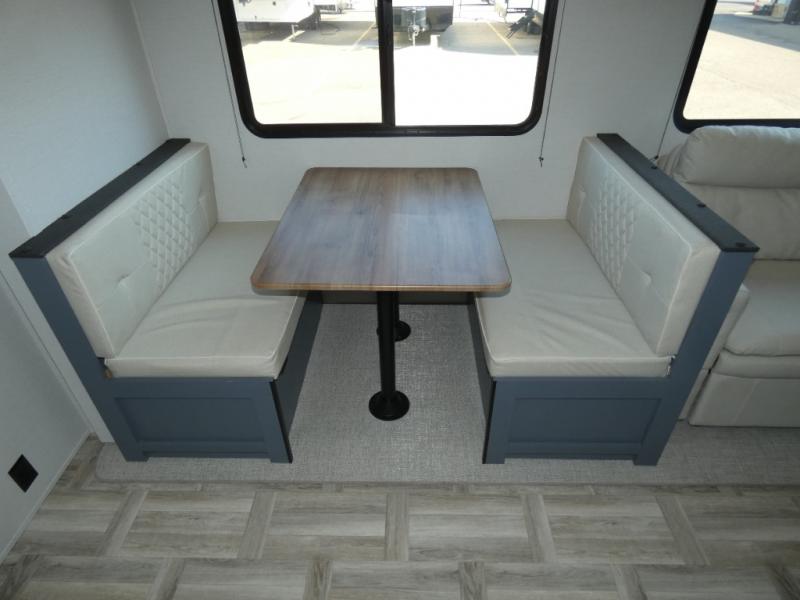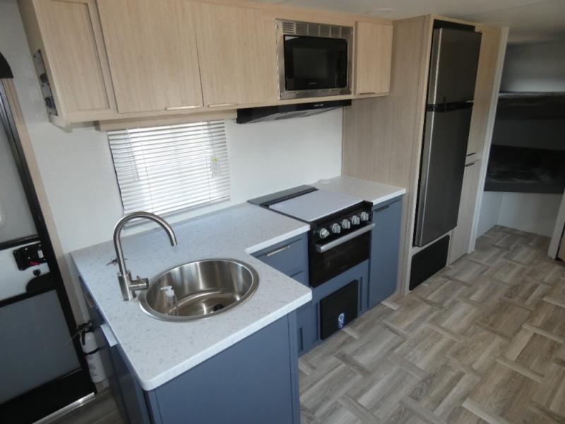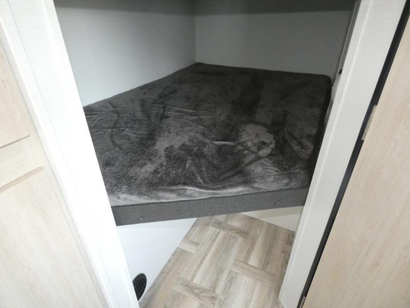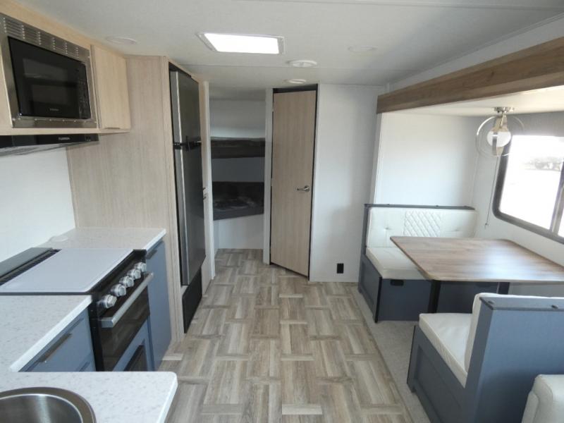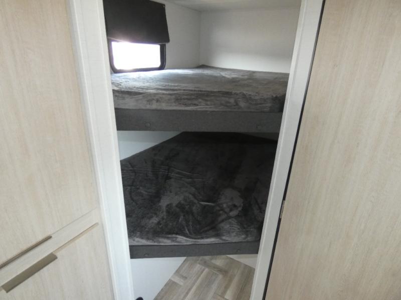 If you are looking for a trailer with double-size bunks and a private bedroom, you have found it! The queen bed and two wardrobes are behind a partial wall for added privacy. The double-size bunks are in the rear corner next to the full bathroom for convenience for the kids or your guests. And the L-shaped counter with a kitchen sink and full amenities sets up the cook nicely to be able to make meals for everyone. And you will love the extra floor space created by the booth dinette and sofa slide out.