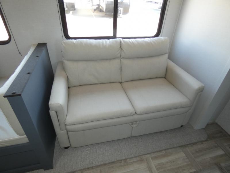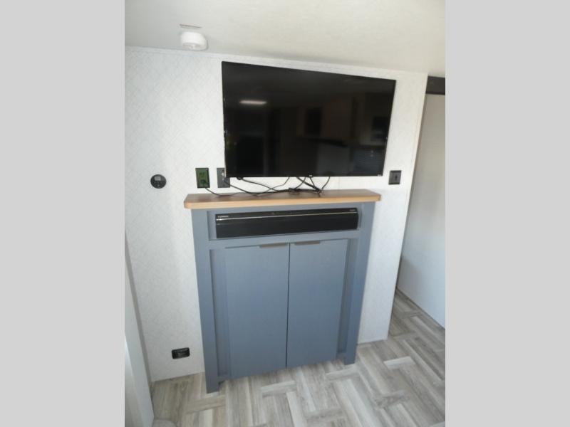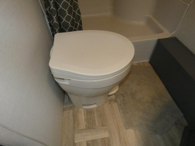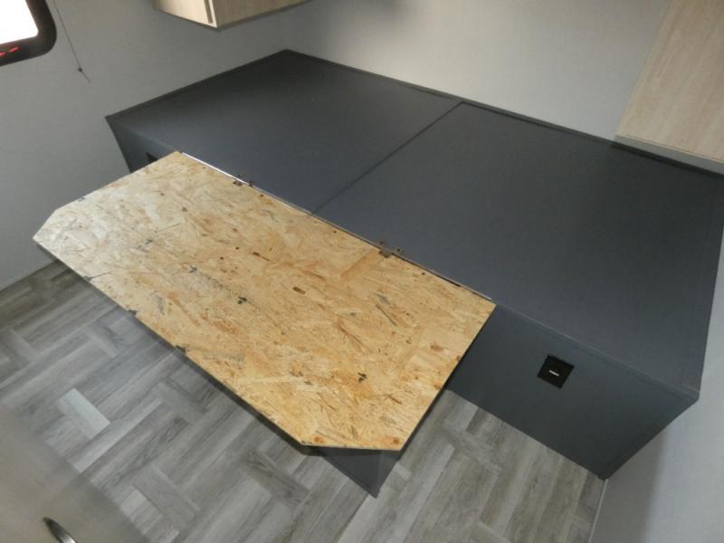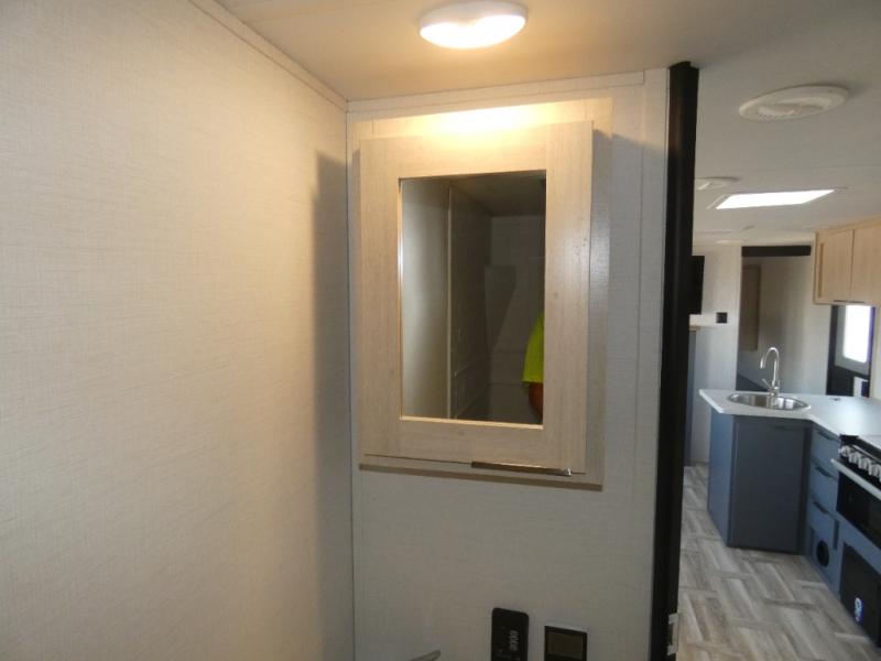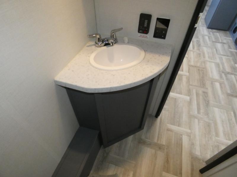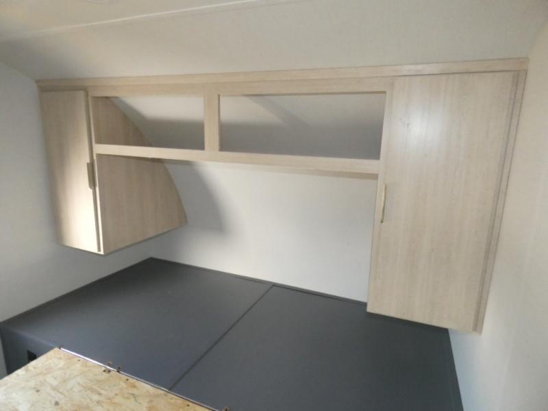 If you are looking for a trailer with double-size bunks and a private bedroom, you have found it! The queen bed and two wardrobes are behind a partial wall for added privacy. The double-size bunks are in the rear corner next to the full bathroom for convenience for the kids or your guests. And the L-shaped counter with a kitchen sink and full amenities sets up the cook nicely to be able to make meals for everyone. And you will love the extra floor space created by the booth dinette and sofa slide out.