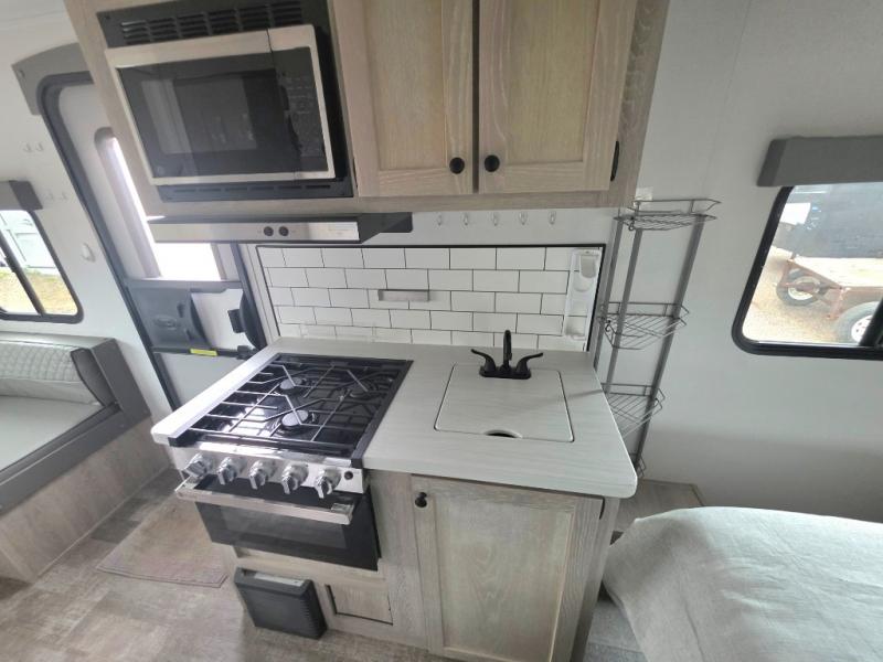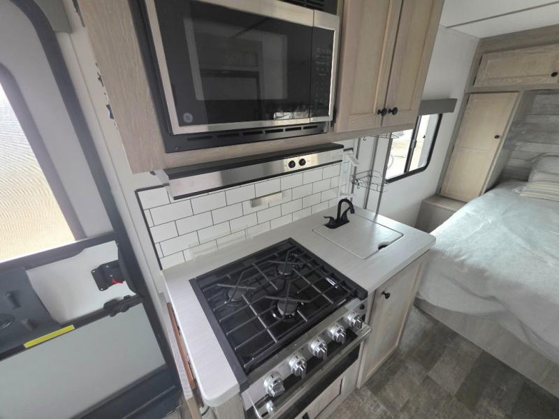 The Riverside Xplorer 179X is a lightweight travel trailer known for its full bath and kitchen amenities, including a Three-burner cooktop, refrigerator, and overhead cabinets. It features a single axle, a power awning, and can sleep up to four people.