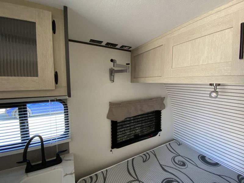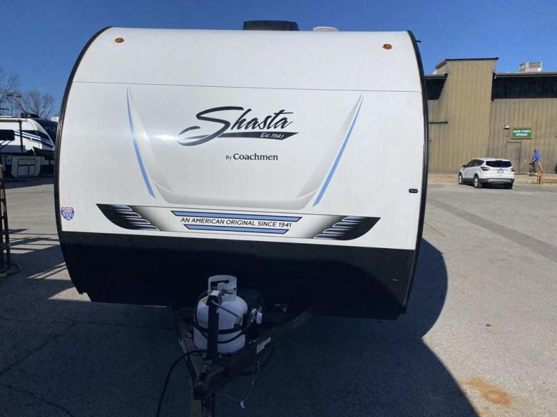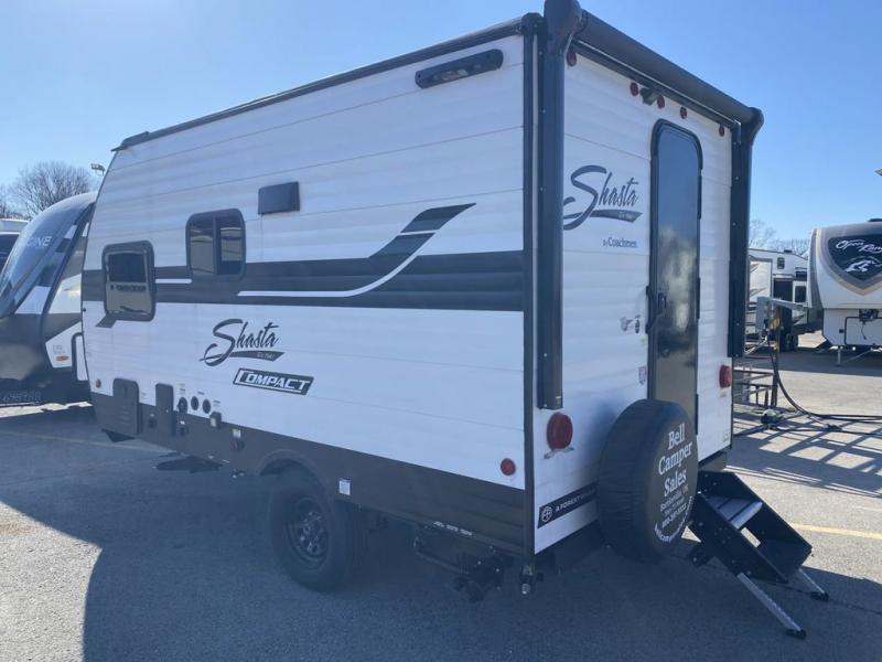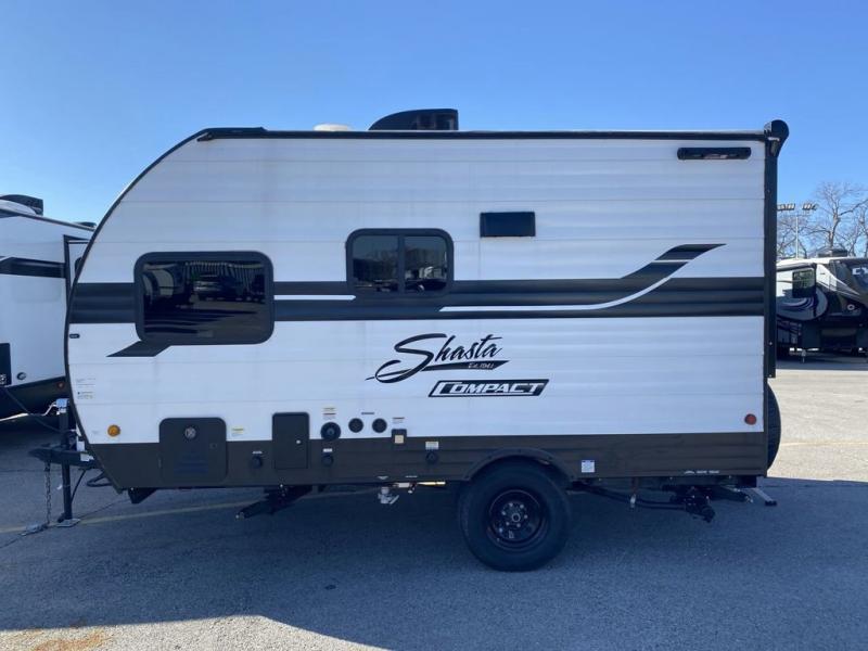 With any Compact travel trailer by Shasta RVs, you will enjoy the camping lifestyle in an easy-to-tow, lightweight unit! Each model includes four stabilizer jacks to keep your travel trailer secure at the campground, and an optional power tongue jack can be added for more convenience. You will appreciate having a tankless water heater for endless hot showers, an 8K BTU A/C to keep you cool, plus solar and back-up camera prep. The interior of each Compact travel trailer includes seamless countertops, kitchen and bath amenities, a Bluetooth portable speaker, plus storage space for all your belongings.
