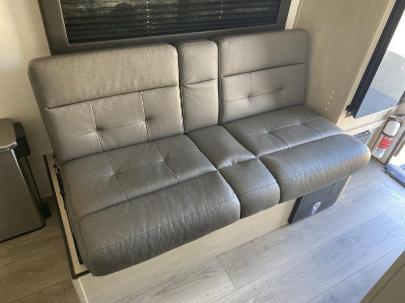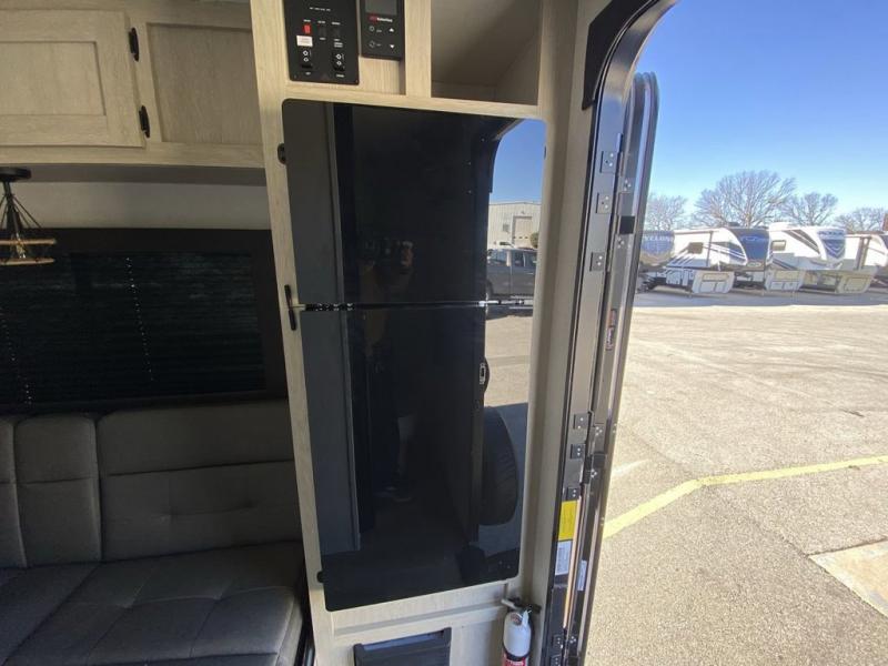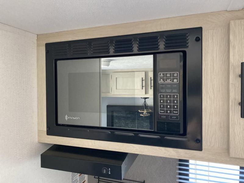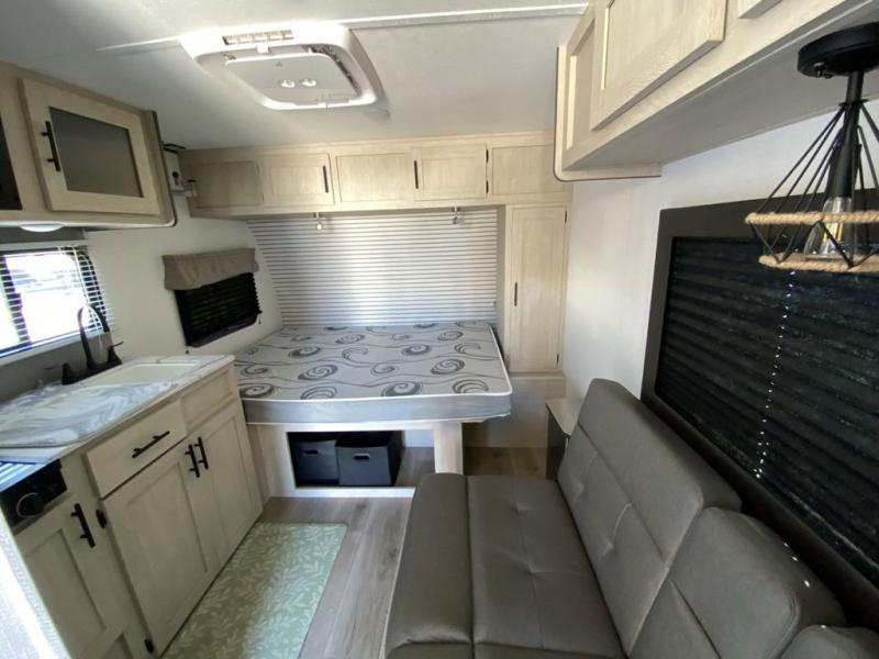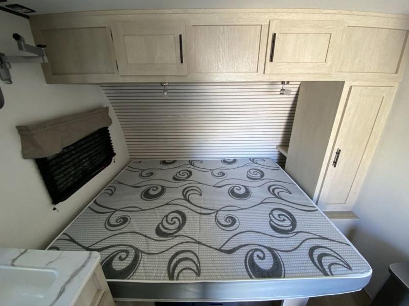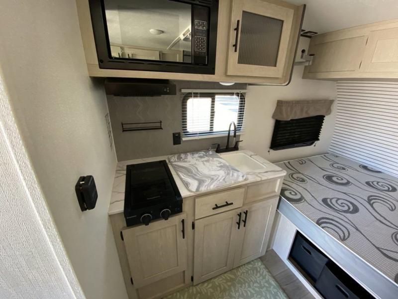 This trailer is perfect for couples or weekend trips to the lake with your buddy. There is a front queen bed with an overhead cabinet, a wardrobe, plus a bed shelf to keep valuables close by, and the sofa will provide seating and sleeping space for guests. There is a private bathroom with a toilet and a shower so you won't have to use the camp's facilities in the middle of the night. You will love having a two burner cooktop and microwave oven to cook meals each day, plus there is a 4.5 cu. ft. refrigerator for cold items!
