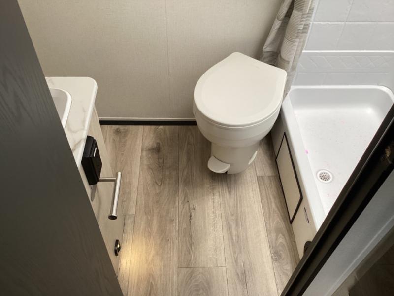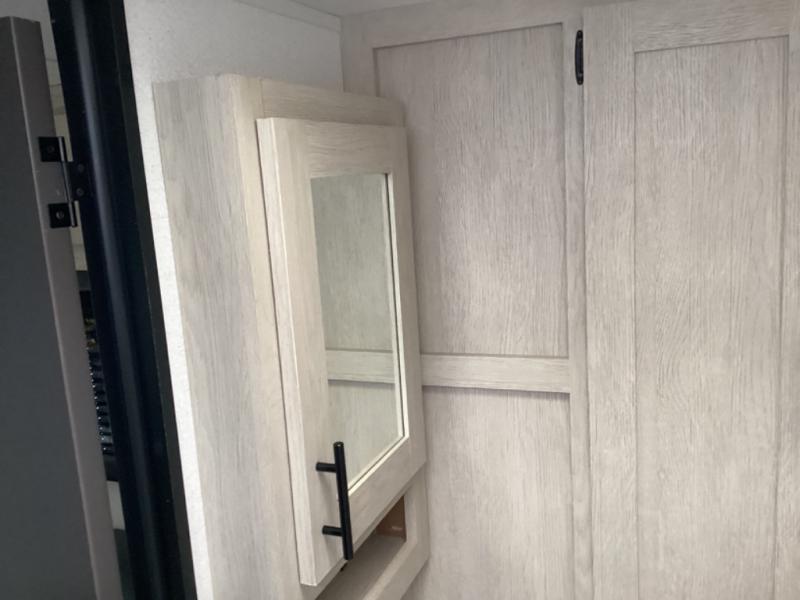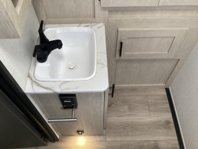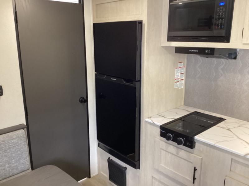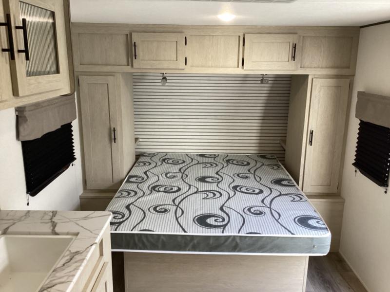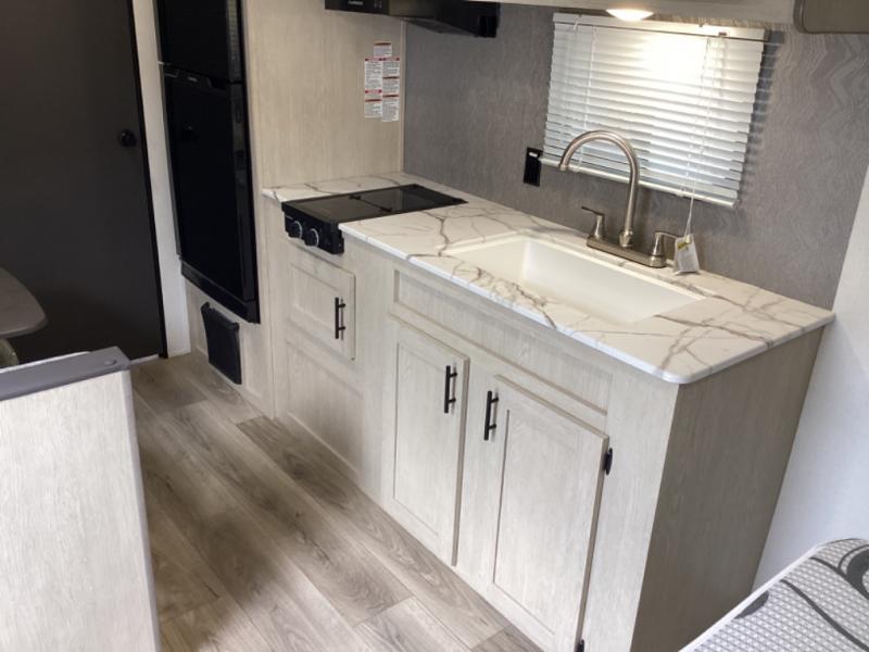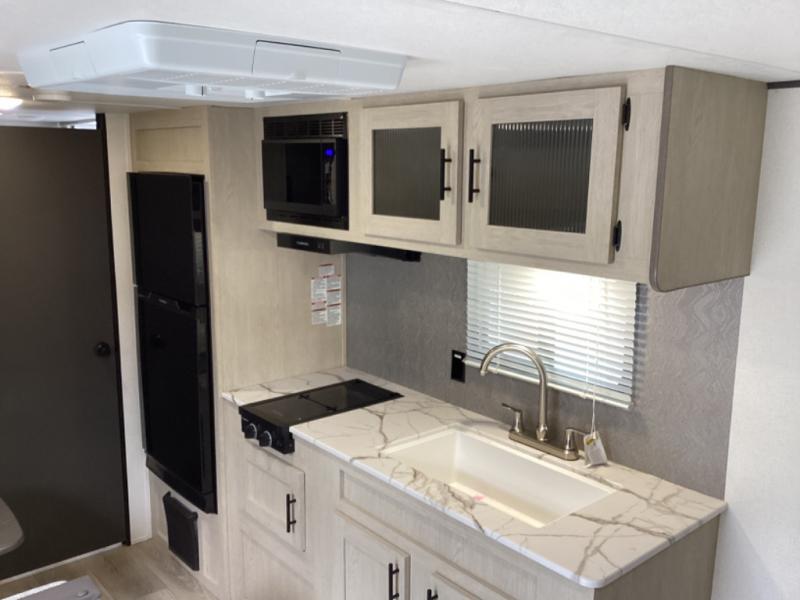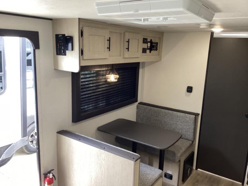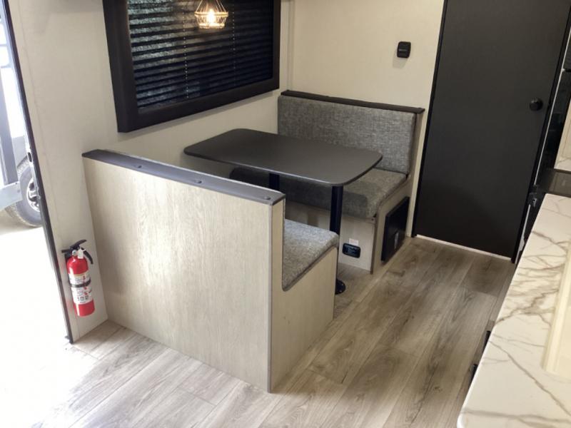 This travel trailer will feel just like home since there is a front bedroom with an RV queen bed, dual wardrobes to keep your clothes tidy, plus a spacious full rear bath. There is a 24" x 40 shower pan here, plus a medicine cabinet and a spacious bath linen closet to keep clean towels close by. Head to the kitchen to prepare lunch on the two burner cooktop or use the microwave cabinet to heat up leftovers. There is a booth dinette where you can dine together and even let an overnight guests or two littles ones sleep on!