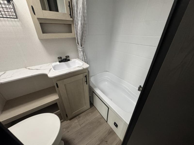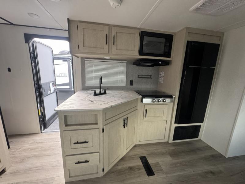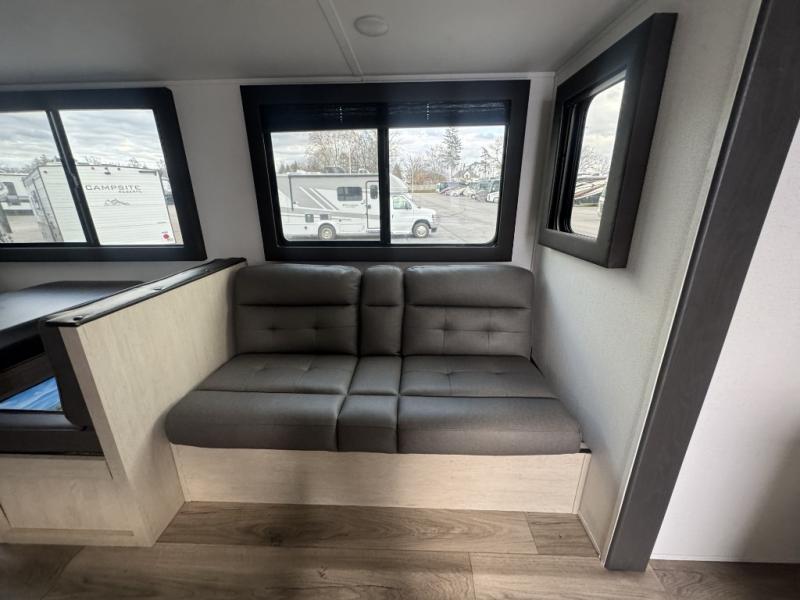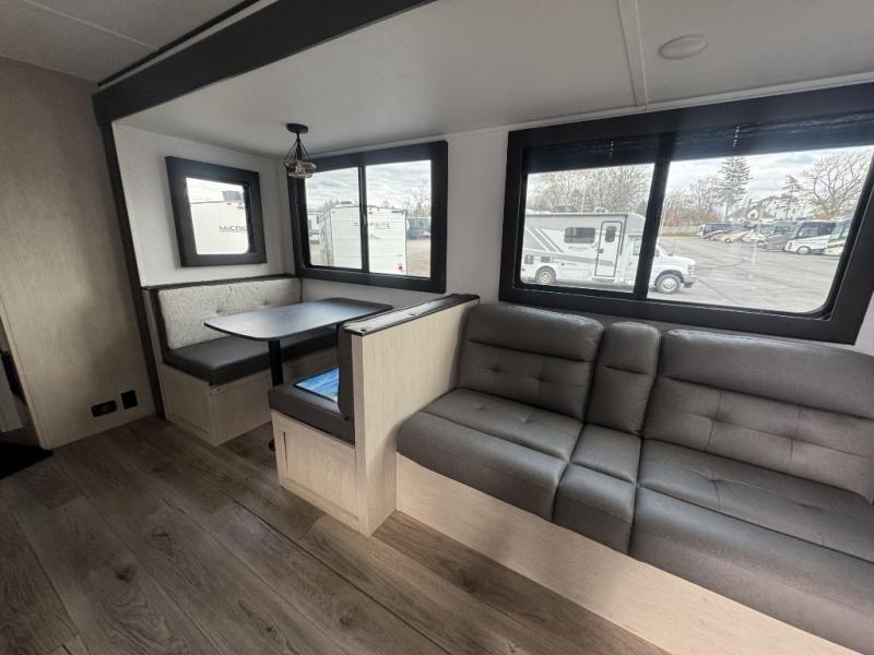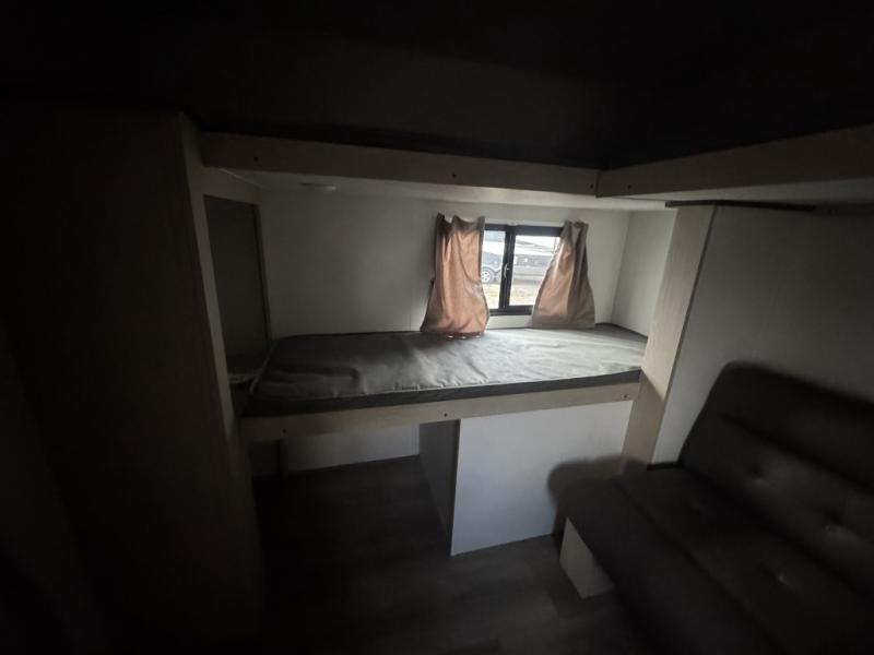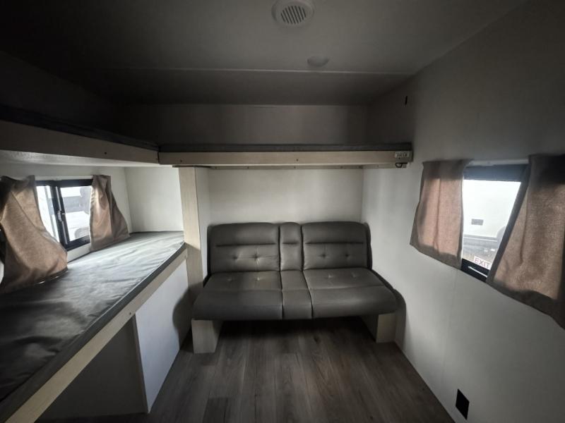 The little ones or your guests will love the bunkhouse in this spacious trailer. There area a set of 26" x 74" bunks, along with a flip-up bunk above a sofa they can sleep and relax. You'll find your own space in the front bedroom that includes a walk-around queen bed and dual wardrobes. Everyone can meet in the middle living area and kitchen to dine around the booth dinette or relax on the sofa. The chef will be able to create delicious meals each day on the three burner cooktop, and there is a residential style refrigerator for perishables. And the mid-coach full bath is sure to come in handy after a day of swimming or hiking!