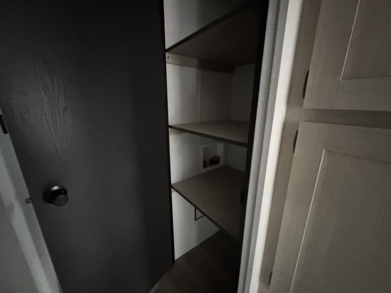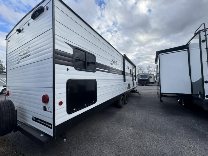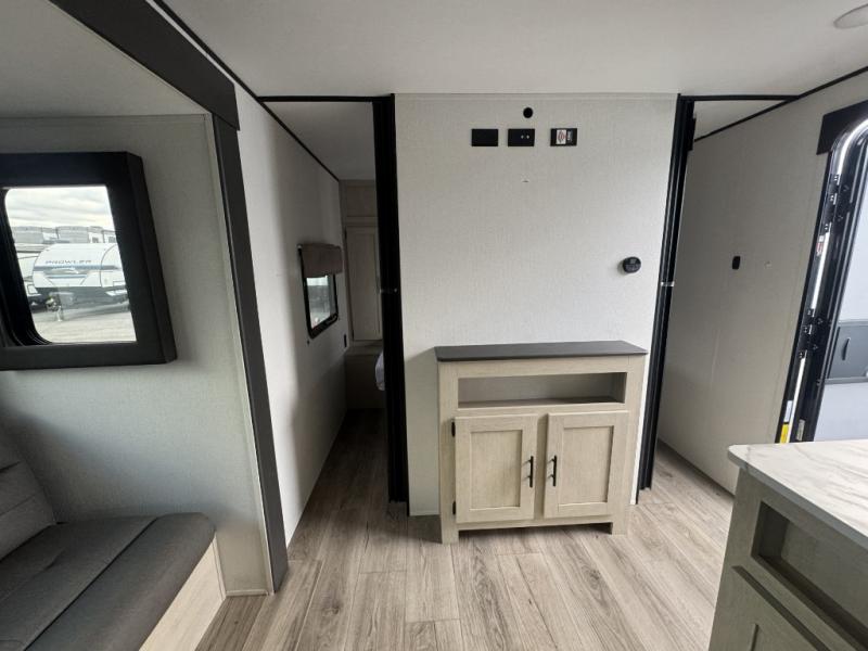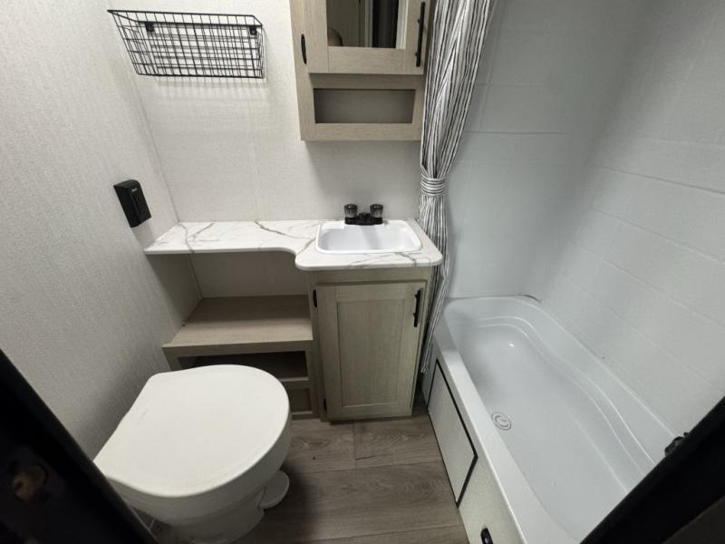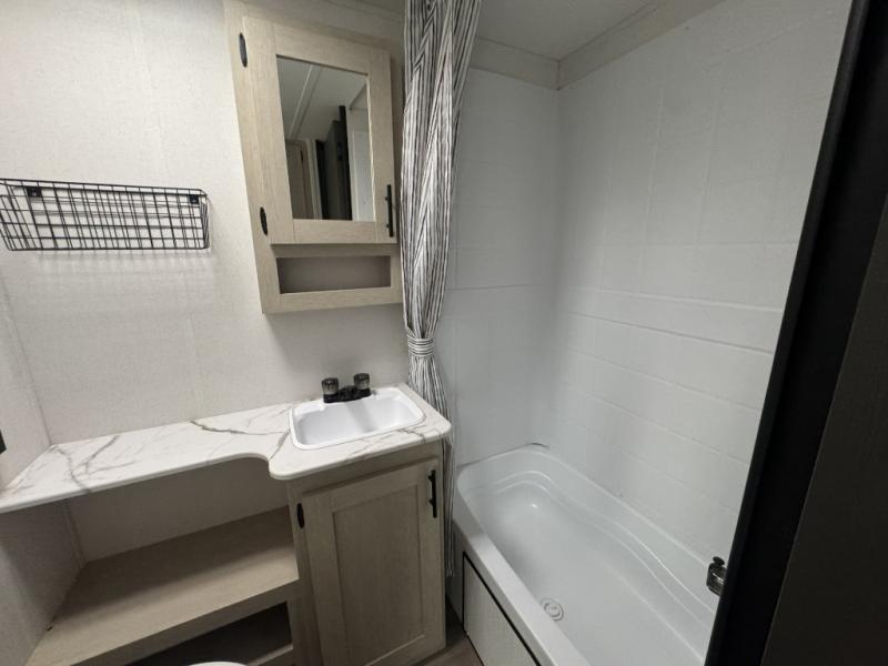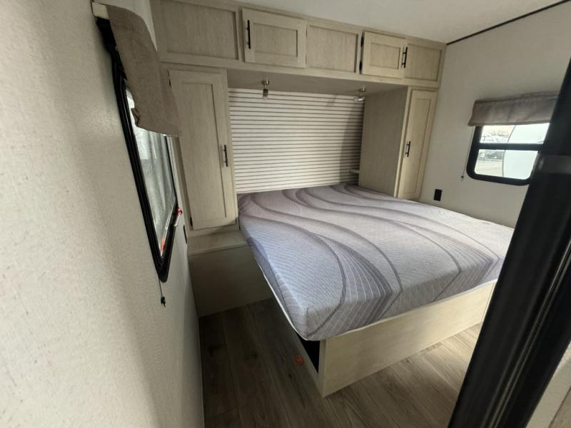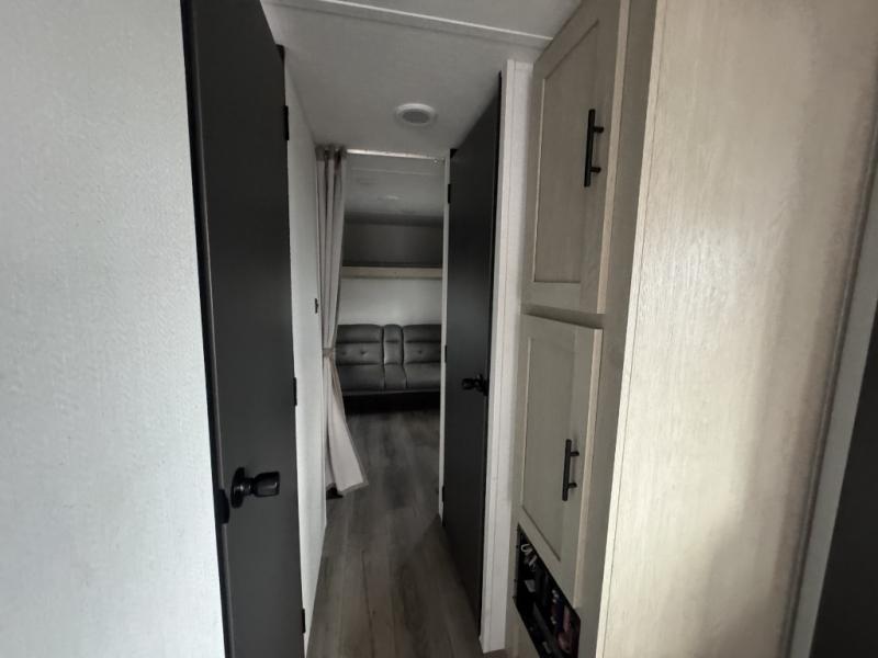 The little ones or your guests will love the bunkhouse in this spacious trailer. There area a set of 26" x 74" bunks, along with a flip-up bunk above a sofa they can sleep and relax. You'll find your own space in the front bedroom that includes a walk-around queen bed and dual wardrobes. Everyone can meet in the middle living area and kitchen to dine around the booth dinette or relax on the sofa. The chef will be able to create delicious meals each day on the three burner cooktop, and there is a residential style refrigerator for perishables. And the mid-coach full bath is sure to come in handy after a day of swimming or hiking!